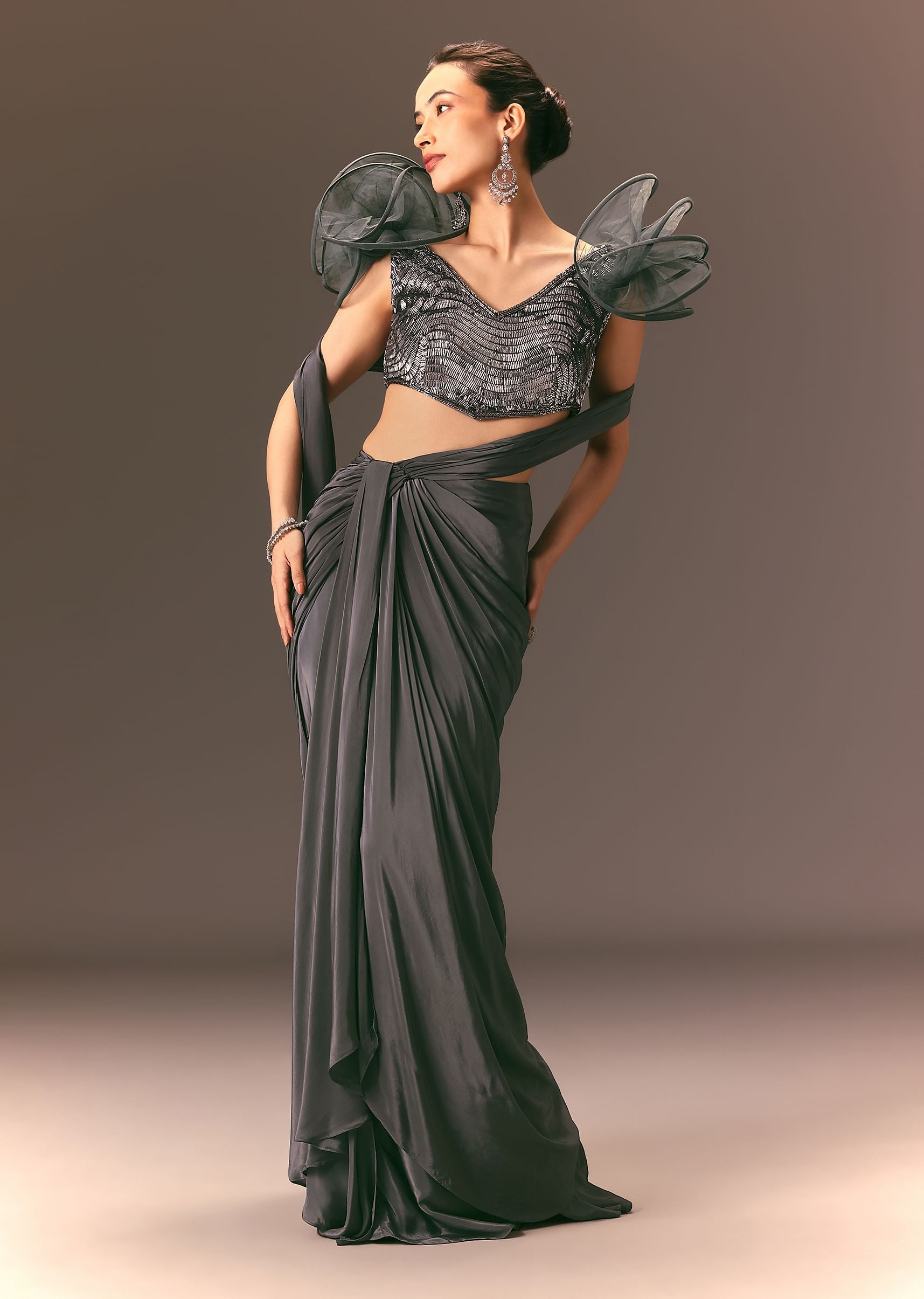 Set on a decadent metallic grey hue this showstopper predraped saree will ensure you stand out at every occassion. The blouse showcases a classic Vneckline and 3D circular ruffle detail on the shoulder that adds to its grandeur appeal. Ideal for festive occasions cocktail parties weddings and special celebrations this ensemble showcases your fashionforward style in all its glory. Awarded as the Most Trusted Brand, we're delivering styles you love, just as promised.
