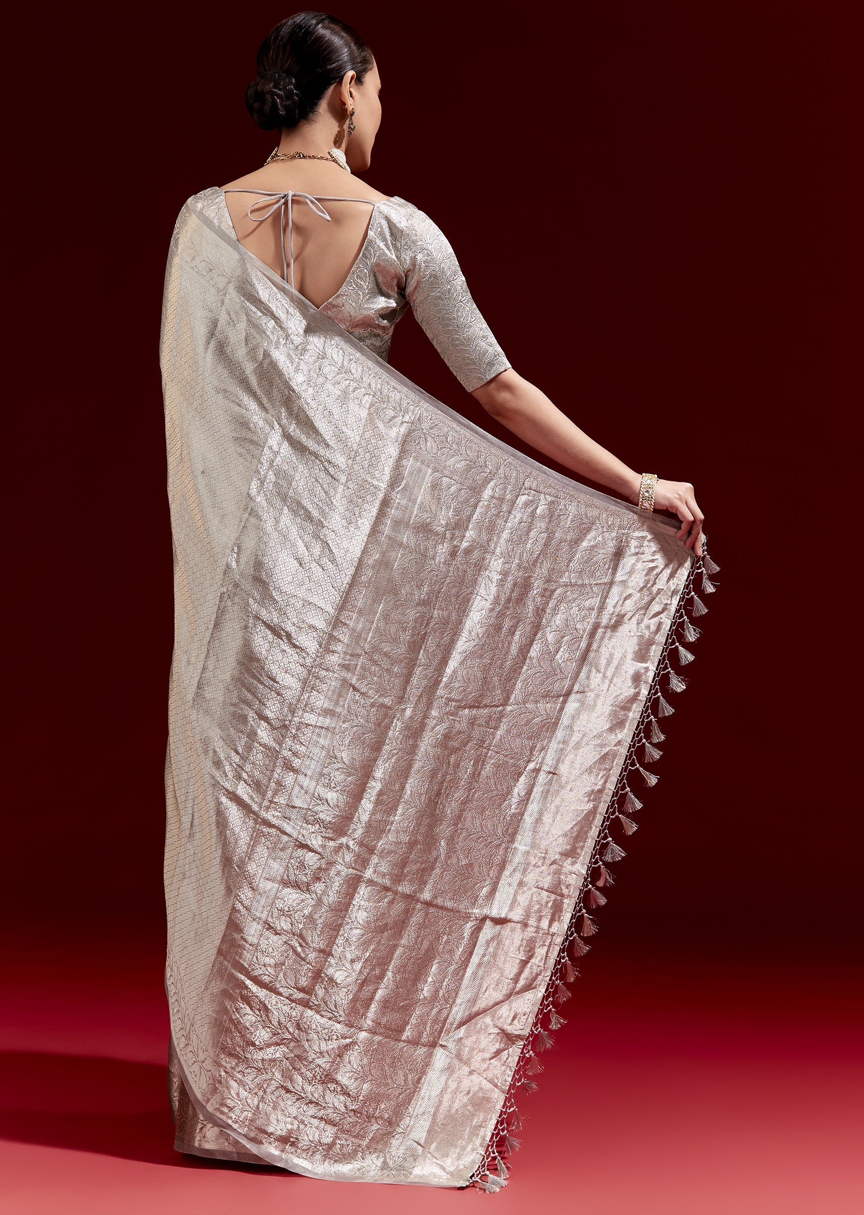 A metallic silver-grey Banarasi tissue saree woven in chanderi zari with a micro geometric texture all over. Finished with a floral woven border and paired with chanderi woven blouse fabric—perfect for festive and reception occasions. Awarded as the Most Trusted Brand, we're delivering styles you love, just as promised.