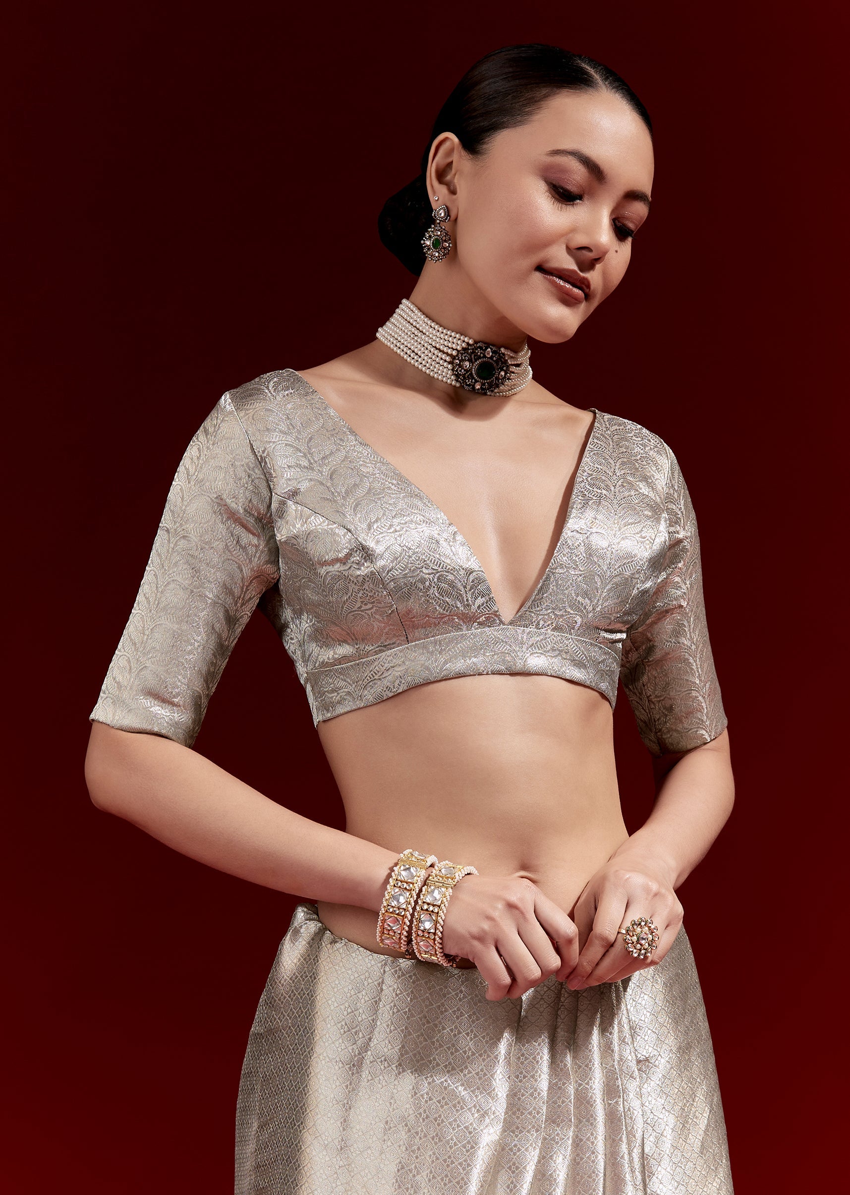 Fit Tips:Iron pleats lightly and pin the pallu so the metallic texture stays smooth.