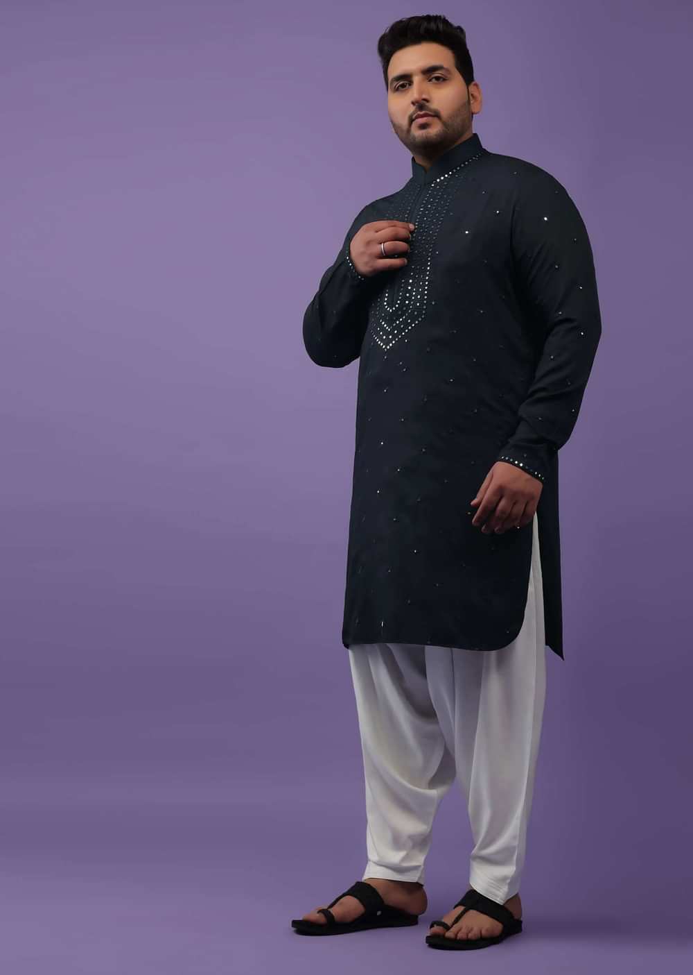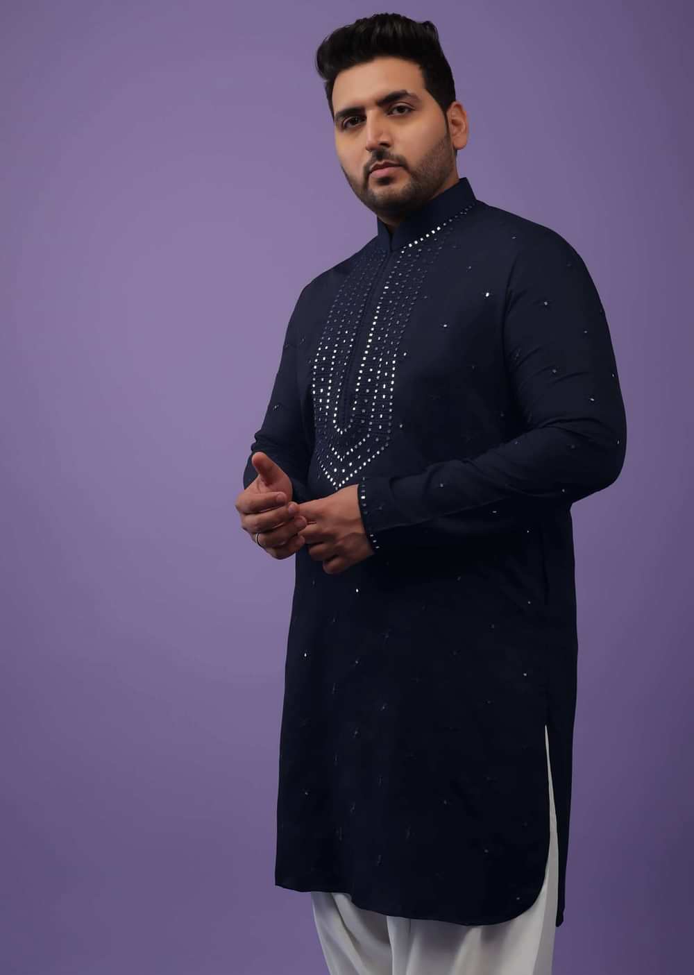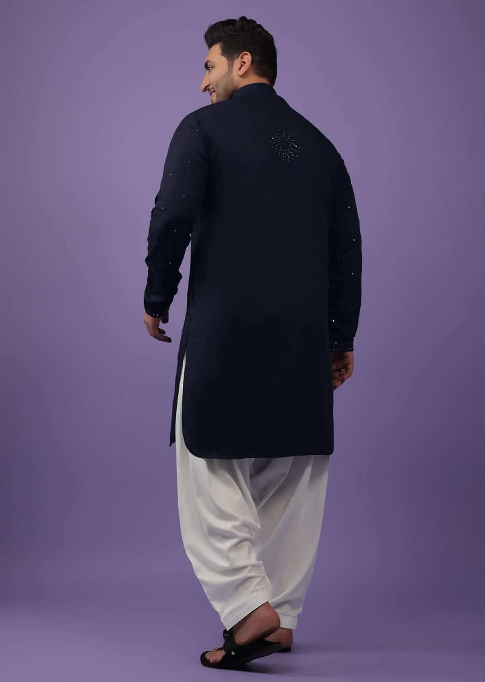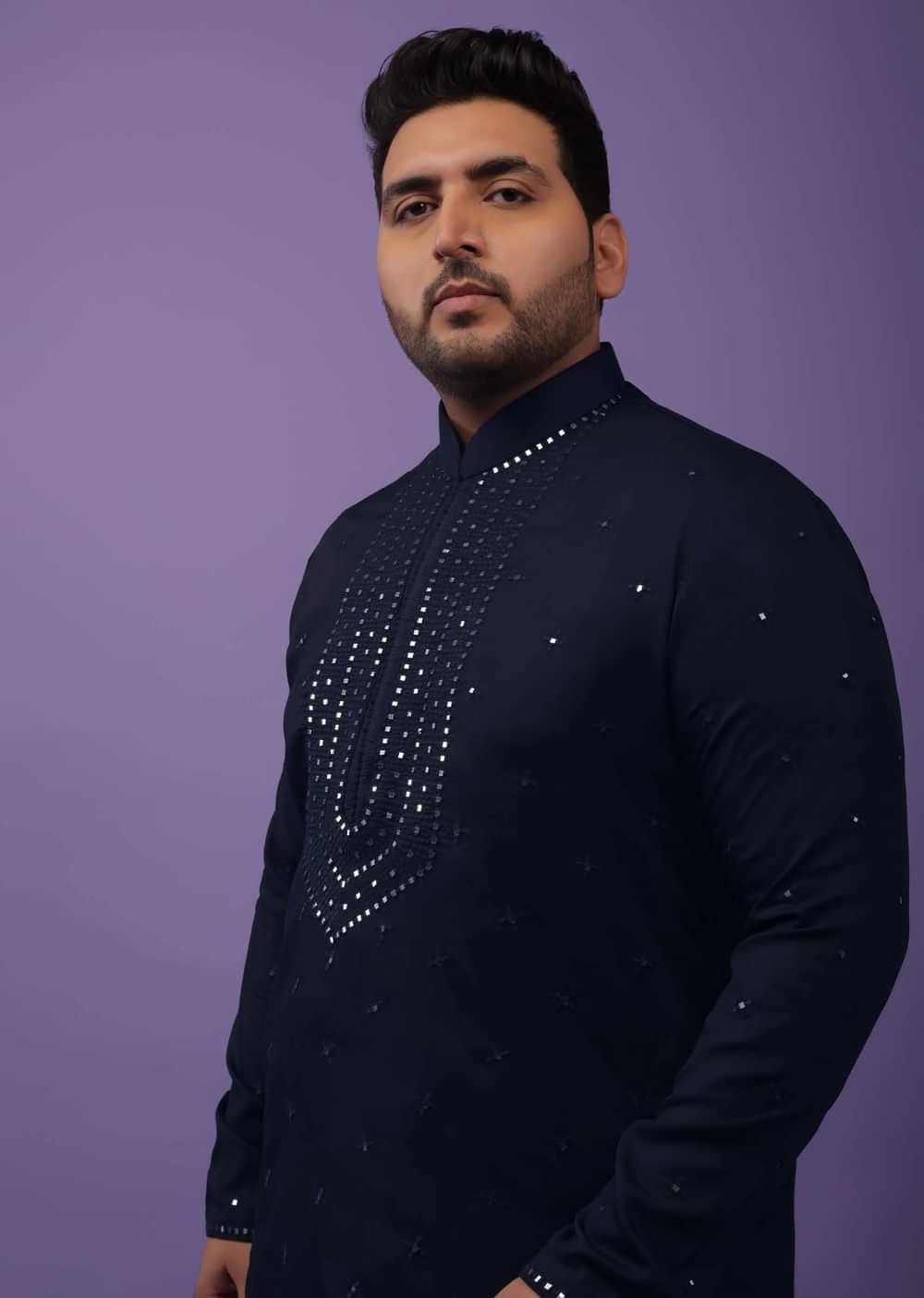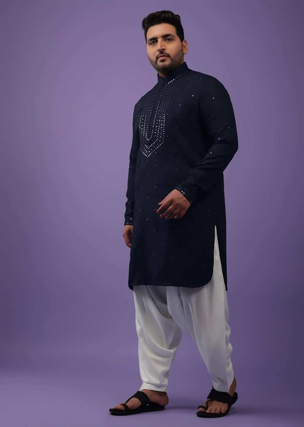 - Midnight blue pathani suit in cotton with mirror and thread embroidered buttis and heavy placket design.