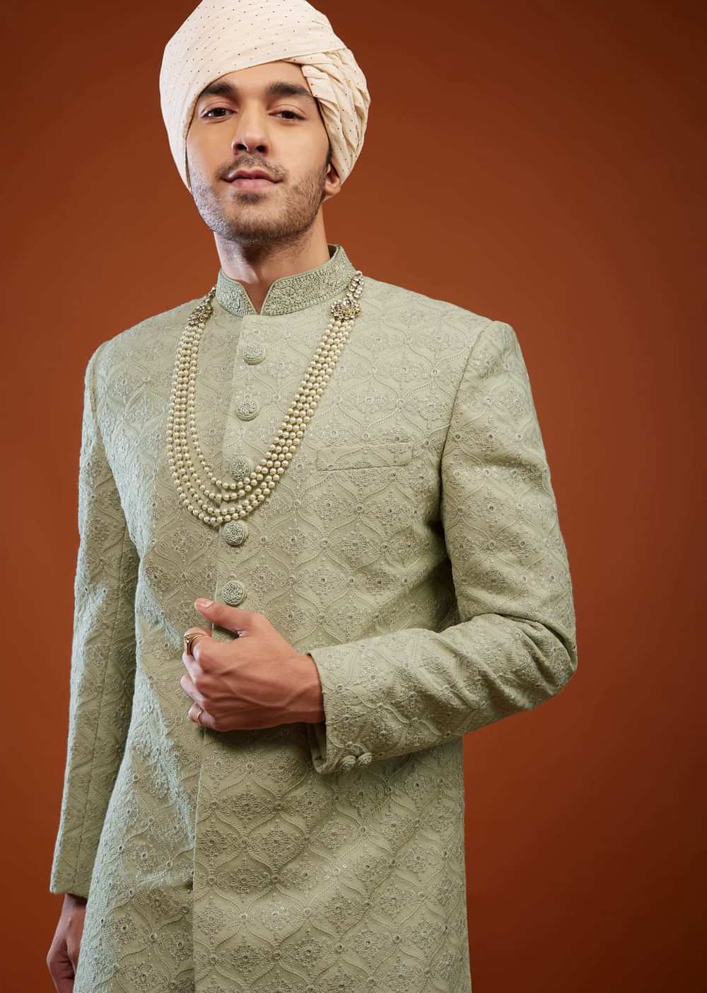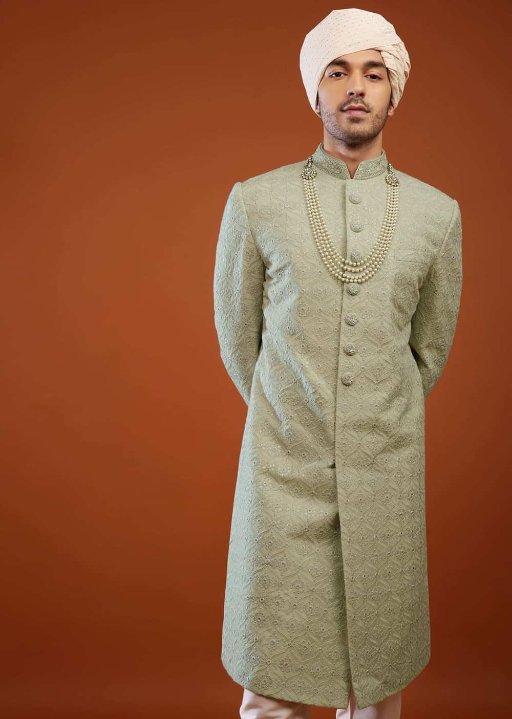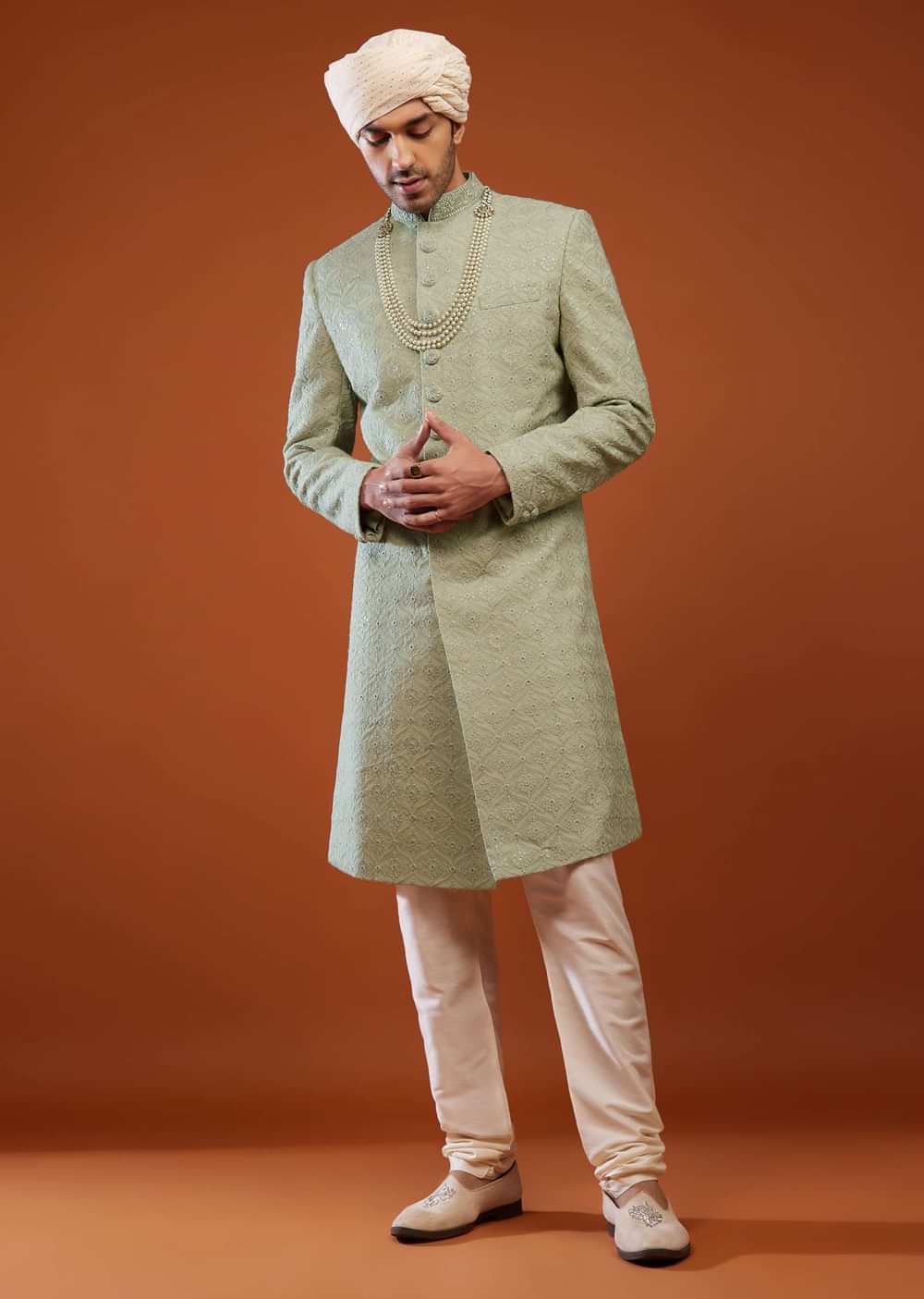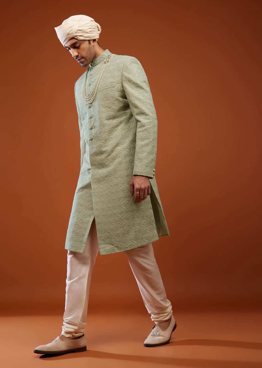 - Stunning Milky Green Sherwani Set tailored in georgette.