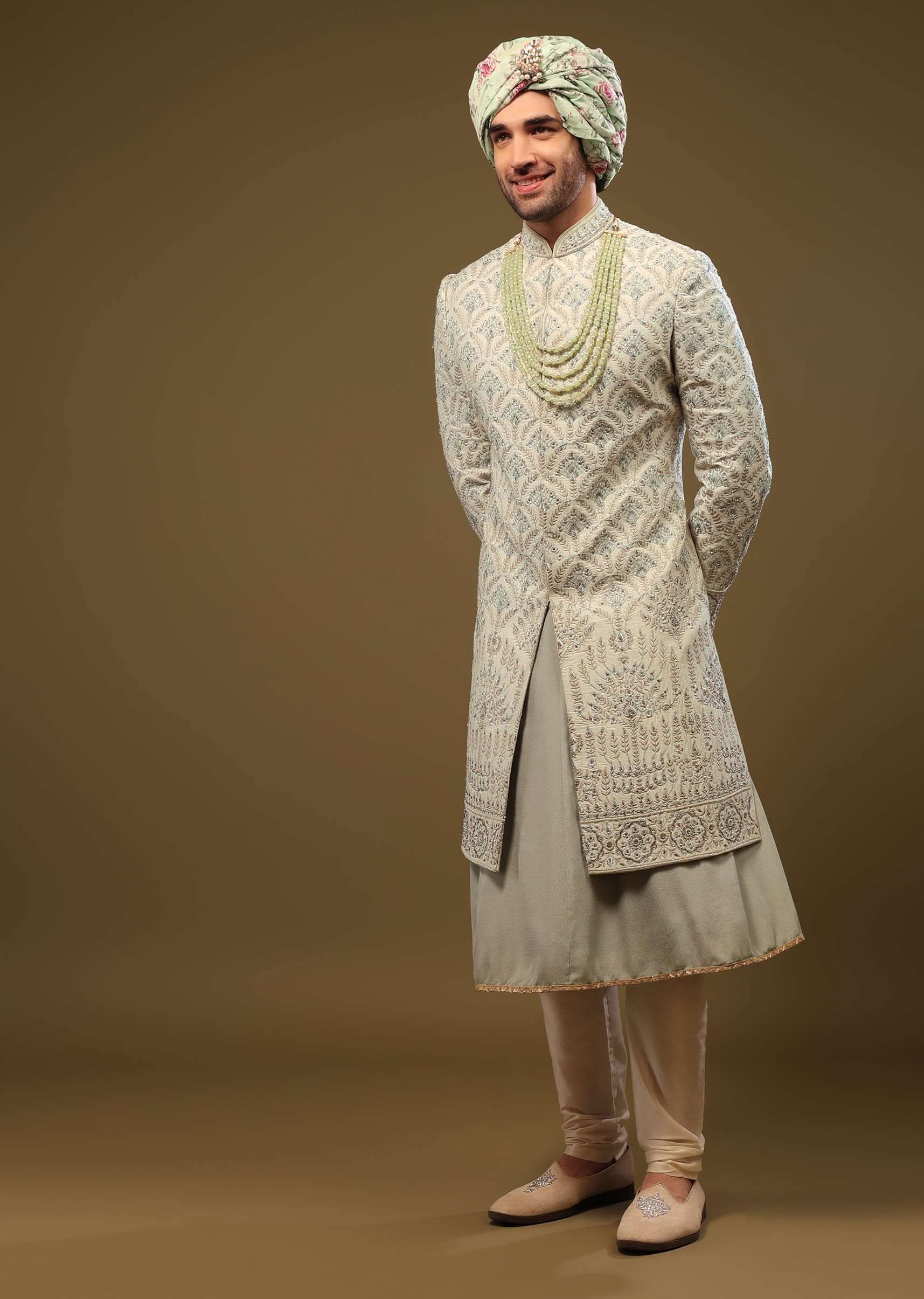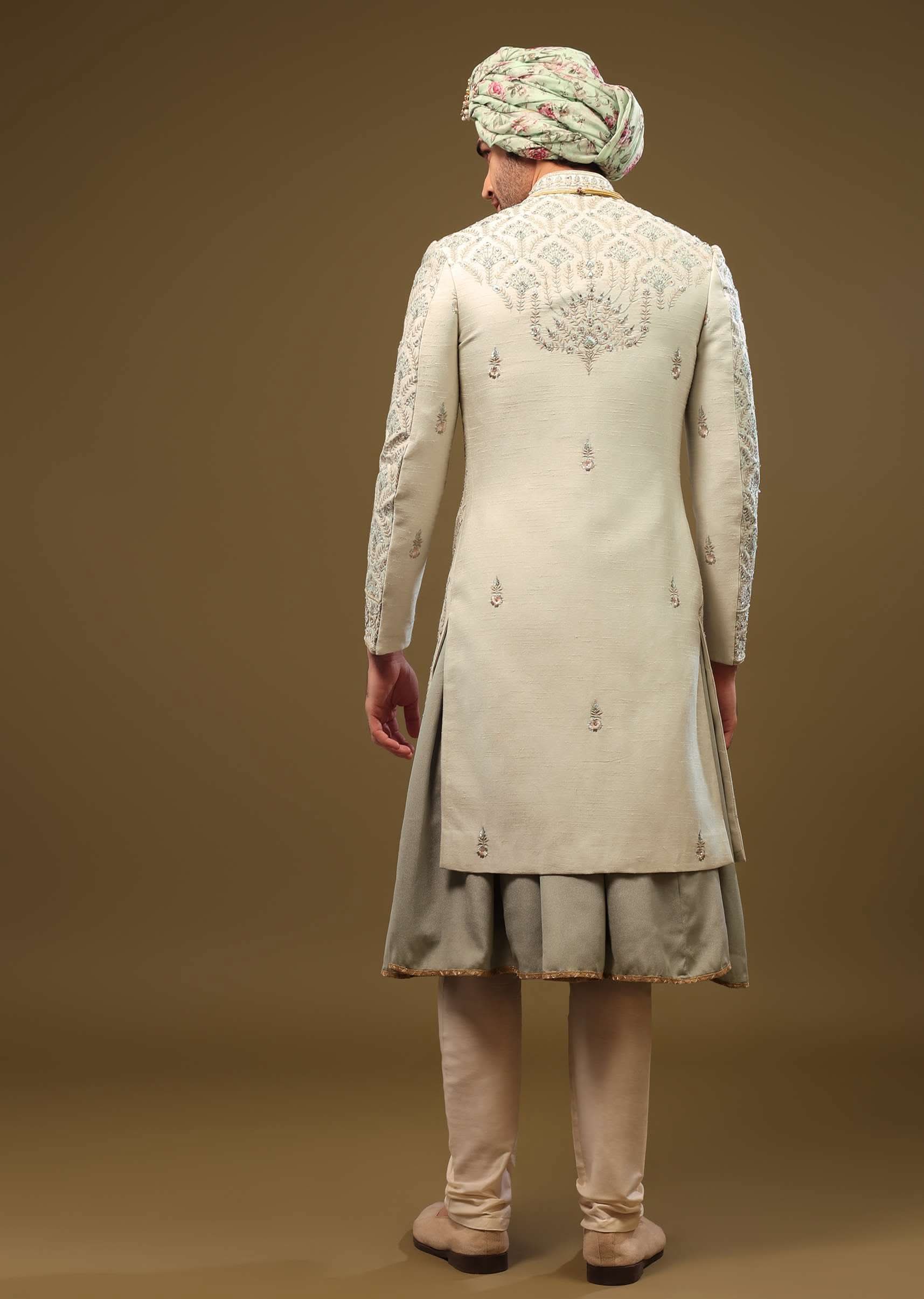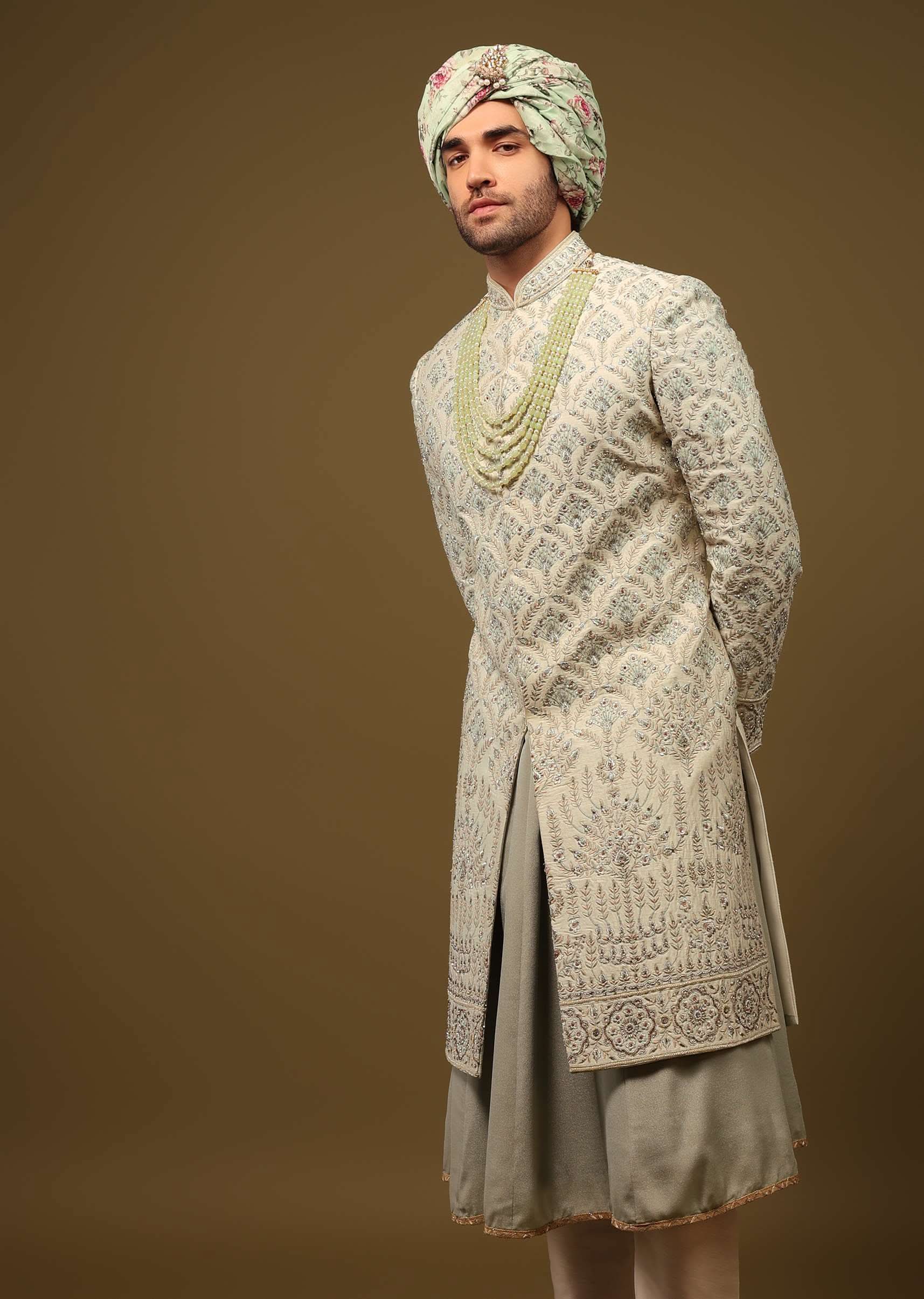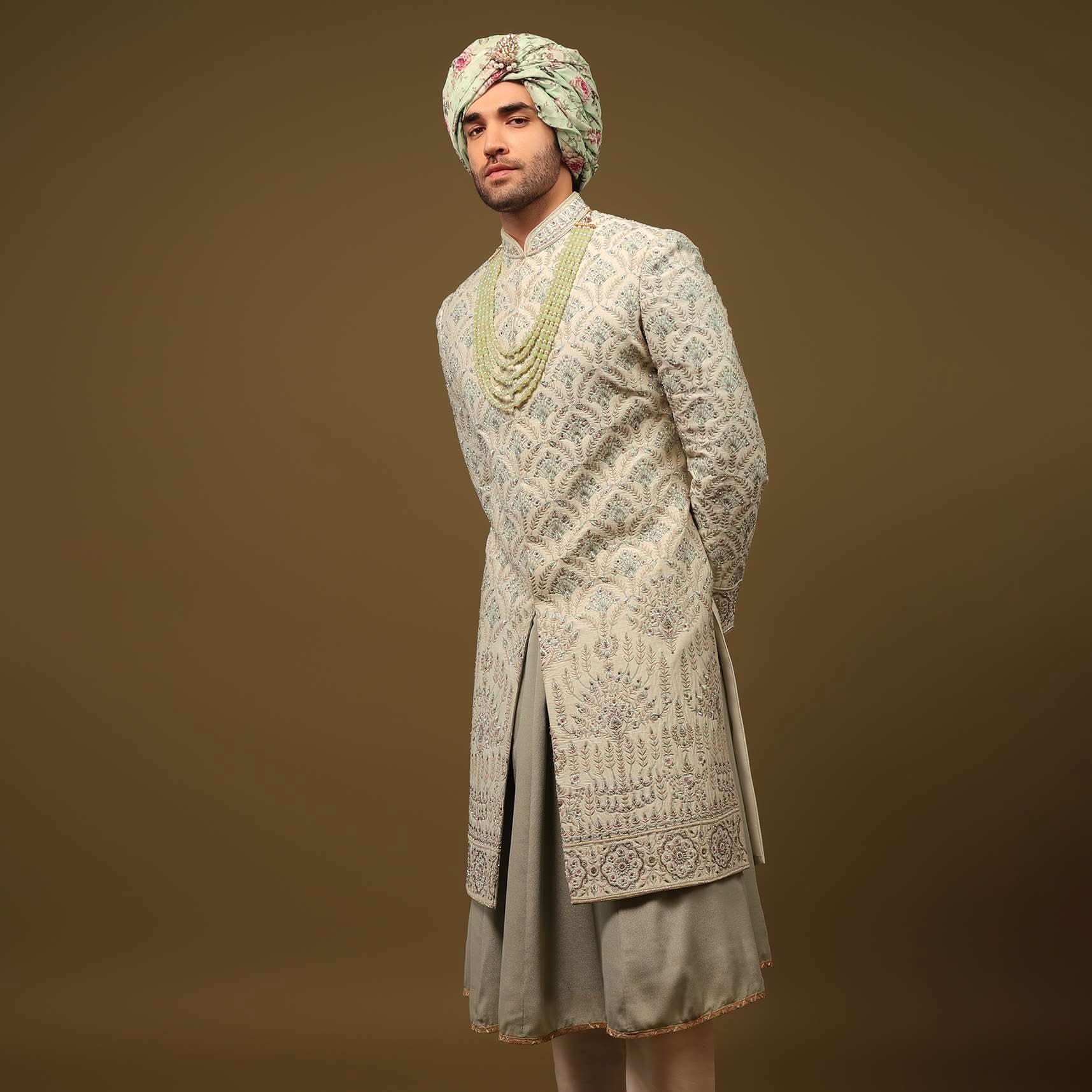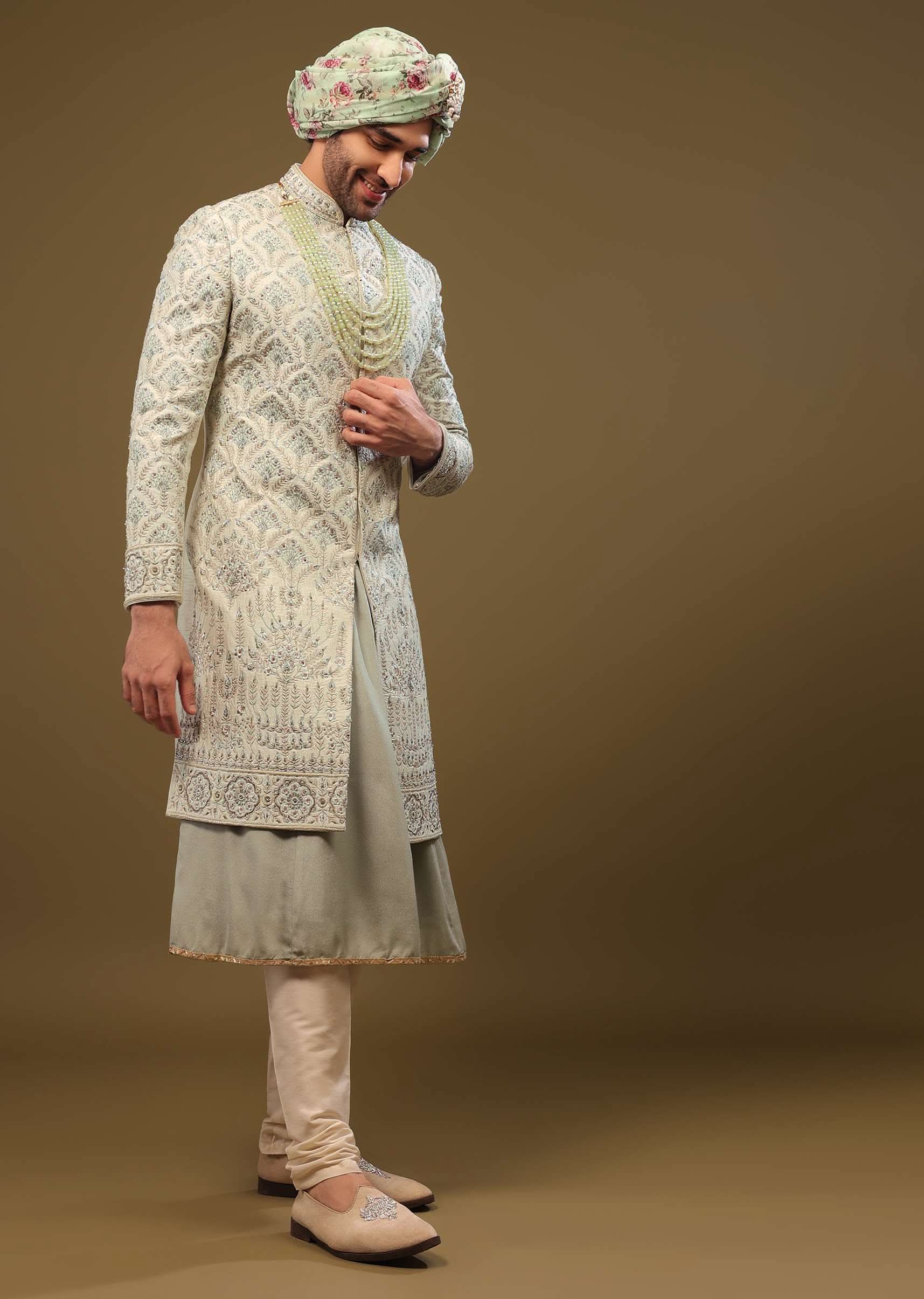 - An elegant milky green sherwani set fabricated in silk, crafted in cut-dana, beads, sali, and thread embroidery.