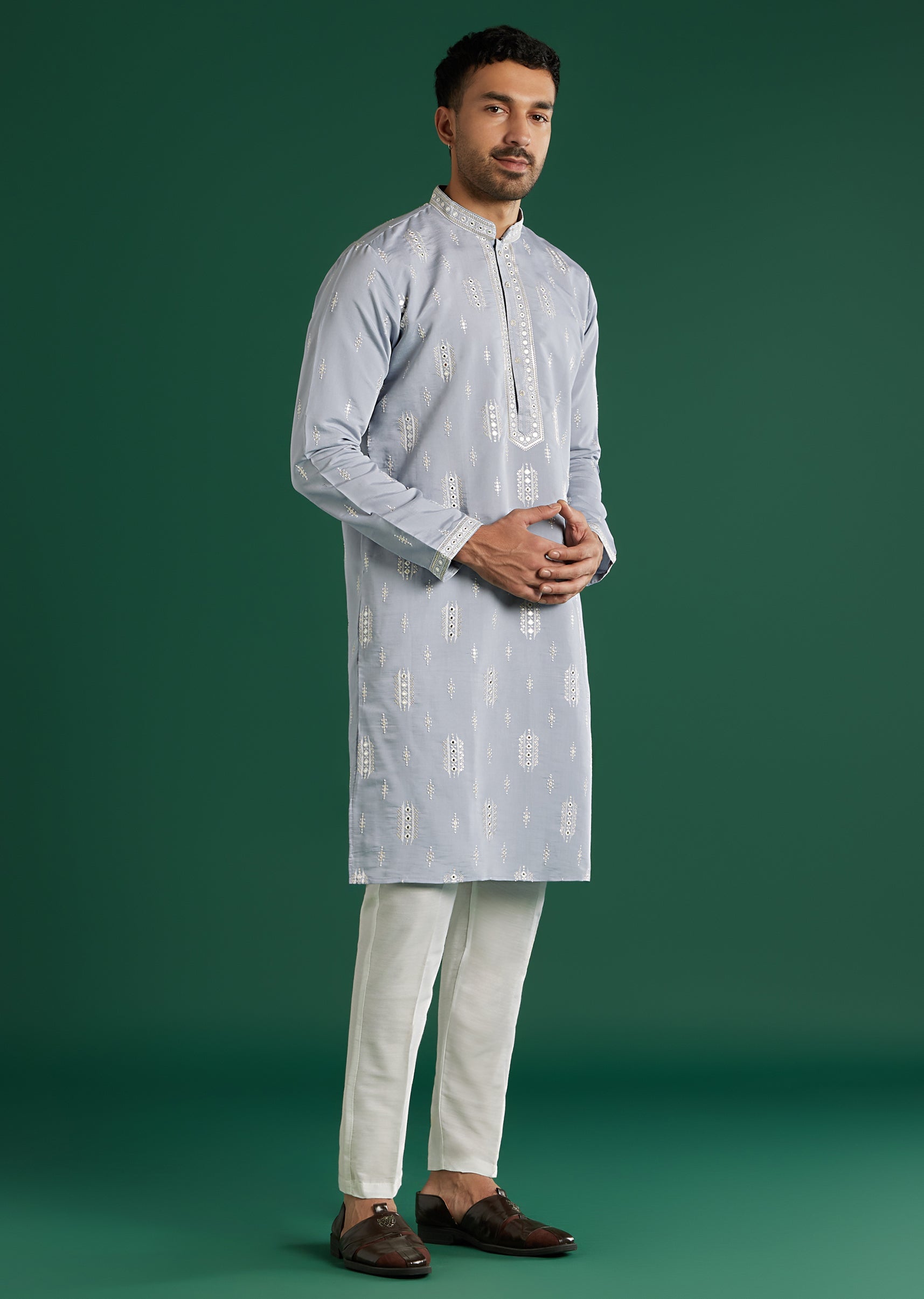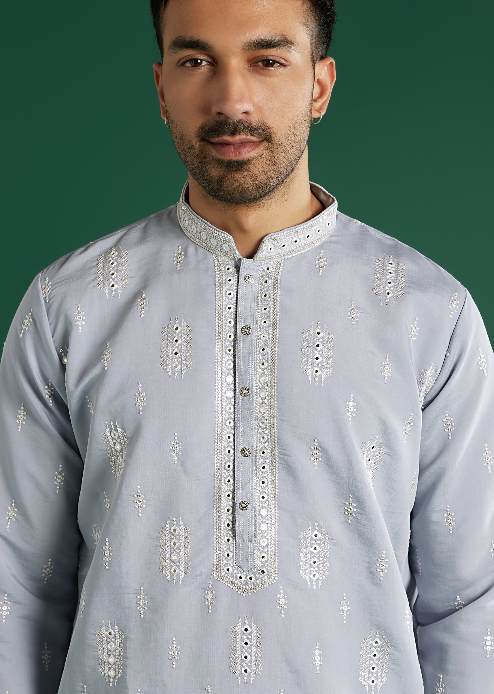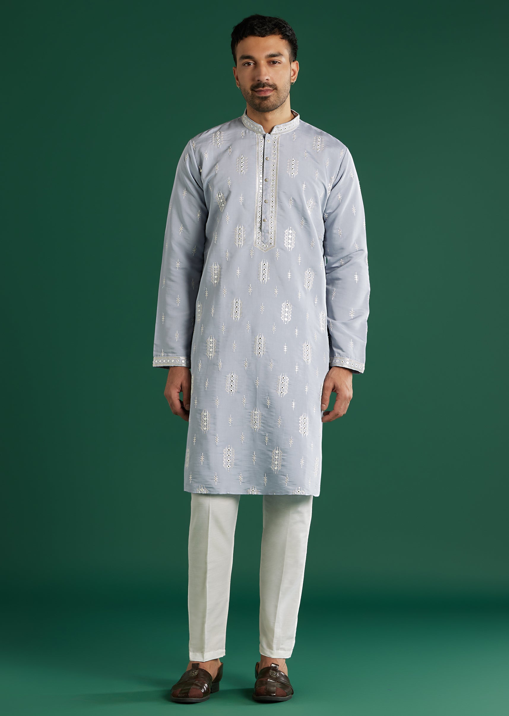 Softly tonal and versatile, this mint blue art silk men’s kurta set places fine white resham at the placket and cuffs, with scatter mirrors across the body for lift. The... More Product Details