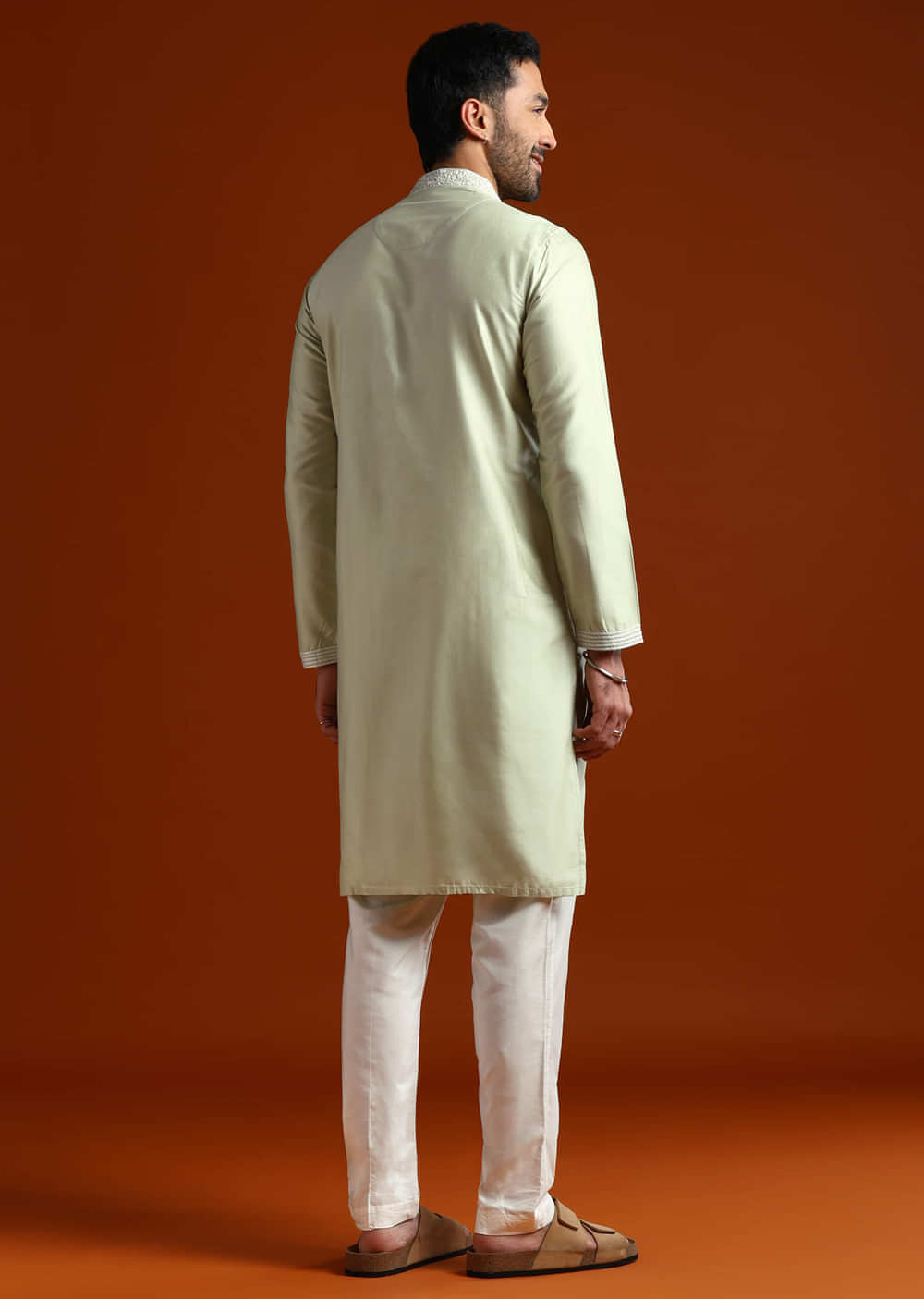 Pair with cream mojaris and a soft pocket square to keep the palette gentle.