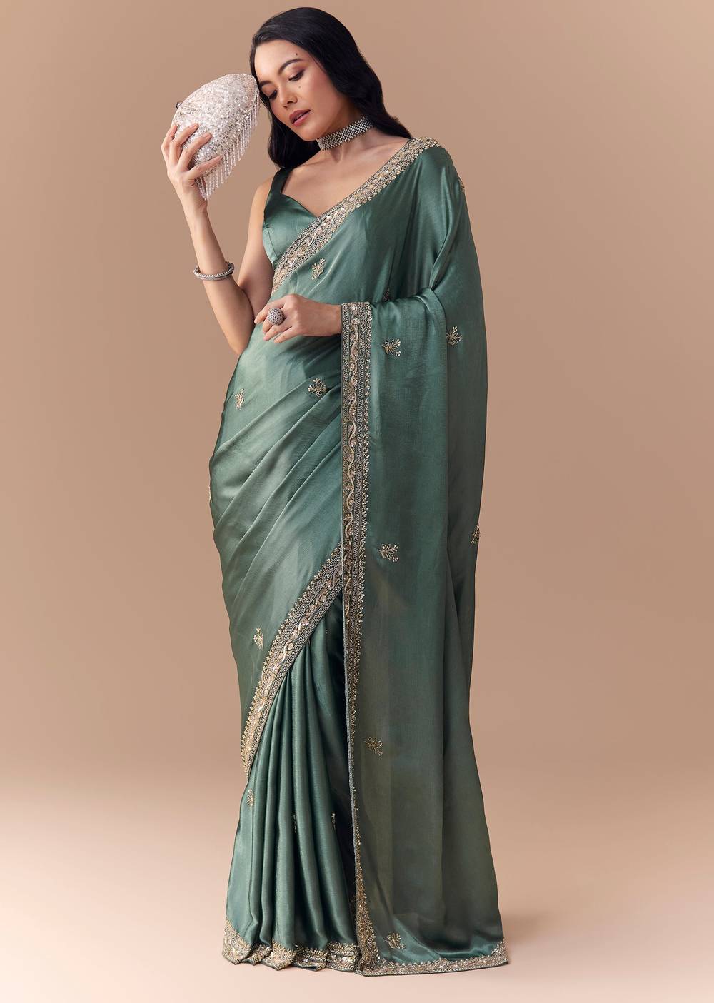 Radiate subtle sophistication with this mint green chinon saree, featuring delicate butti work all over and a richly embroidered border embellished with cutdana, sequins, and beads. The smooth chinon fabric drapes beautifully, offering a soft sheen and elegant flow that make it perfect for festive occasions, weddings, or evening celebrations. This saree blends refined detailing with graceful charm for a timeless appeal. Awarded as the Most Trusted Brand, we're delivering styles you love, just as promised.
