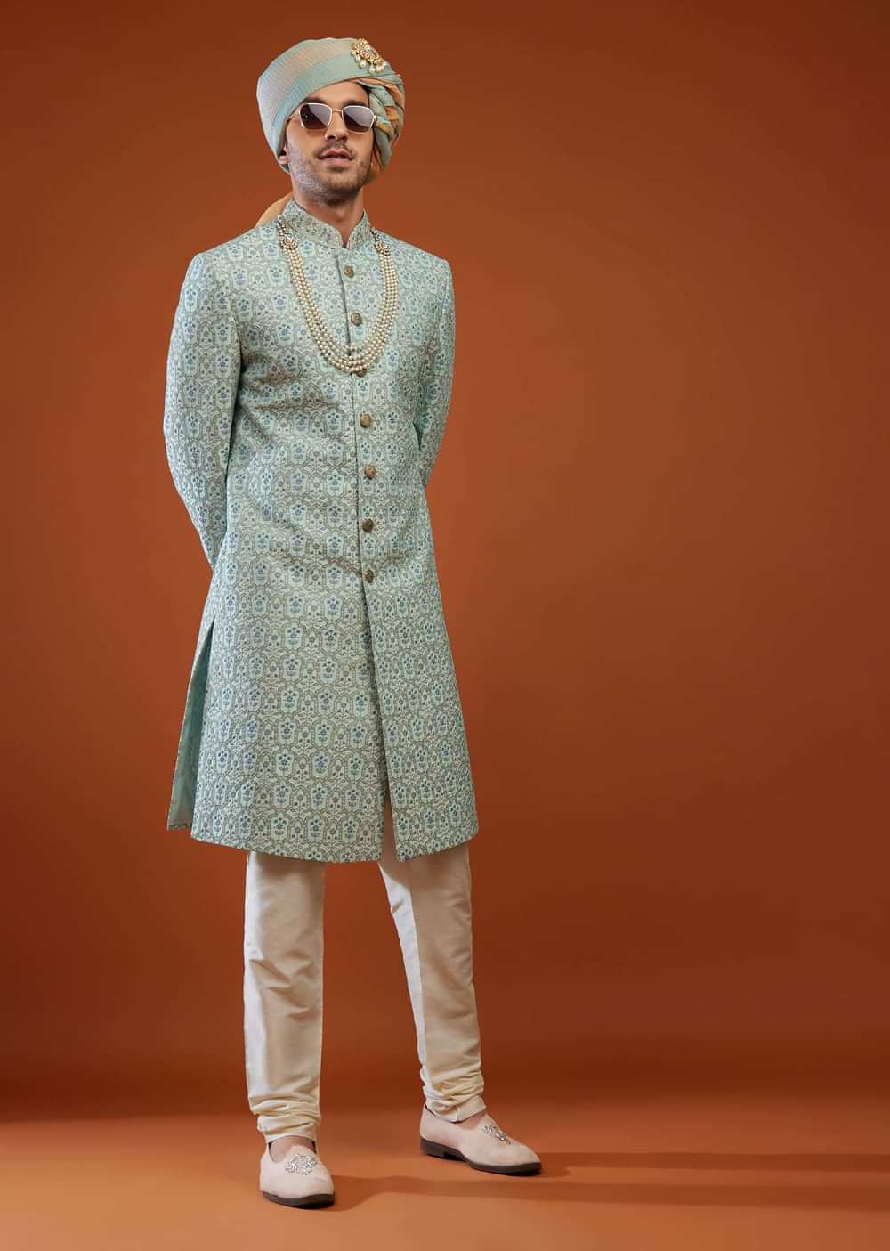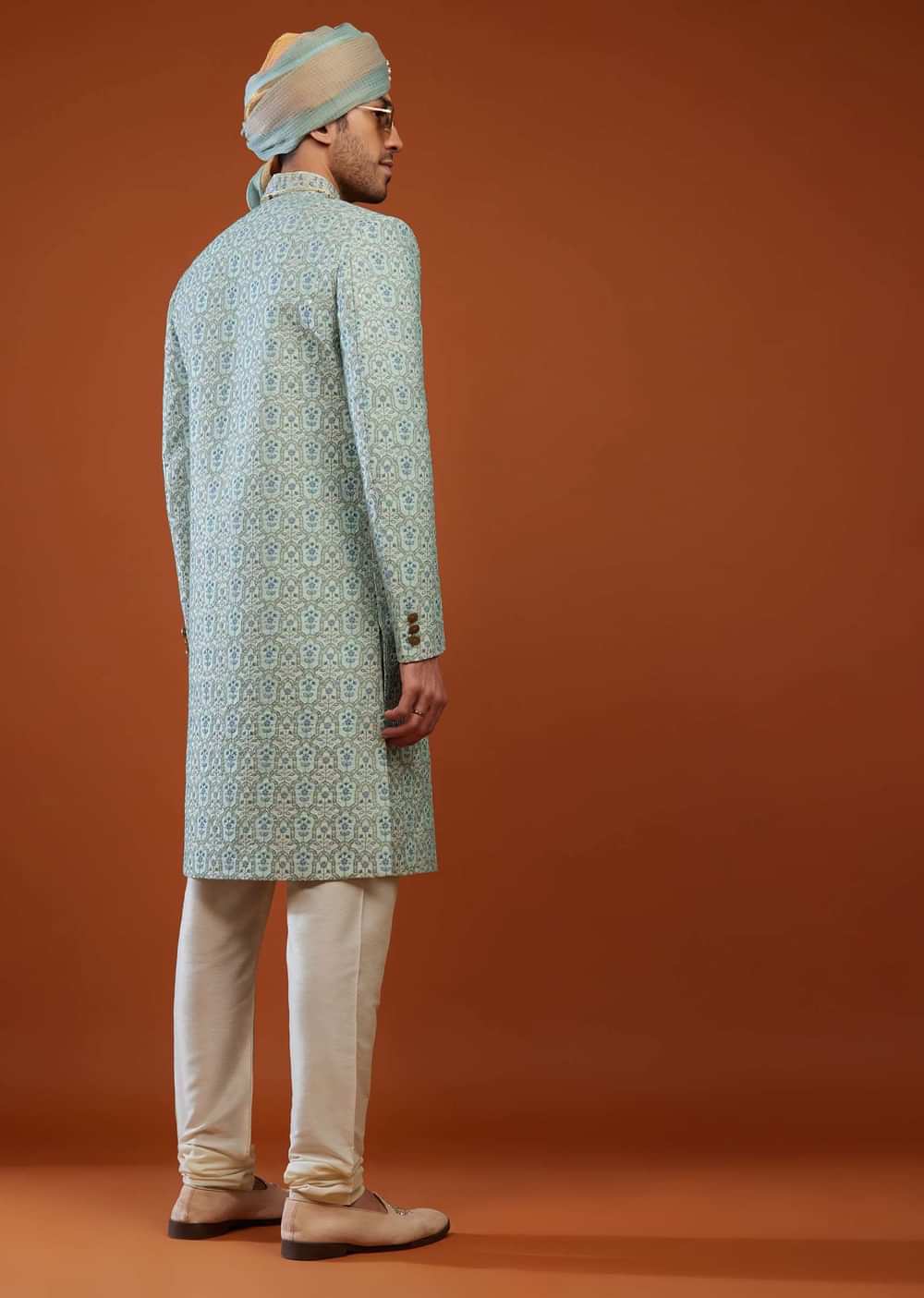 - Powder Blue Sherwani Set tailored in Tussar Silk.