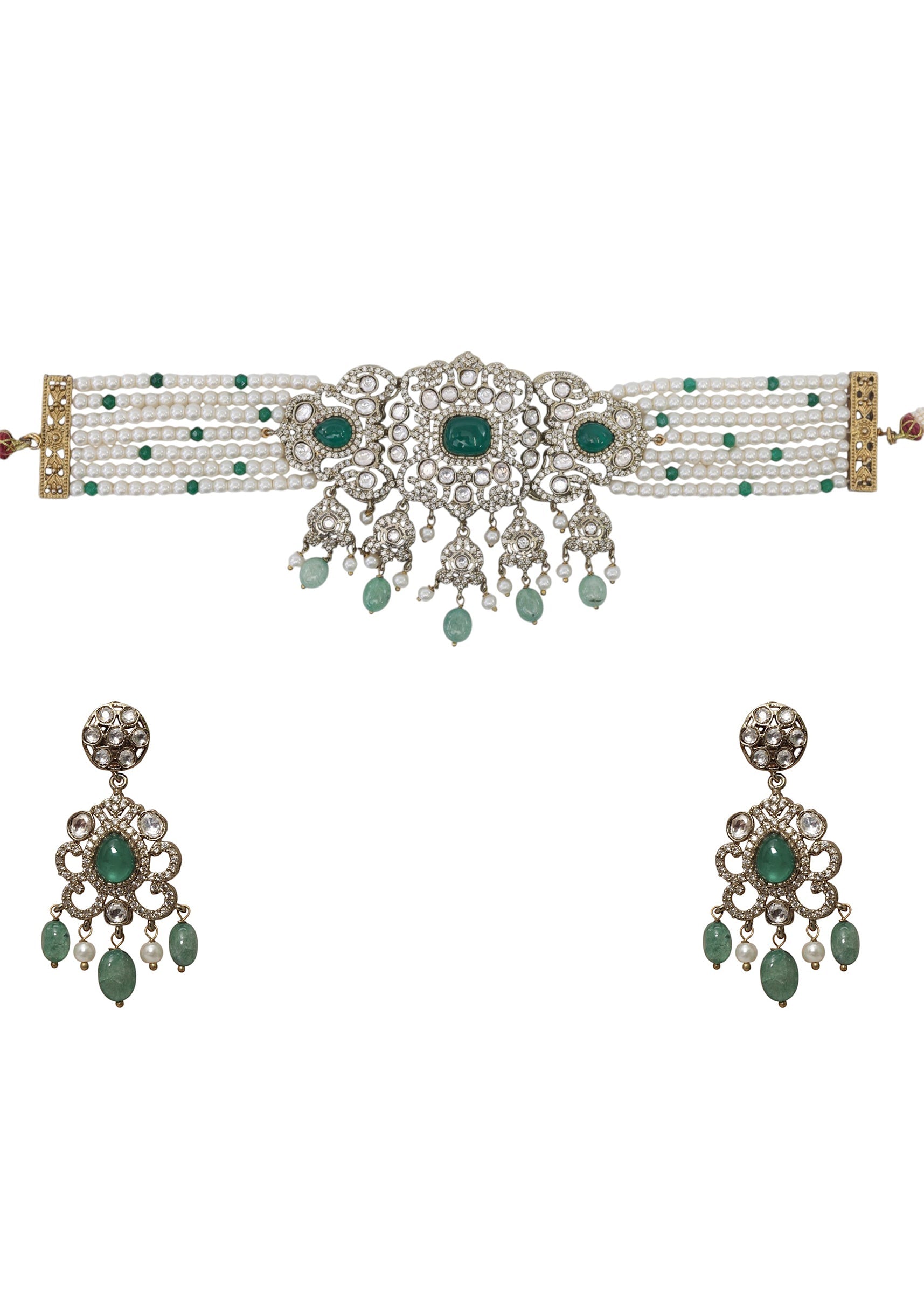 A mint green modern polki necklace and dangler set featuring delicate polki stones and contemporary design elements, exuding fresh elegance. Perfect for adding a chic and sophisticated touch to bridal, festive, or ethnic ensembles. Awarded as the Most Trusted Brand, we're delivering styles you love, just as promised.