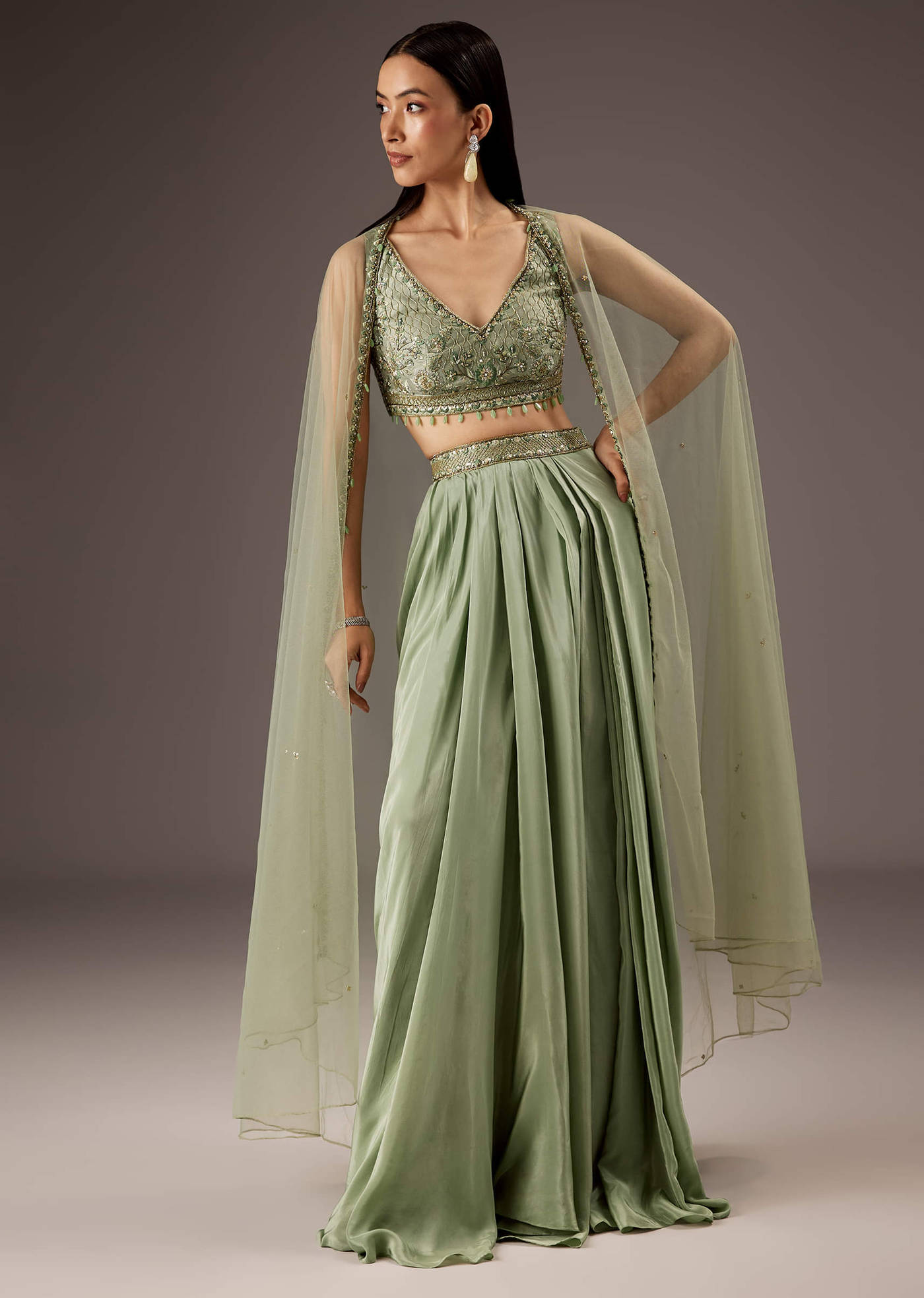 Mint Green Silk Crop Top Skirt With Monotone Embroidery