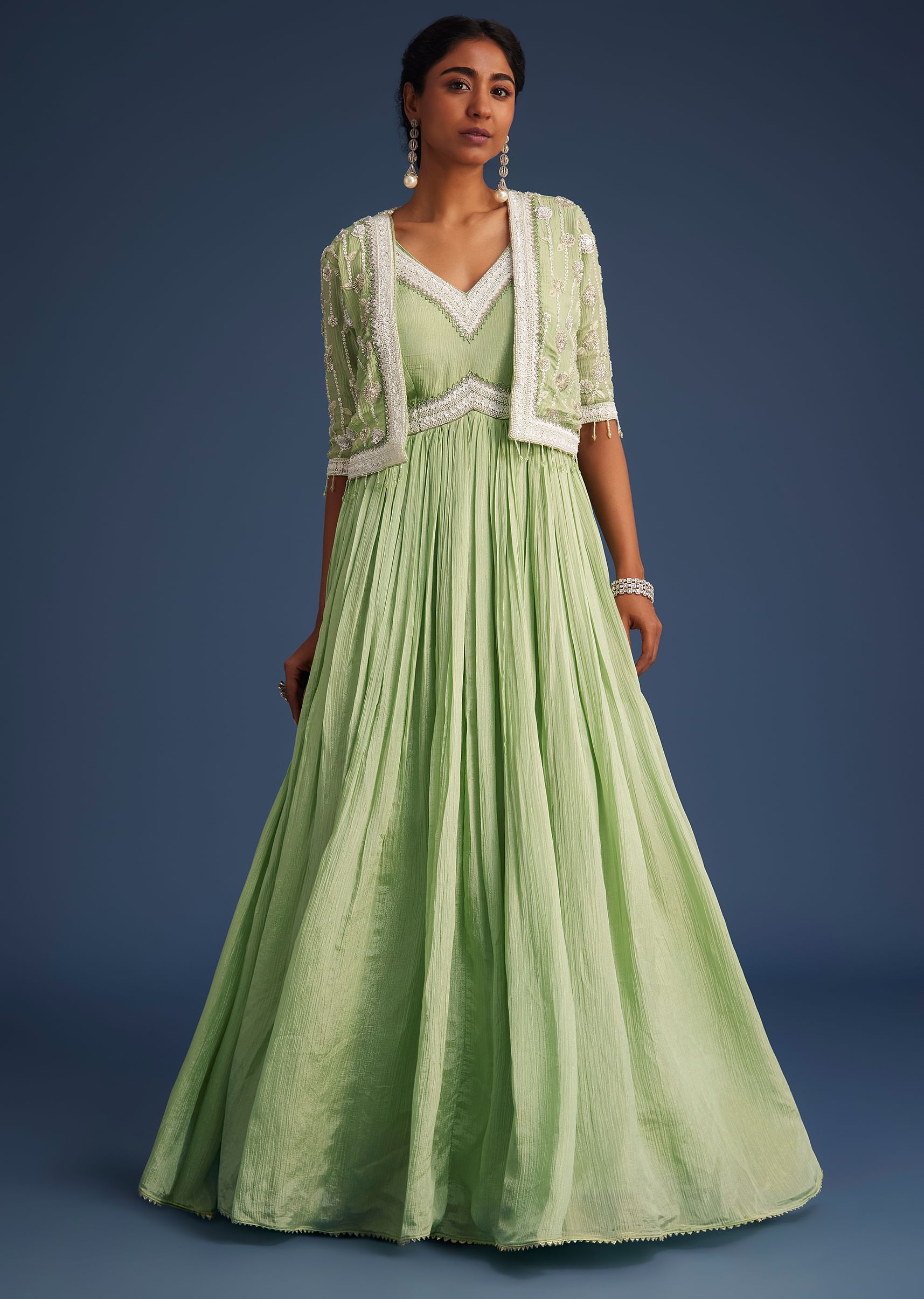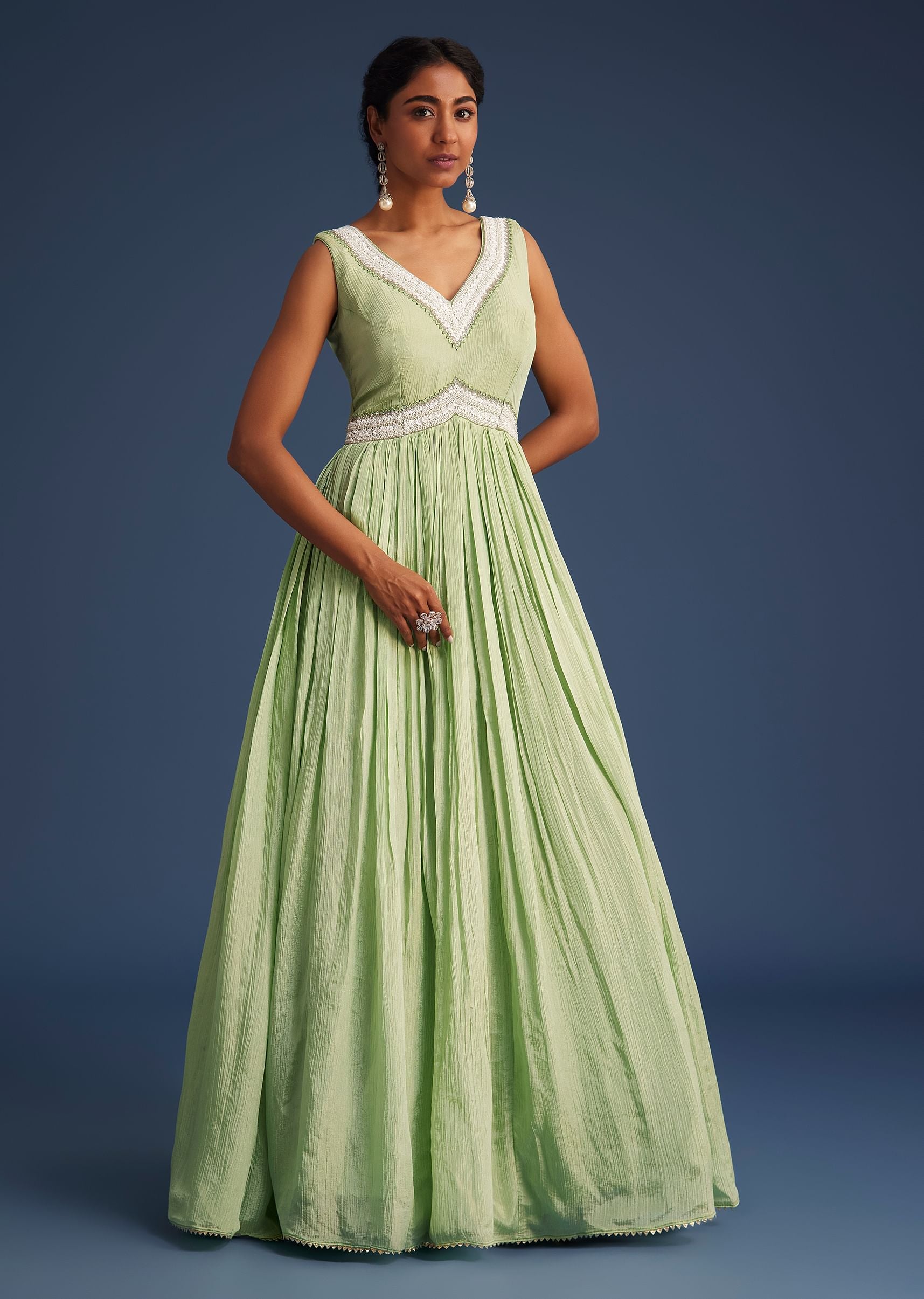 Drape Yourself In Ethereal Charm With This Mint Green Tissue Gown A Masterpiece Of Delicate Craftsmanship. The Fluid Silhouette Cascades Gracefully Adorned With Shimmering Moti Cut Dana Sequins Beads And... More Product Details