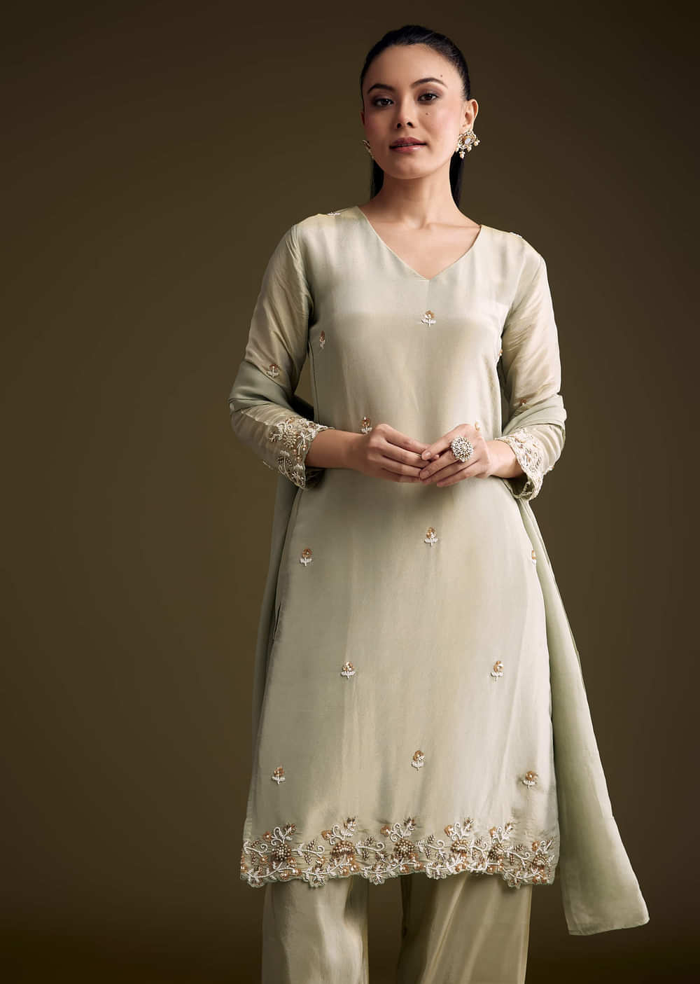 For a soft glow that reads festive, this mint green tissue kurta set keeps the palette fresh and the finish refined. Sequins and moti work trace the neckline and edges... More Product Details