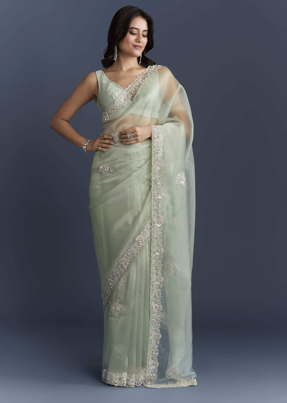 Mint Green Tissue Saree With Heavy Hand Embroidery