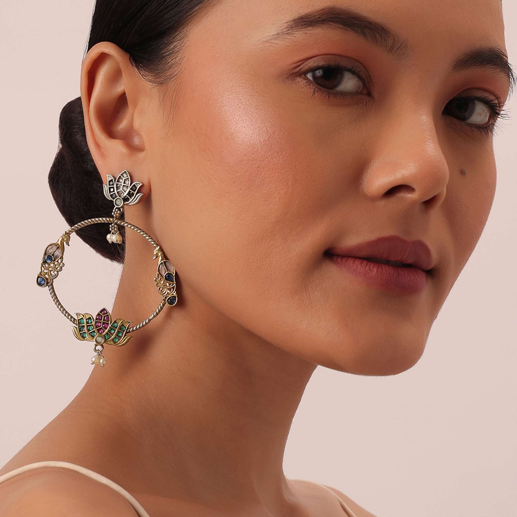 Mixed Metal Oxidised Chandbalis With Lotus Motifs