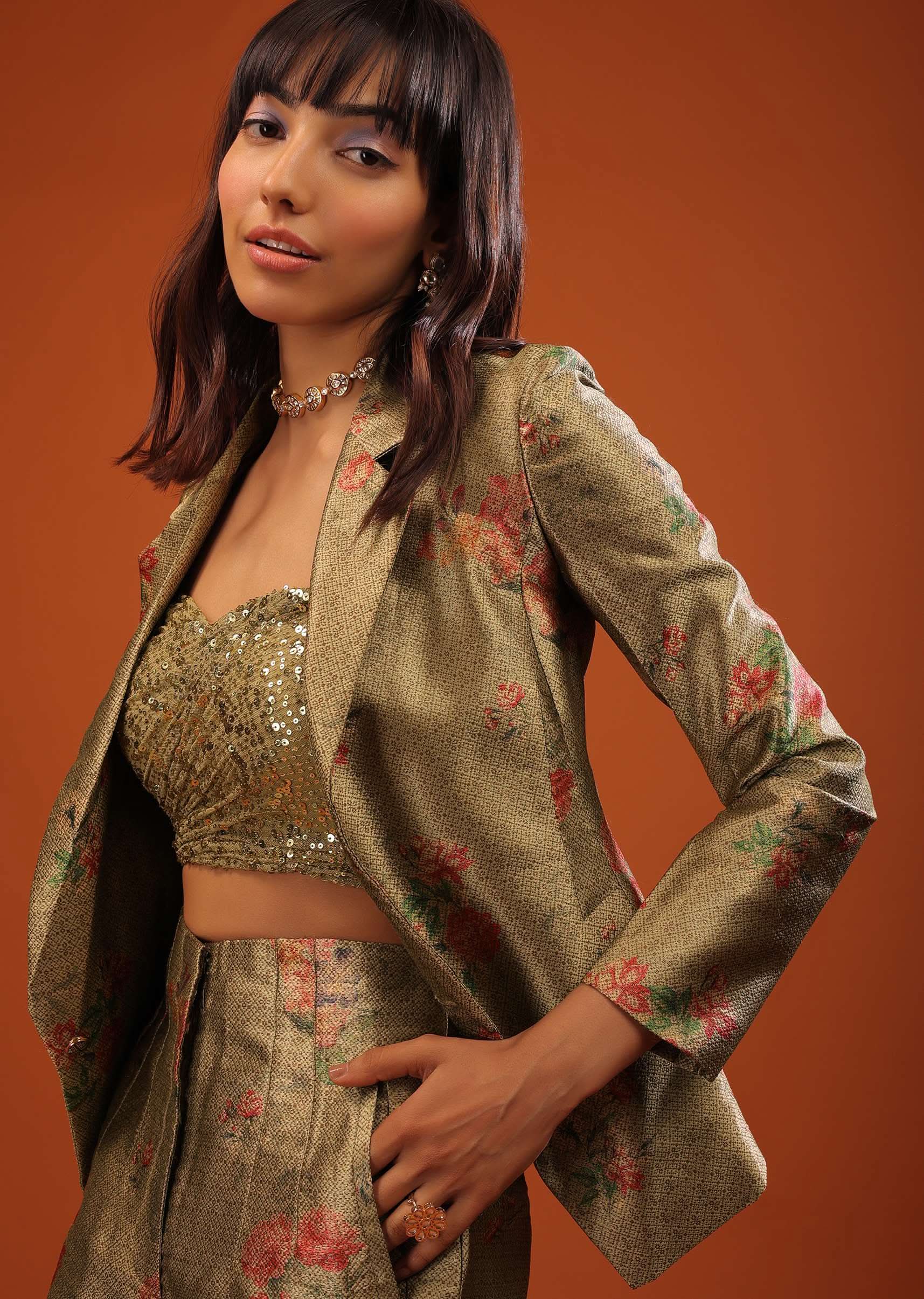Moss Green Three-Piece Suit In Woven Floral Motifs With Cropped Pants And Sequin Bustier