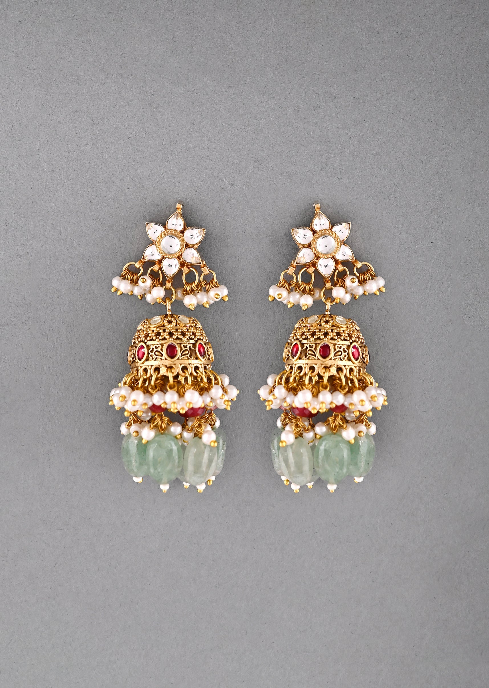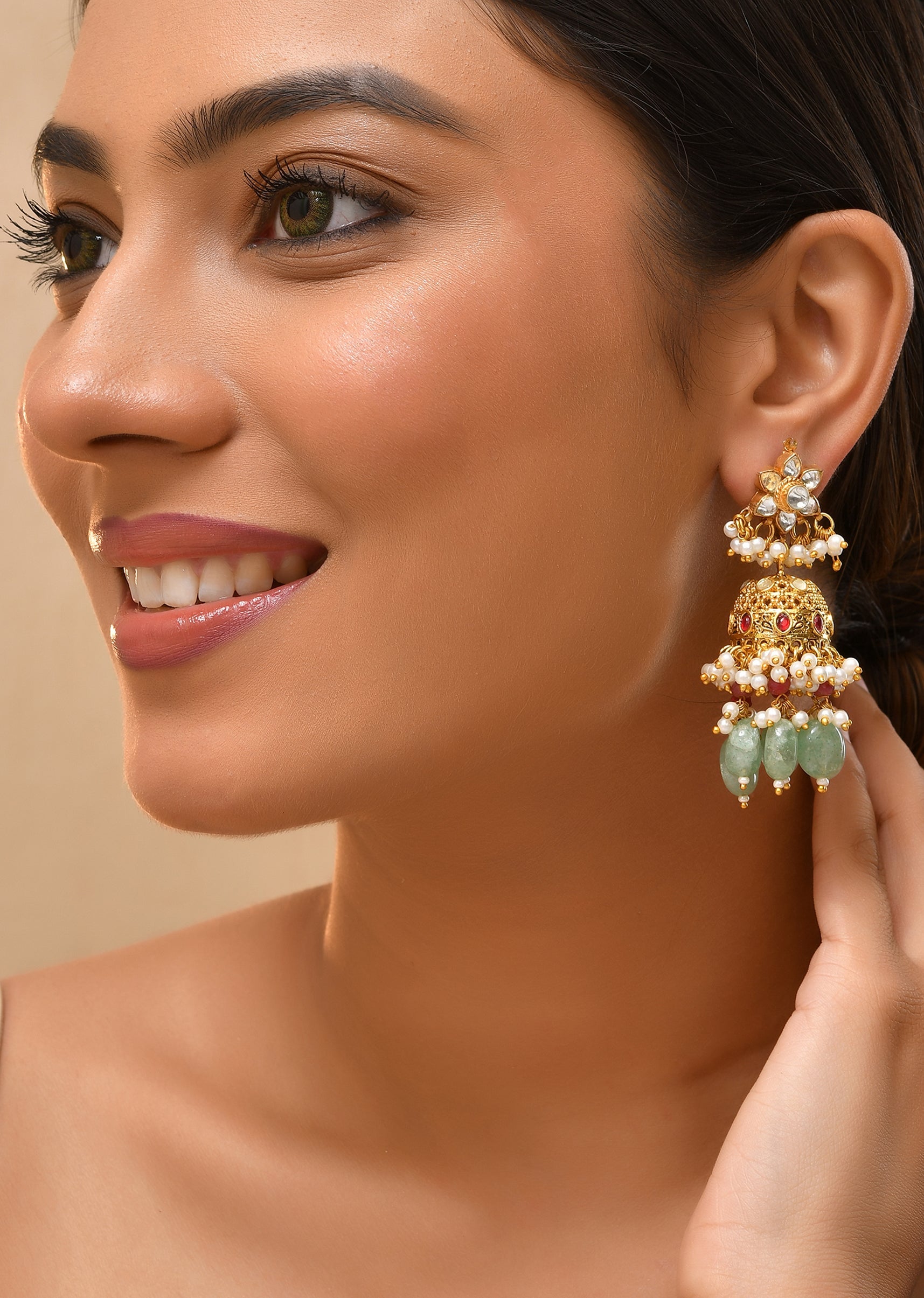 These multi gold earrings feature intricate pachi kundan work that exudes festive elegance. Perfect for weddings, mehendi, or celebration events, the warm gold tones and detailed craftsmanship create a statement... More Product Details