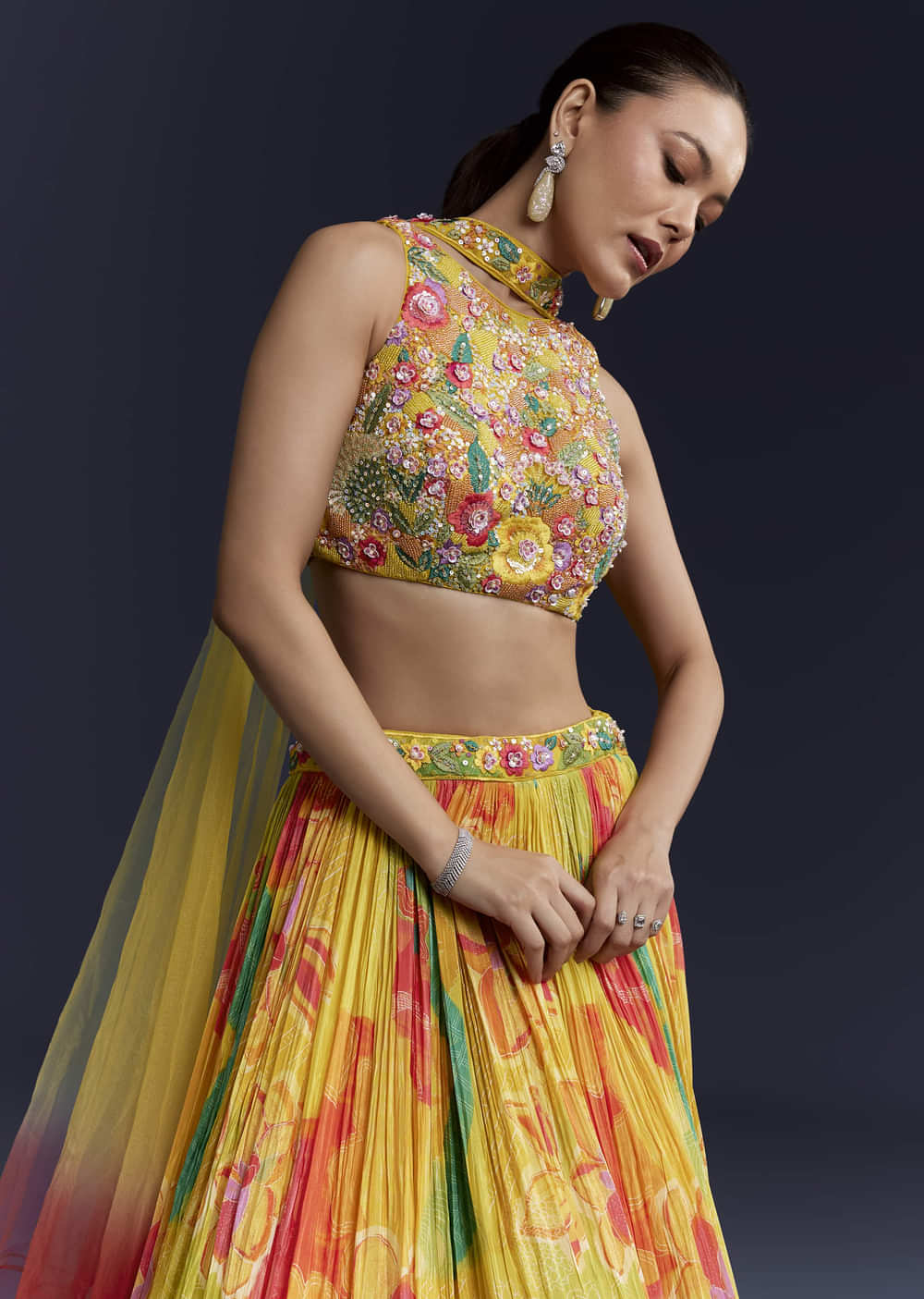 Sun-kissed haldi ceremonies gets a vibrant updo with this multi-hued crepe bridesmaid lehenga set. Doused in joyful floral prints, the colorful embellishments shine bright as your spirit. Designed with a... More Product Details