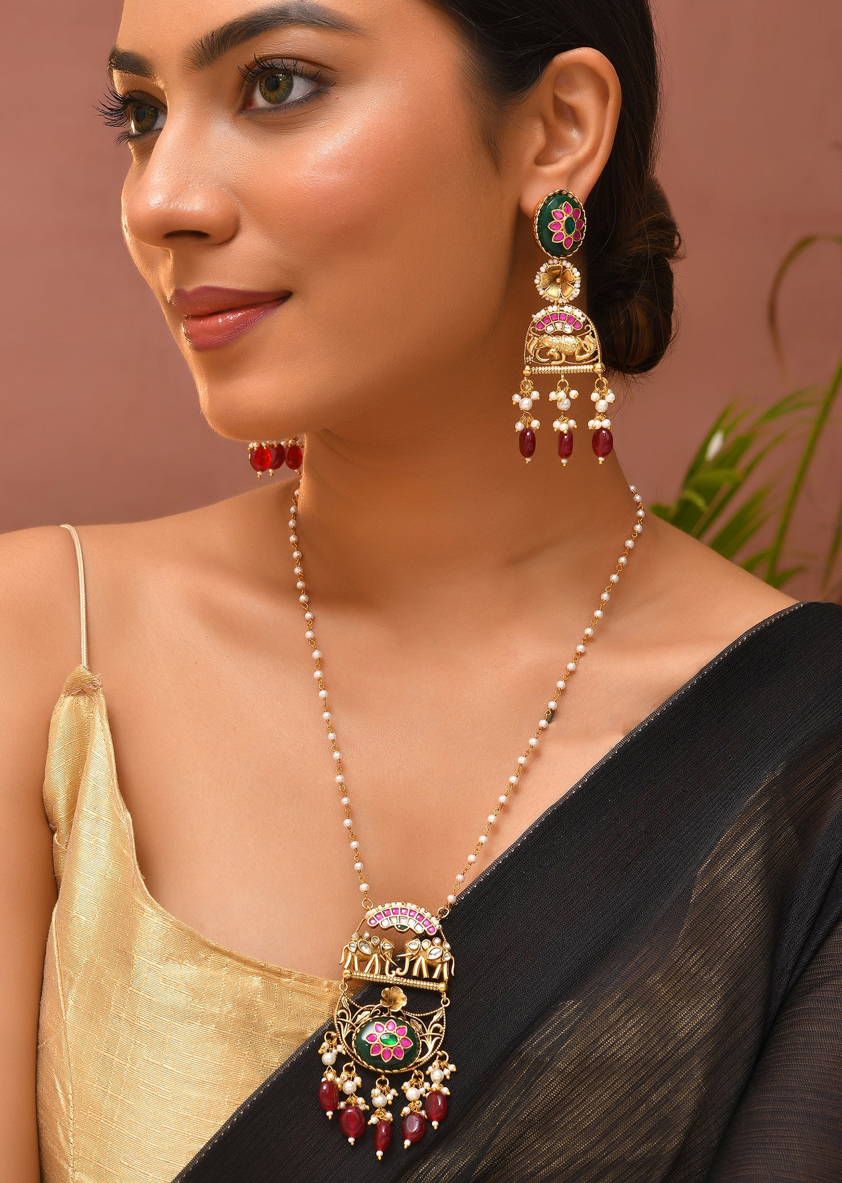 Add vibrant elegance to your ensemble with this multi-tone floral enamelled pendant necklace and earrings set, featuring intricate motifs and rich color detailing. Perfect for festive occasions or weddings, it... More Product Details