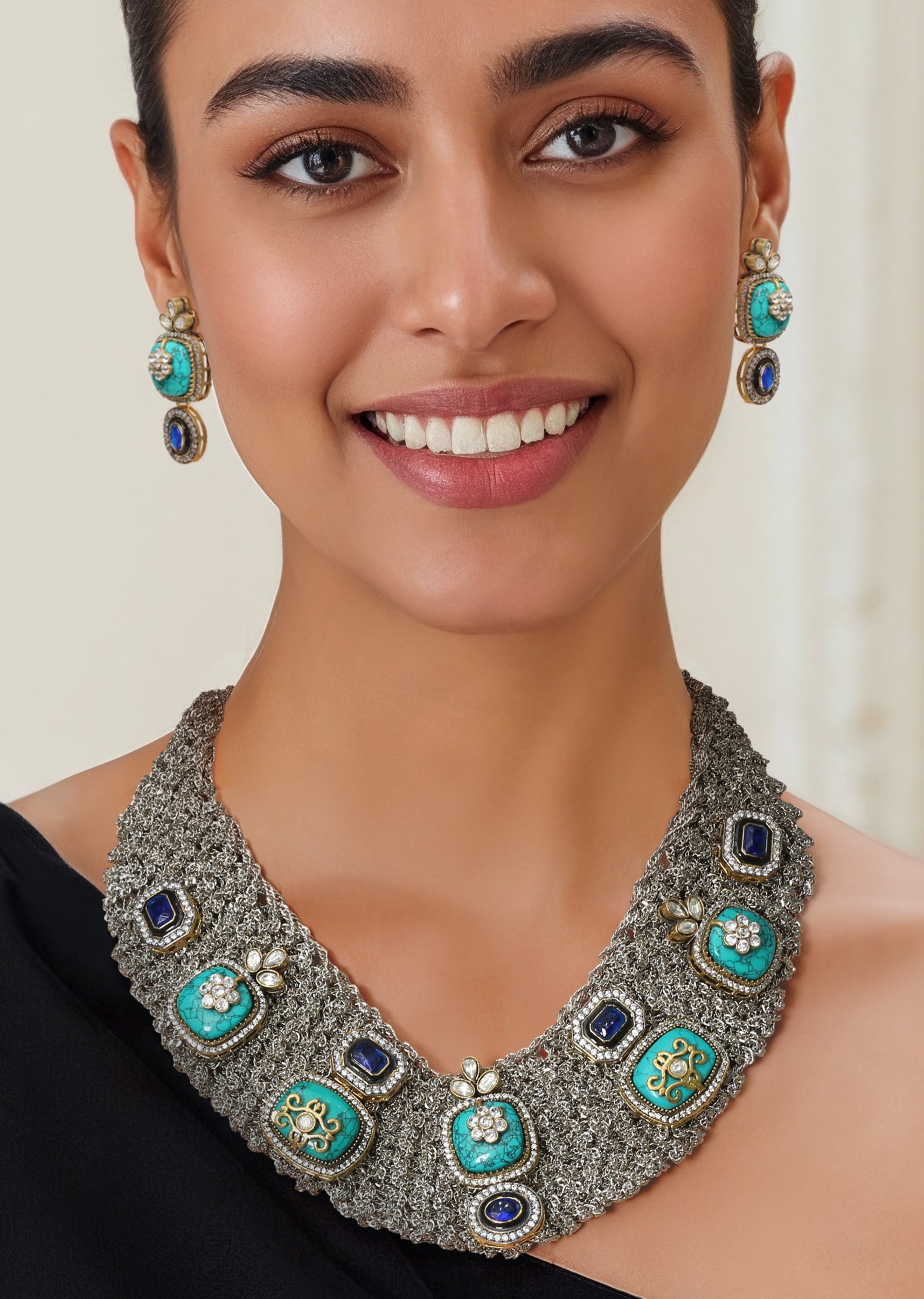 A multi fusion encrusted geometric stone necklace set featuring vibrant stones in bold geometric patterns, blending contemporary style with traditional craftsmanship. Perfect for adding a striking and elegant touch to... More Product Details
