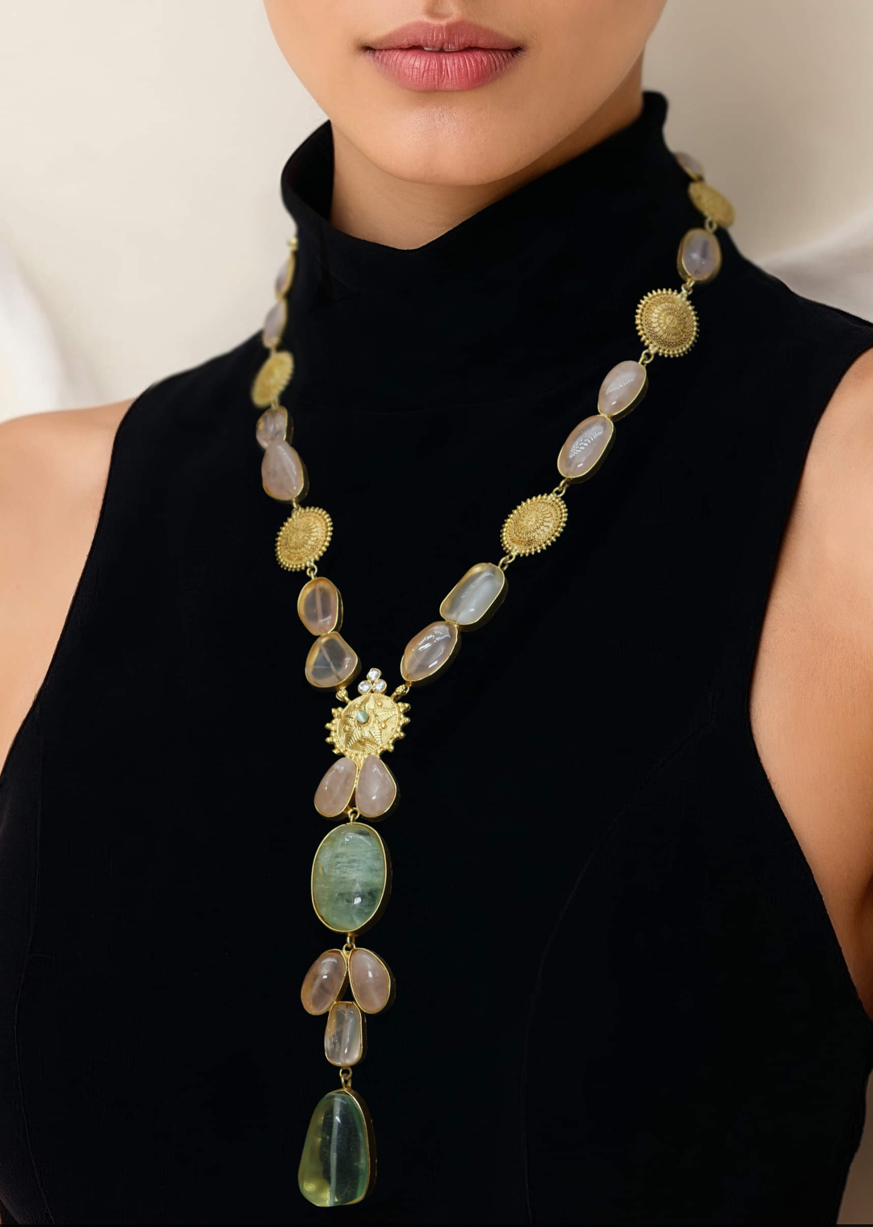 A multi fusion long necklace featuring a blend of vibrant stones and intricate craftsmanship, combining traditional charm with contemporary elegance. Perfect for adding a statement-making touch to bridal, festive, or... More Product Details