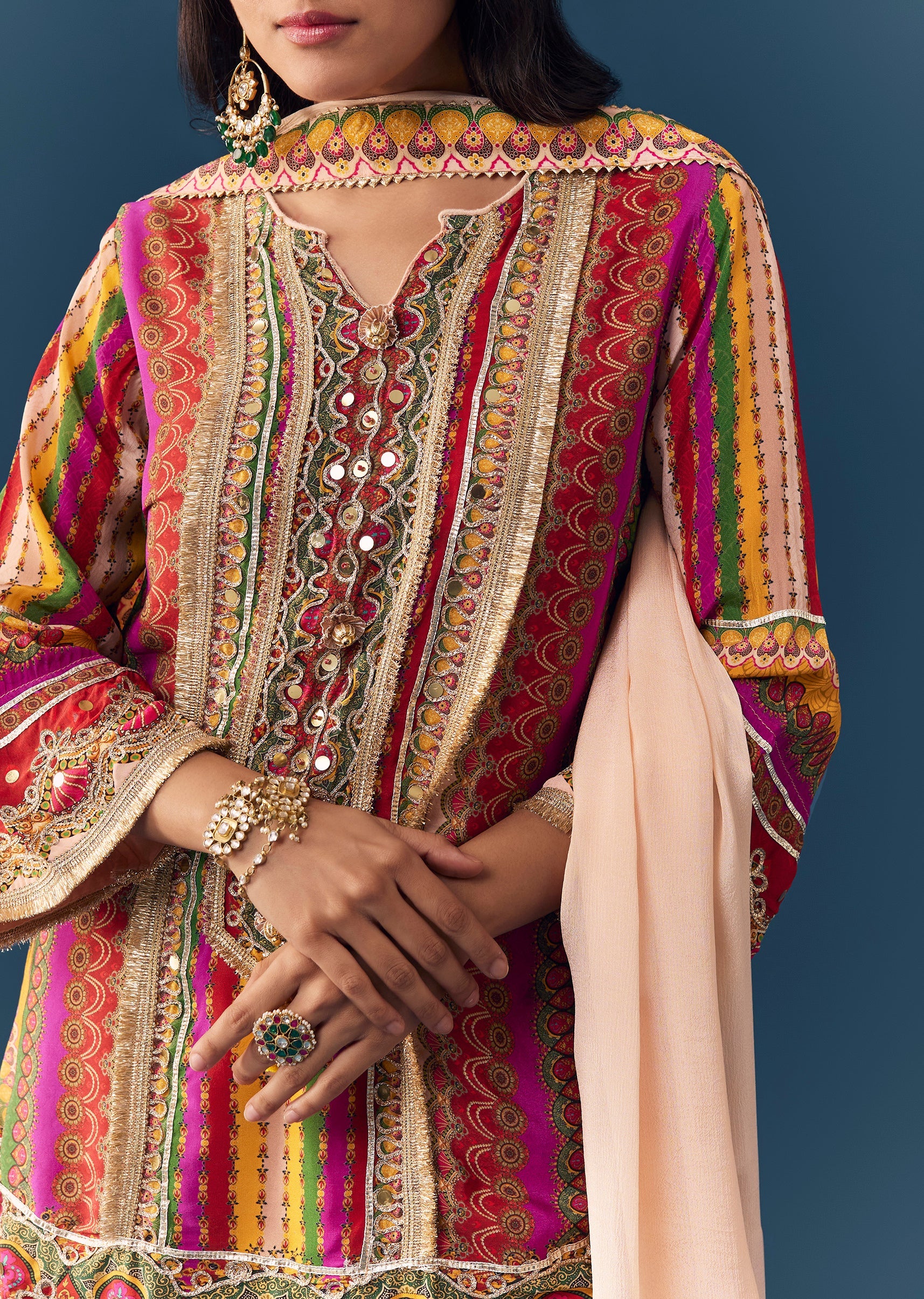 Keep the kurta fitted at the shoulders and the sharara mid rise for a flattering, easy flow.