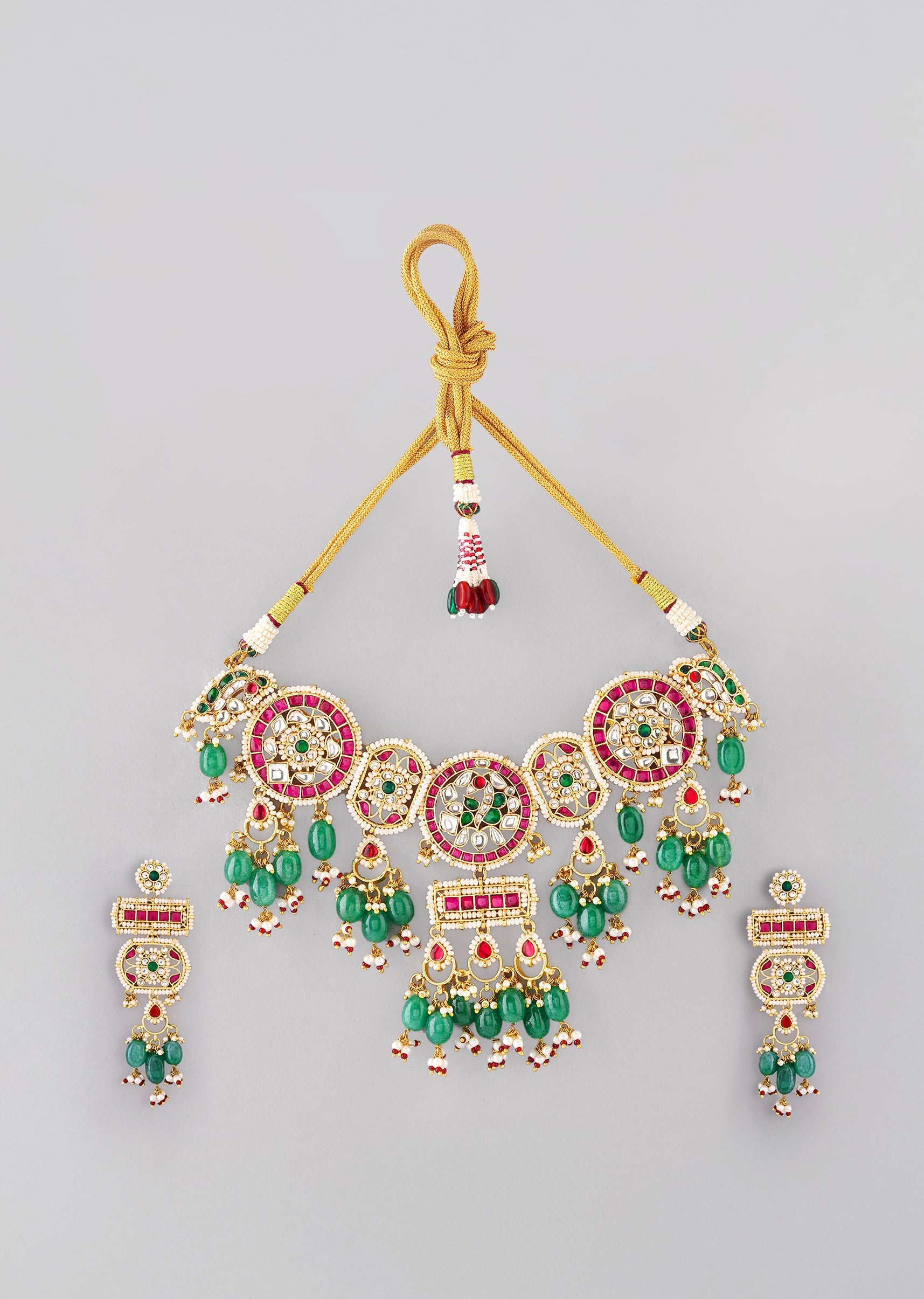 Add vibrant elegance to your festive look with this multi-tone kundan necklace and earrings set, featuring delicate bead drops for a graceful finish. Perfect for weddings or celebrations, it brings... More Product Details