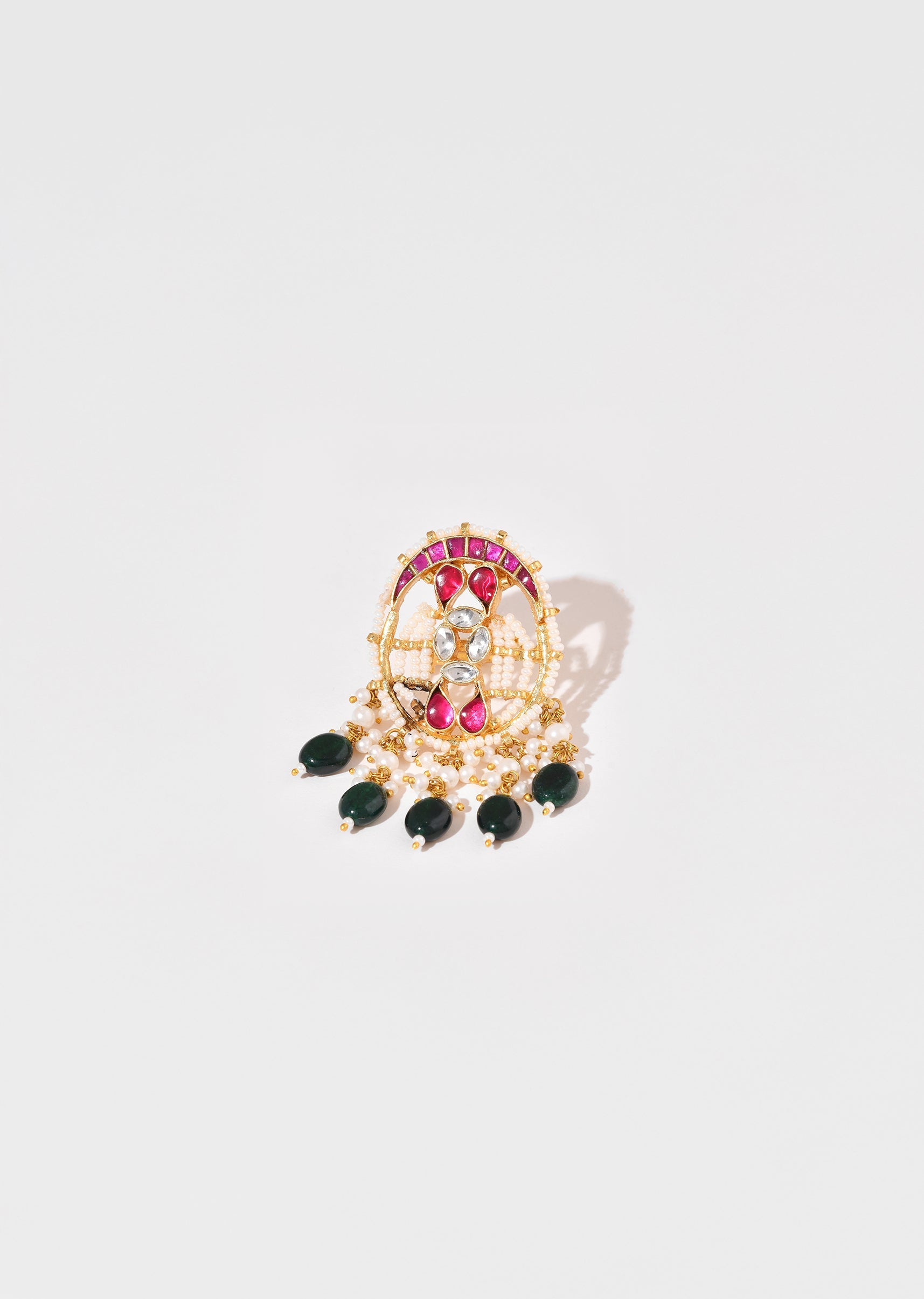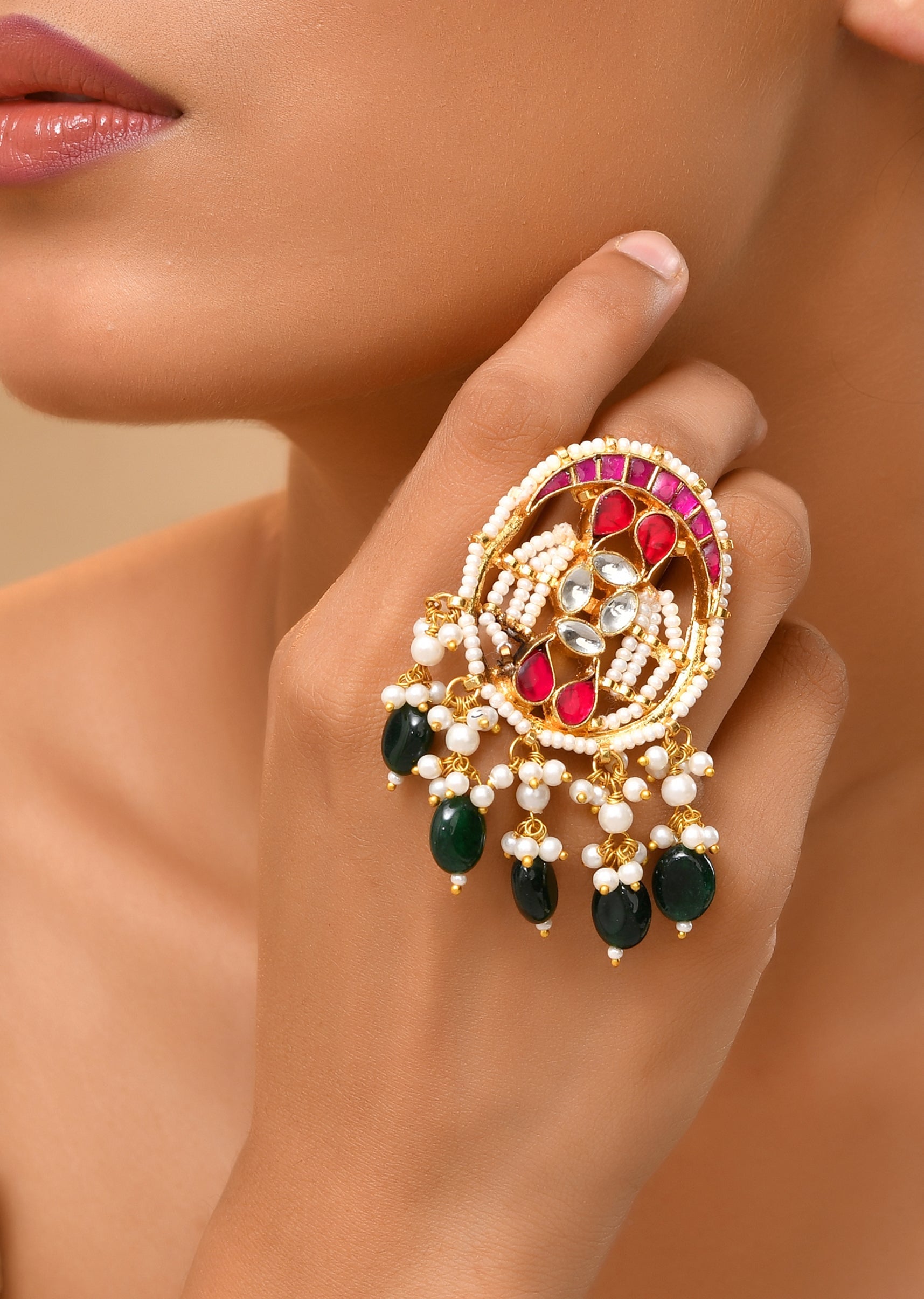 Make a bold impression with this multi kundan cluster statement ring, featuring vibrant stones and delicate bead drops for an eye-catching festive look. Perfect for weddings or special occasions, it adds a colorful and dramatic touch to any traditional ensemble.Awarded as the Most Trusted Brand, we're delivering styles you love, just as promised.