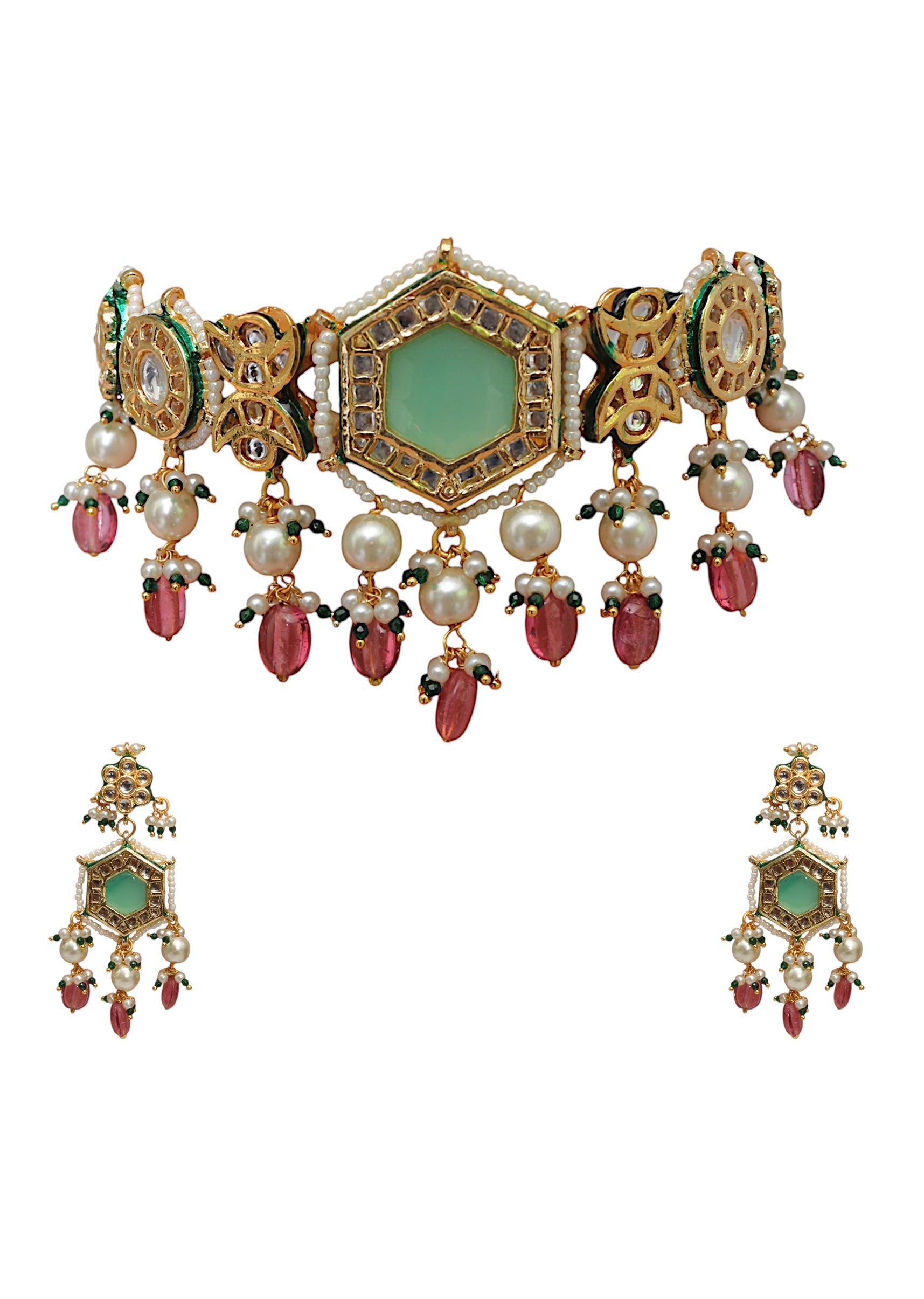 A multi kundan geometric pendant necklace and earring set featuring intricate geometric motifs and shimmering kundan stones, exuding a blend of modern sophistication and traditional charm. Perfect for adding a... More Product Details