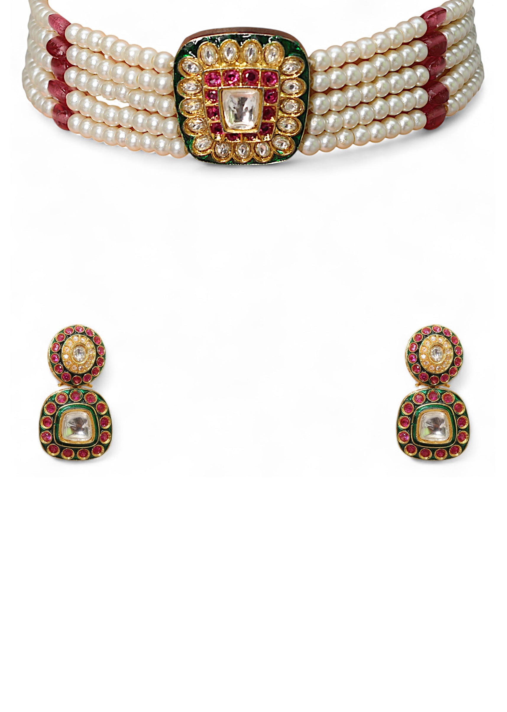 A multi kundan geometric pendant necklace set featuring intricate geometric motifs and vibrant kundan stones, combining modern artistry with traditional elegance. Perfect for adding a bold and luxurious touch to... More Product Details
