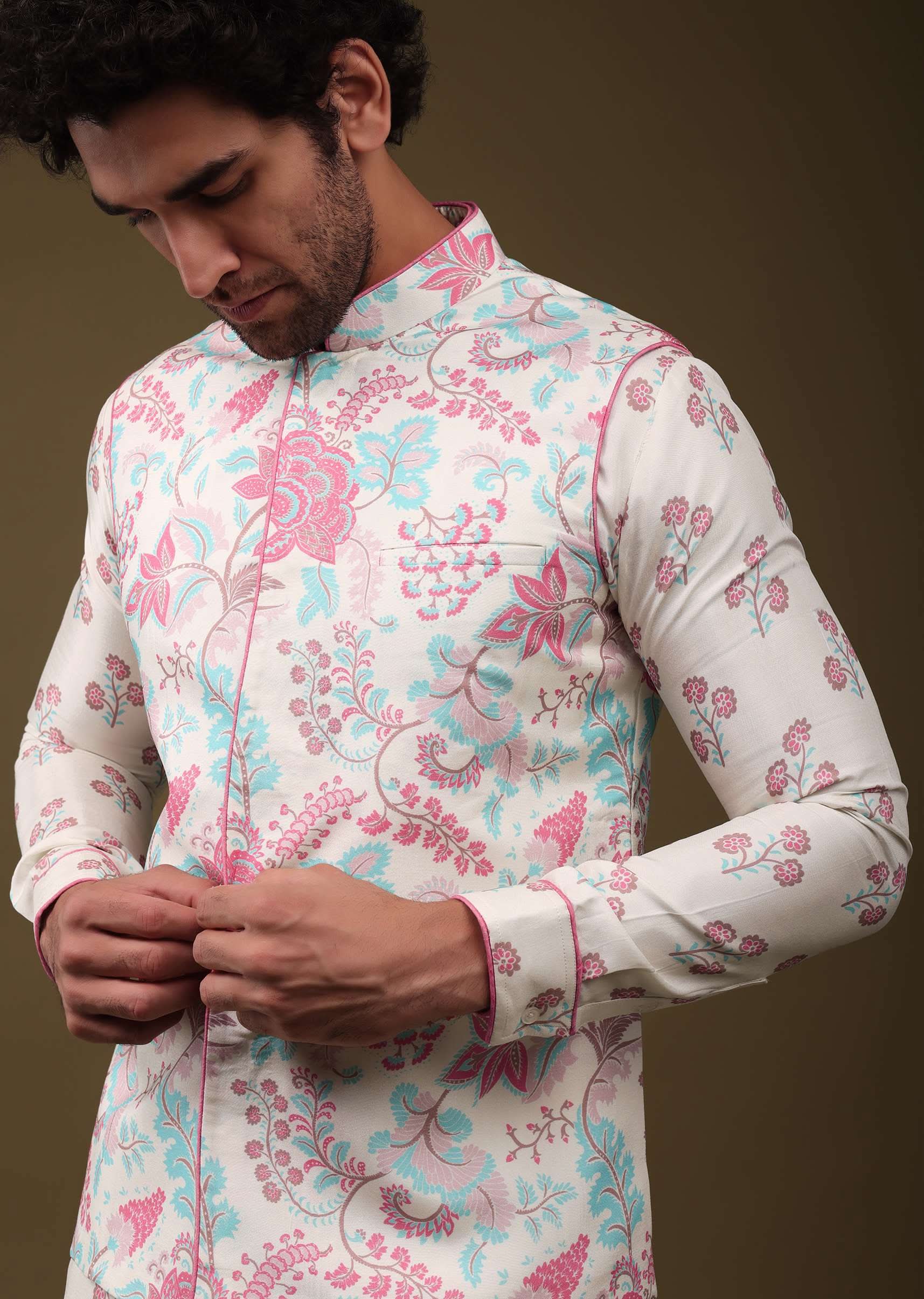 With the addition of gold accessories, the gold tones in the floral print of this jacket kurta combination can be accentuated. The look can be improved with the addition of a gold watch, pair of cufflinks, or brooch.