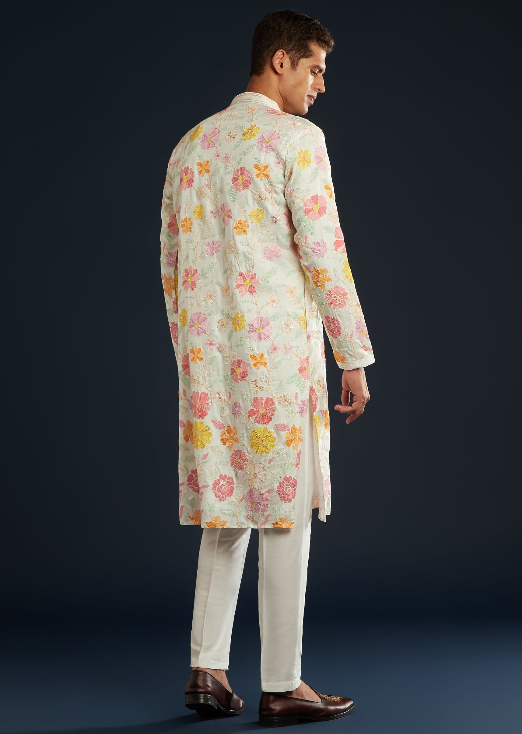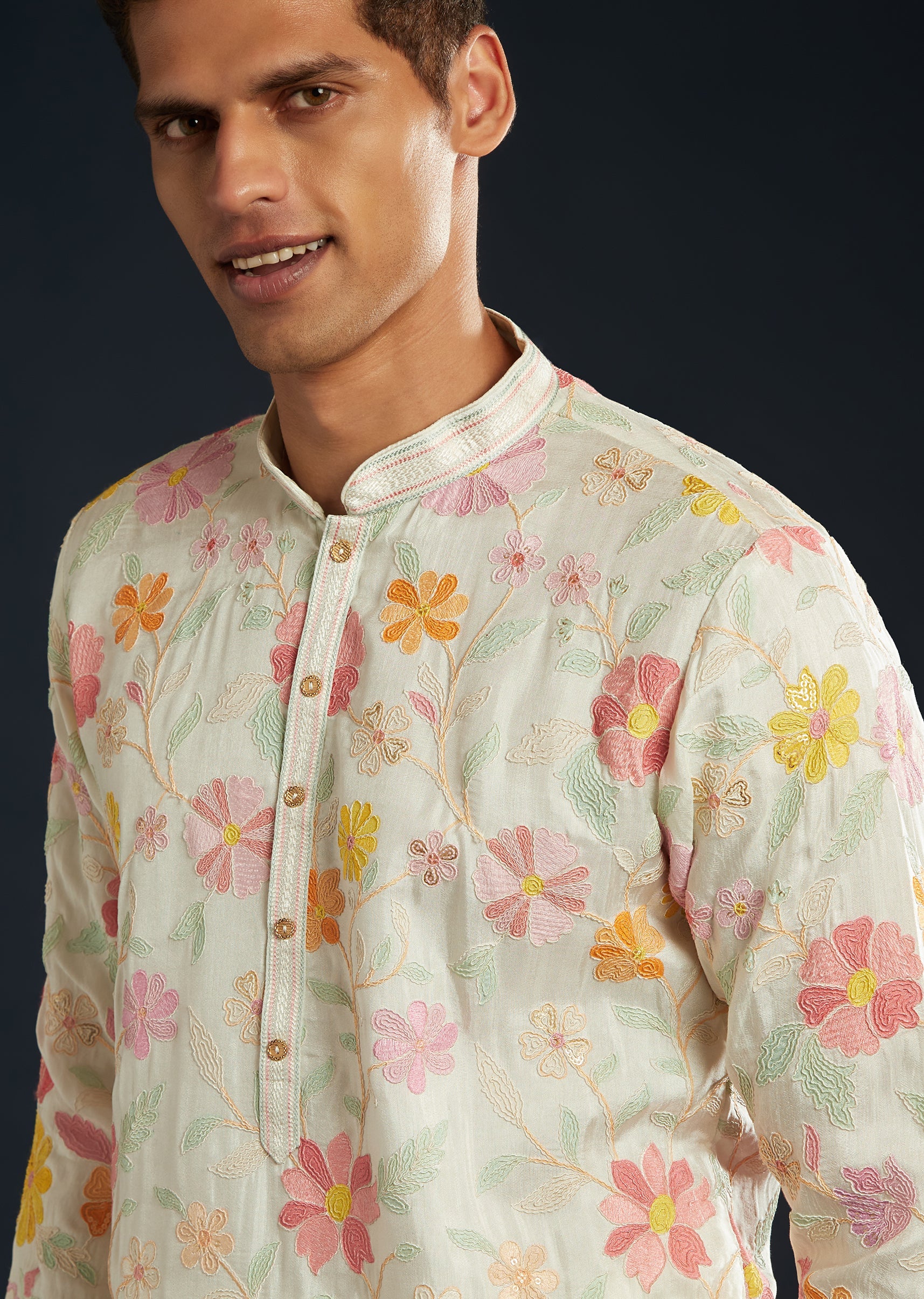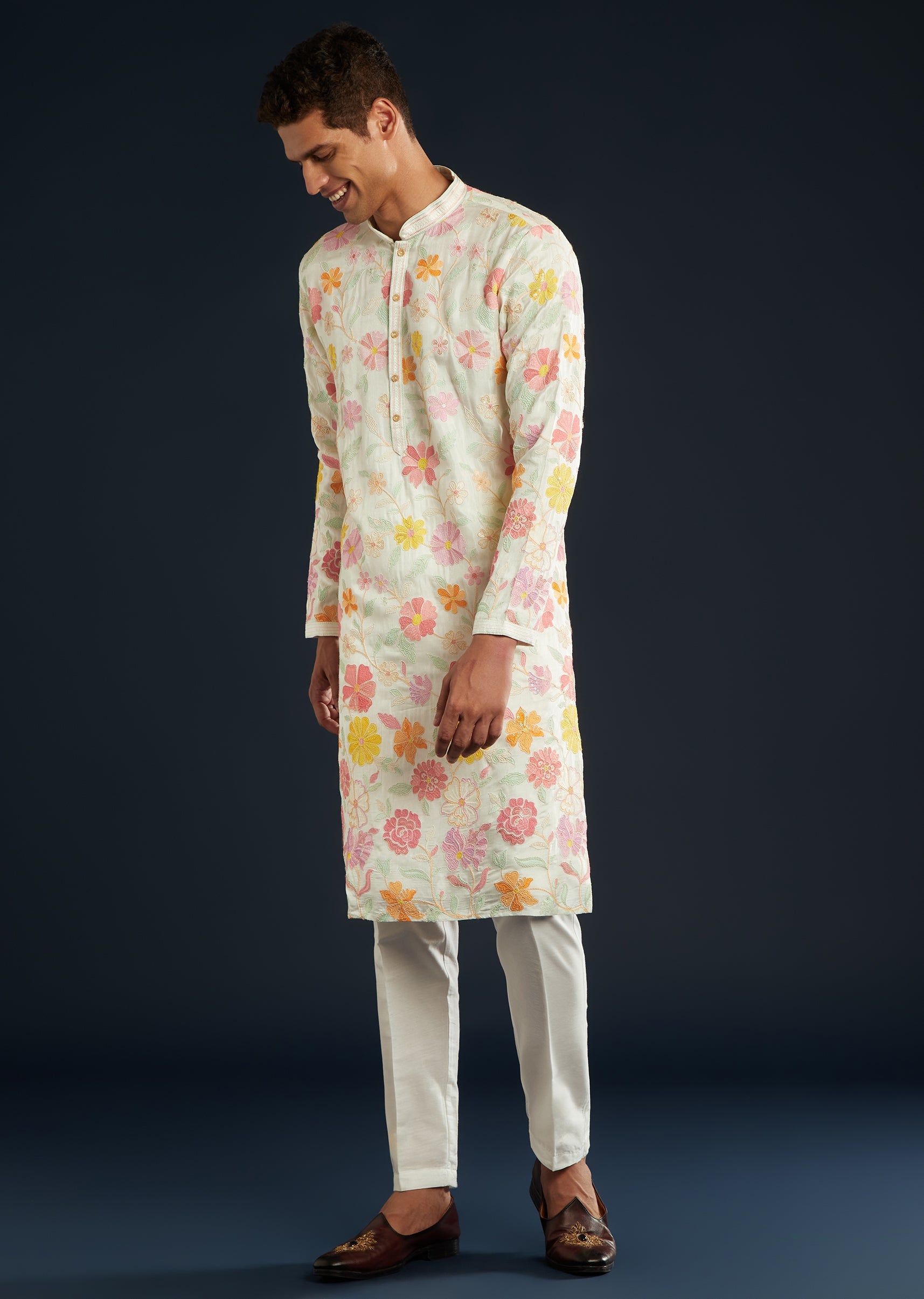 Infuse your wardrobe with elegance in this multi-hue men’s silk kurta set. Vibrant tones and delicate floral detailing create a festive yet refined look, while the soft art silk fabric... More Product Details