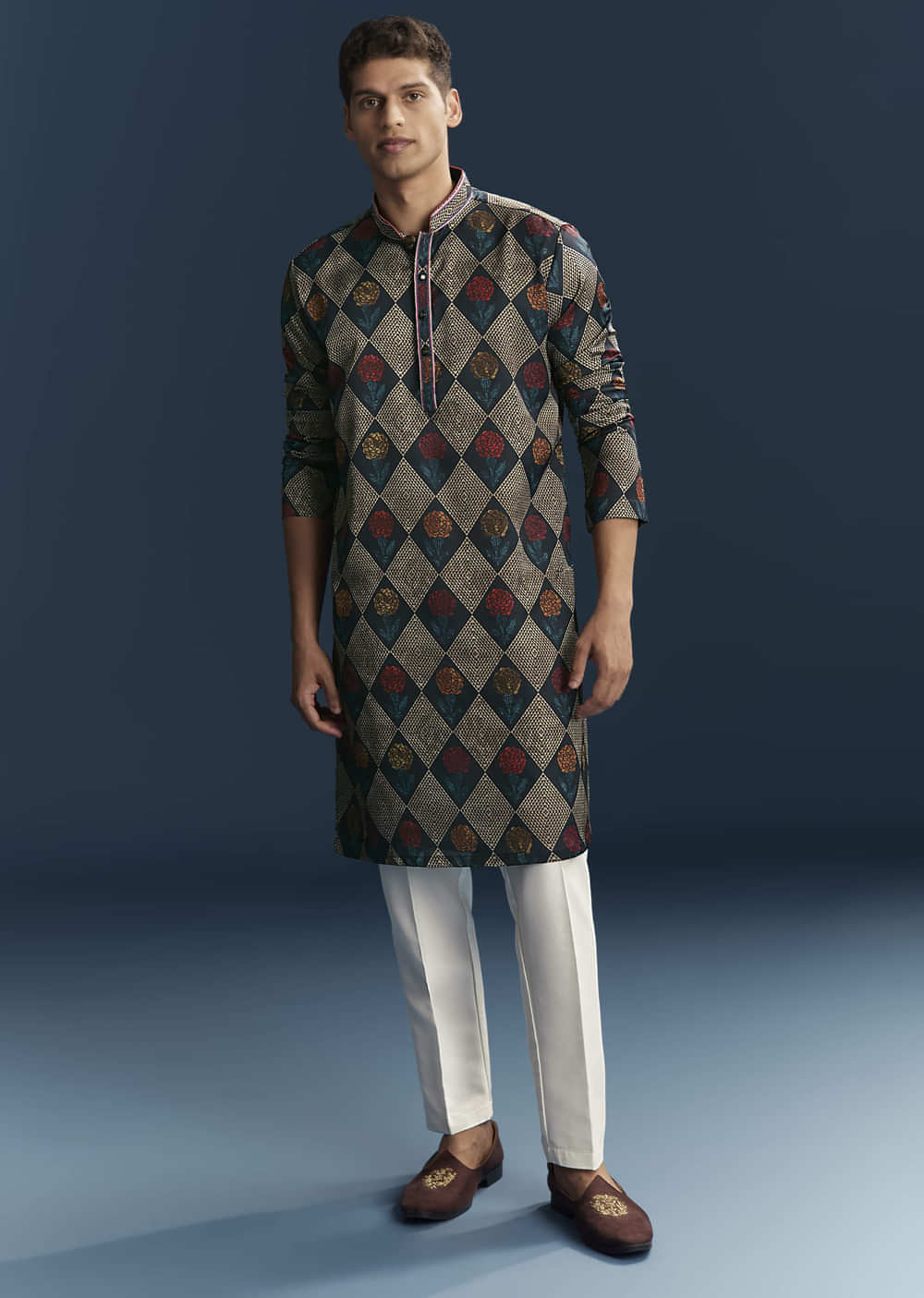 Multicolour Silk Kurta For Men With Geometric And Floral Print