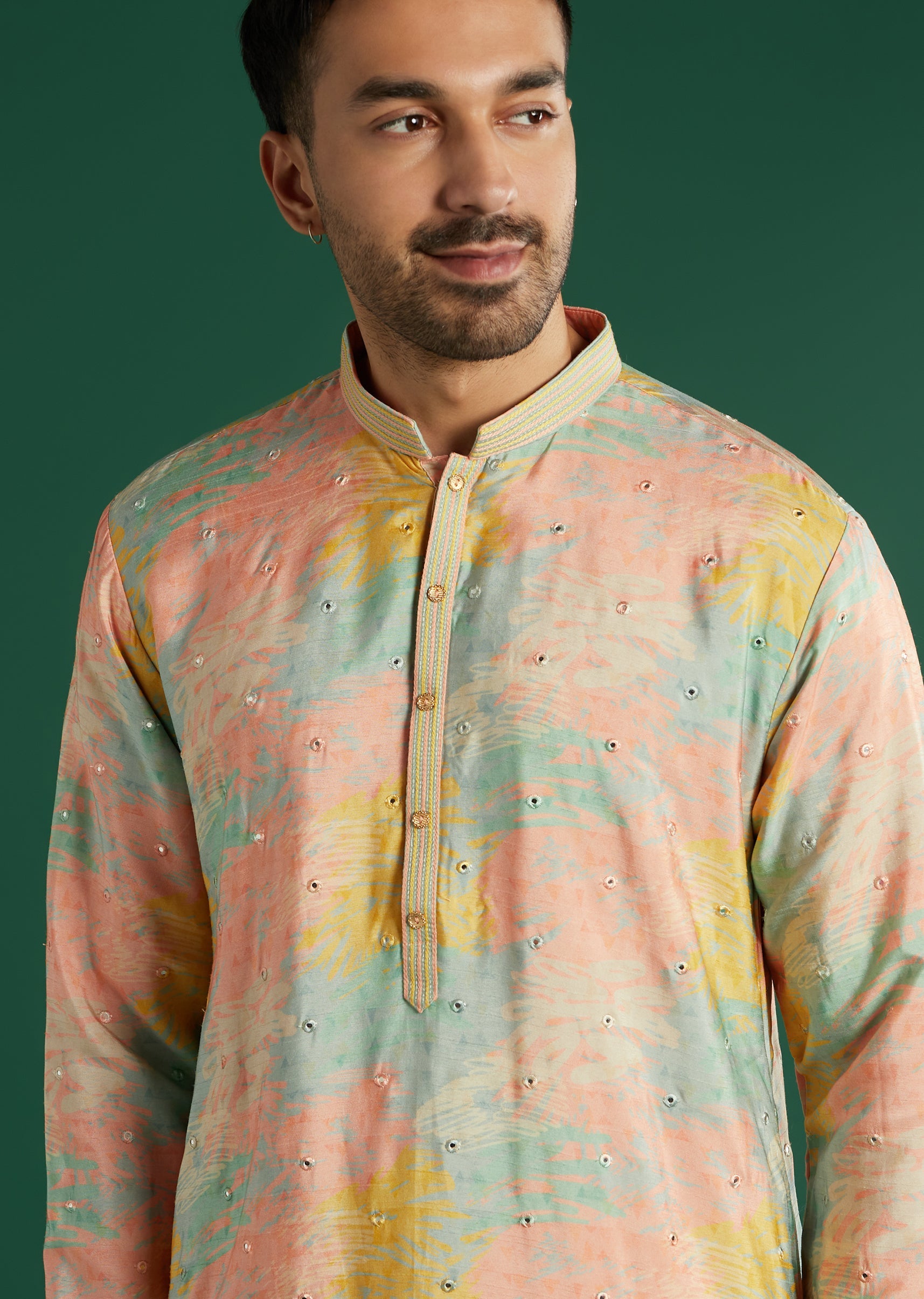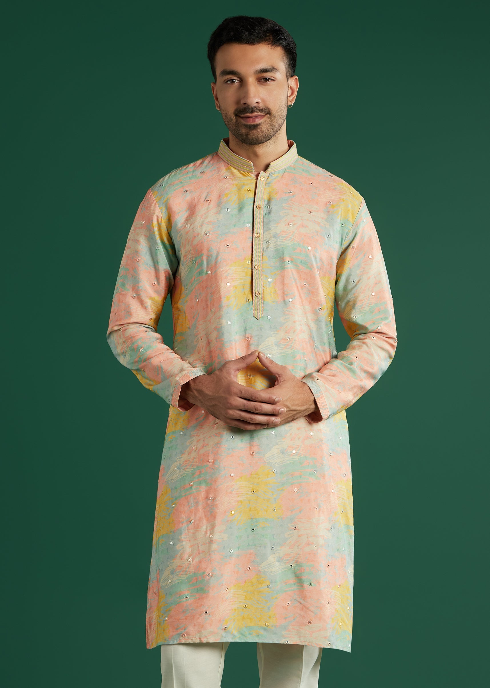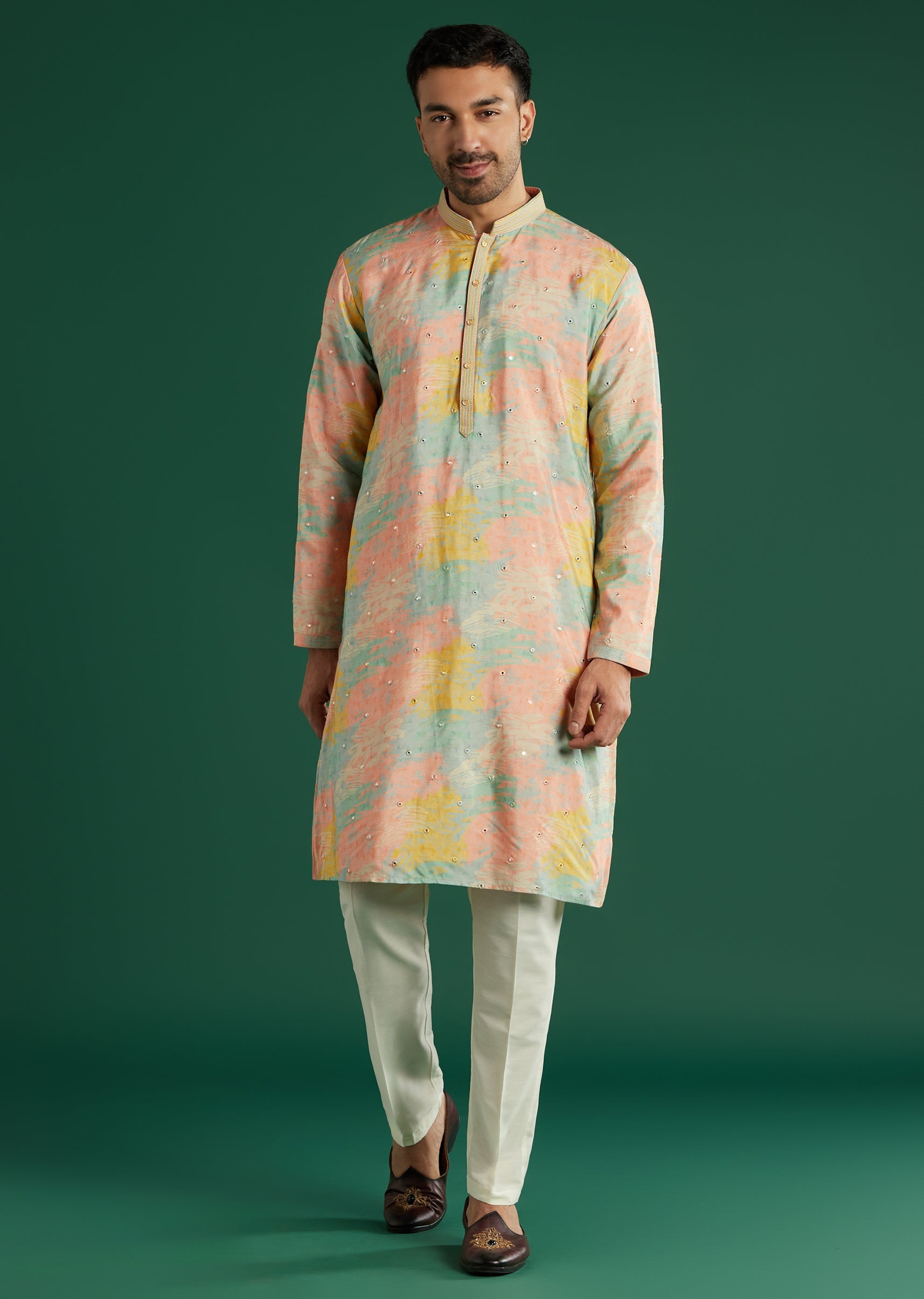 Playful colour meets craft as this multicolour art silk men’s kurta set swirls a soft tie-dye wash in blush, lemon, and powder blue with light mirror accents. The mix feels... More Product Details