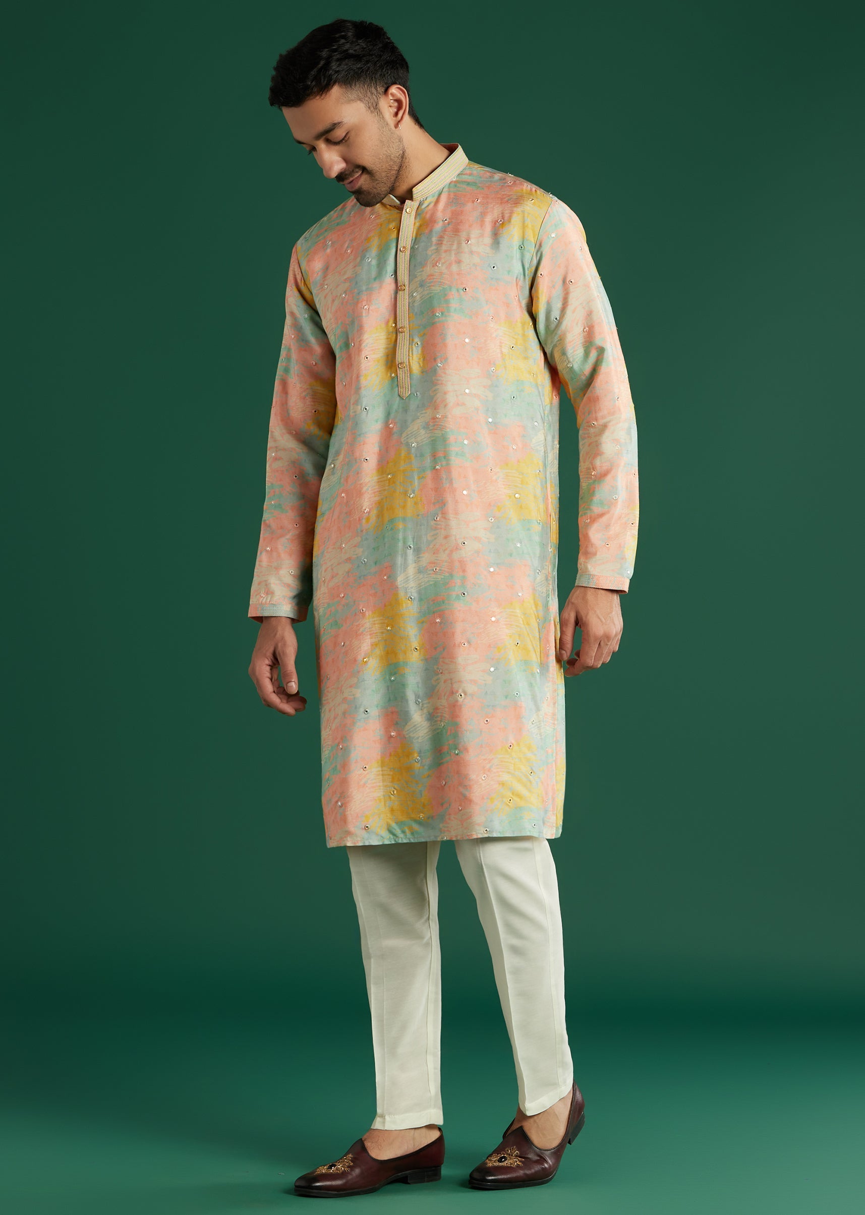 Multicolour Silk Kurta Set For Men With Tie Dye And Mirror Work