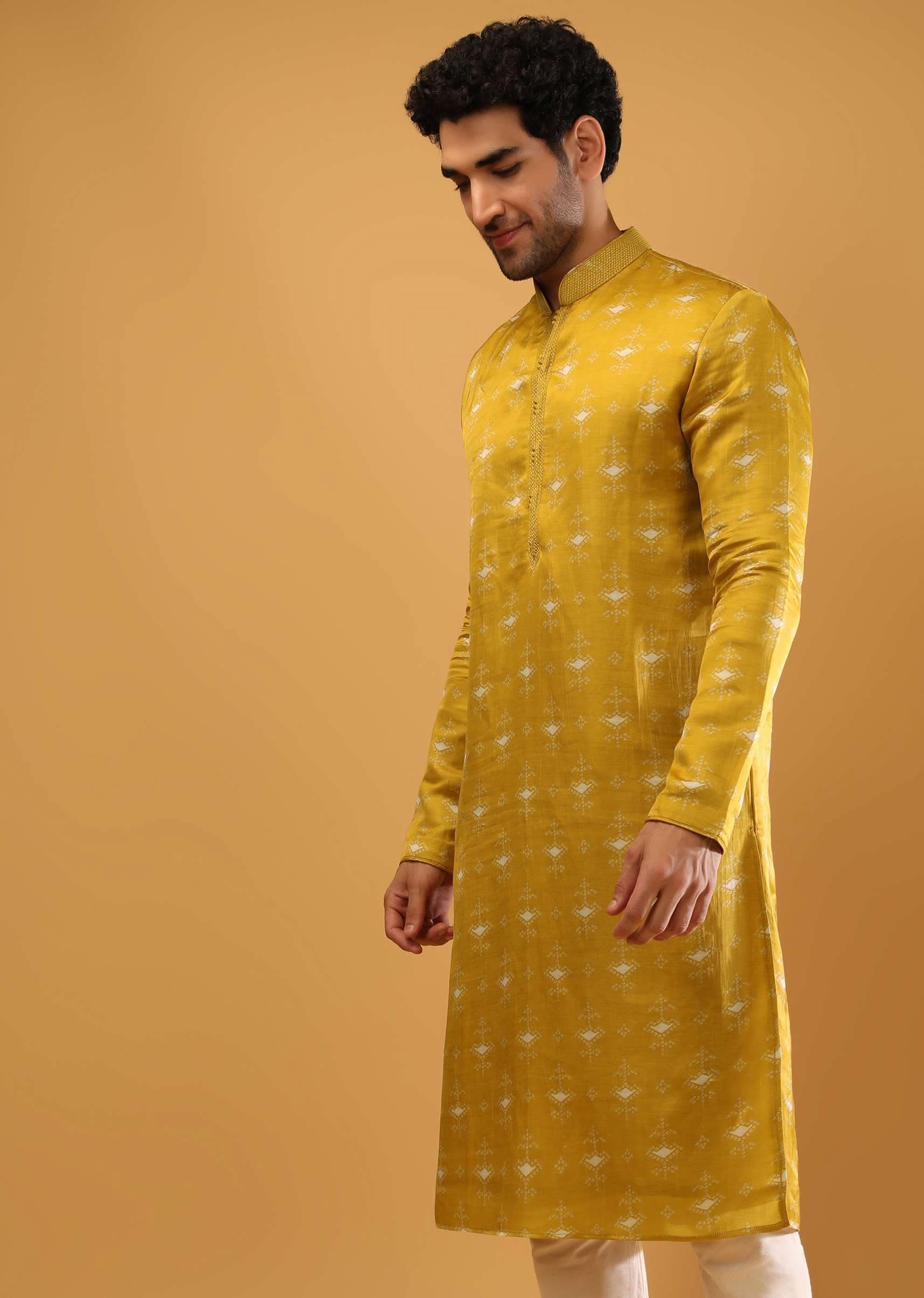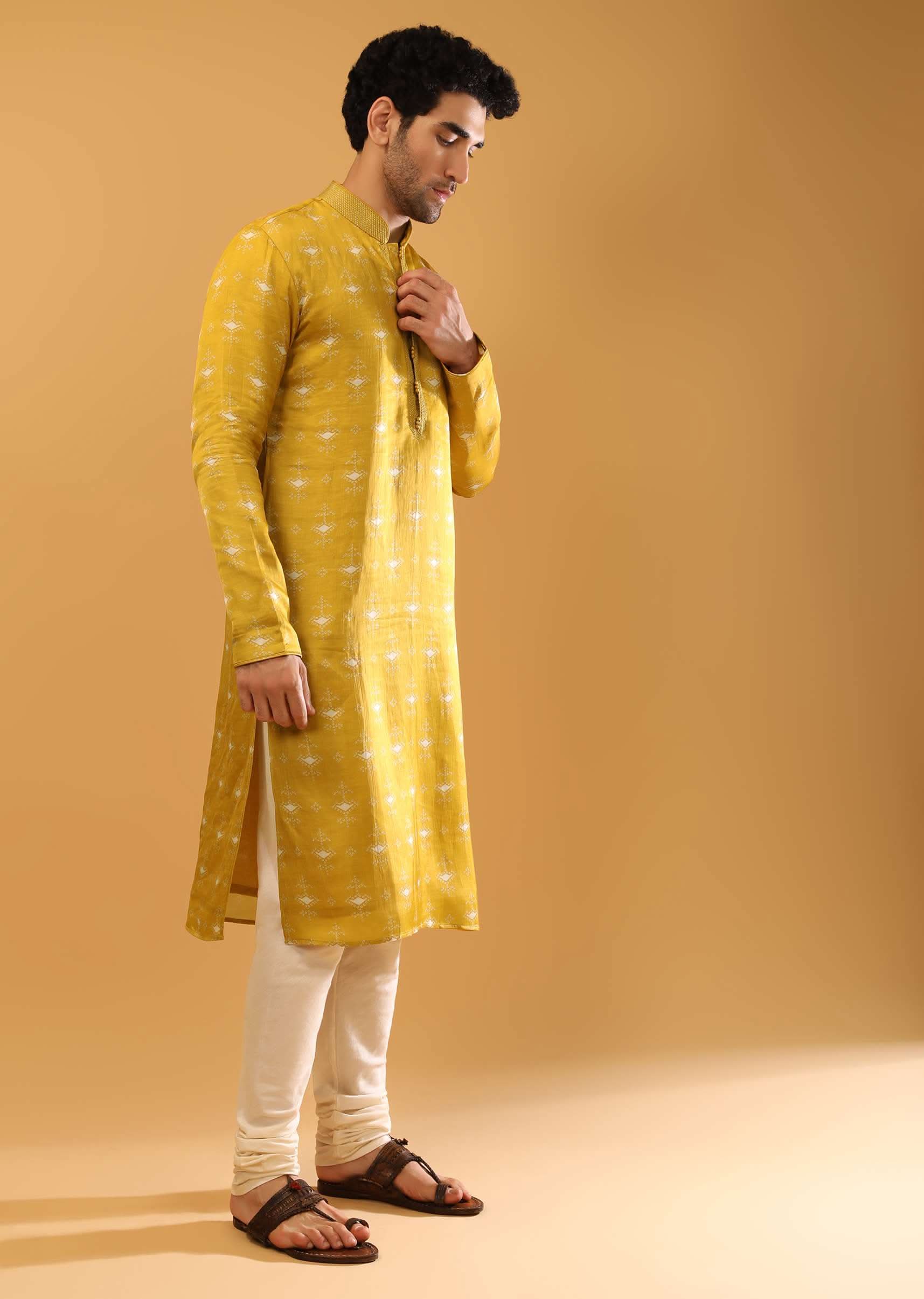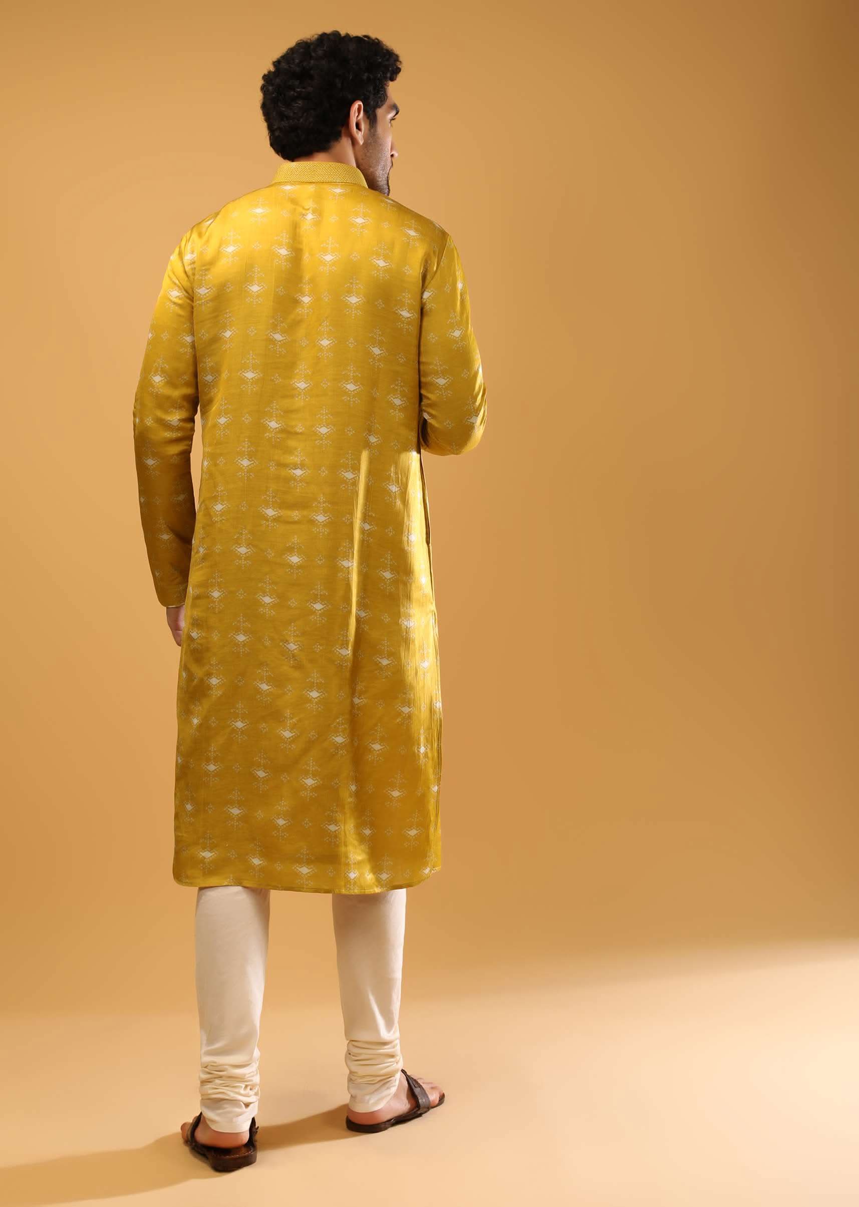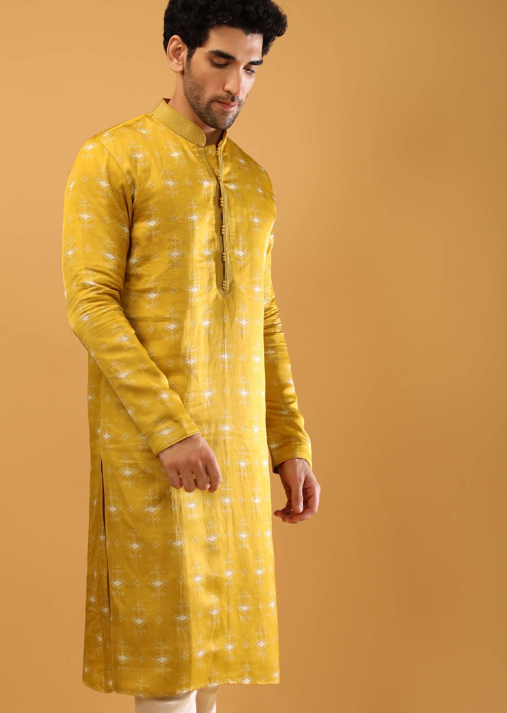 Mustard Kurta Set In Silk With Bandhani Buttis