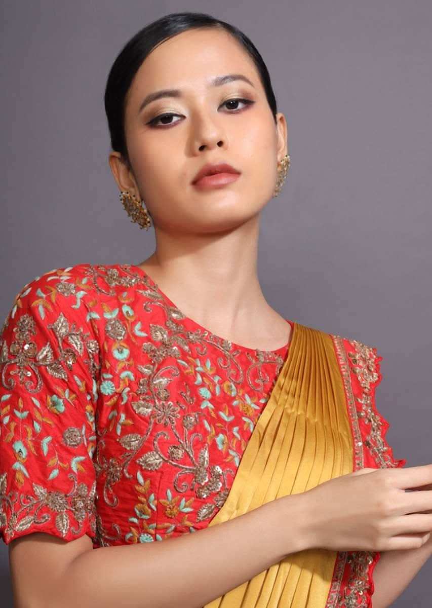 - Matched with a contrasting red blouse in silk with floral jaal embroidery.
