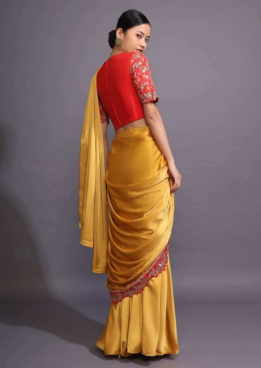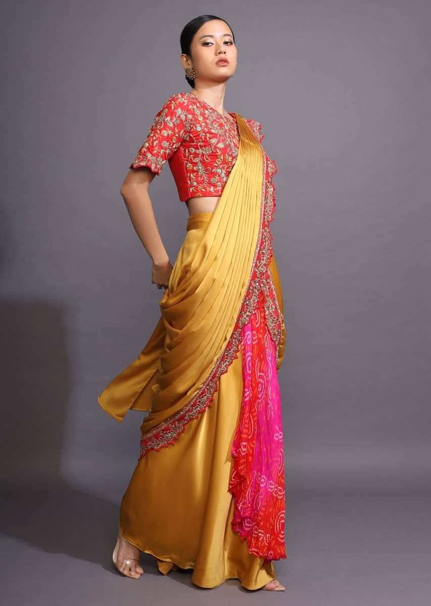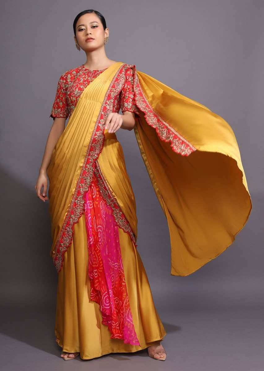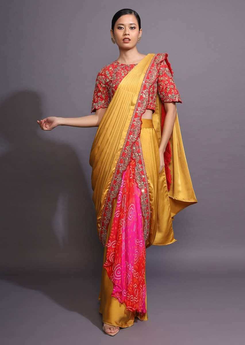 Mustard Ready Pleated Saree With Bandhani Printed Layer And Red Scalloped Border With Zari Accents Online - Kalki Fashion