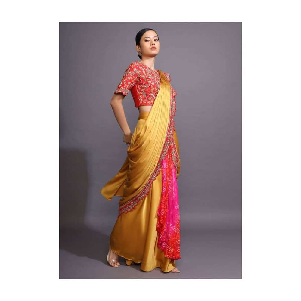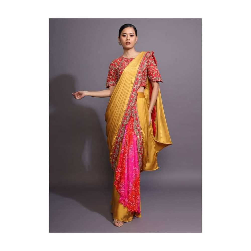 - Mustard yellow ready pleated saree in milano satin with a bandhani printed layer on the pleats.