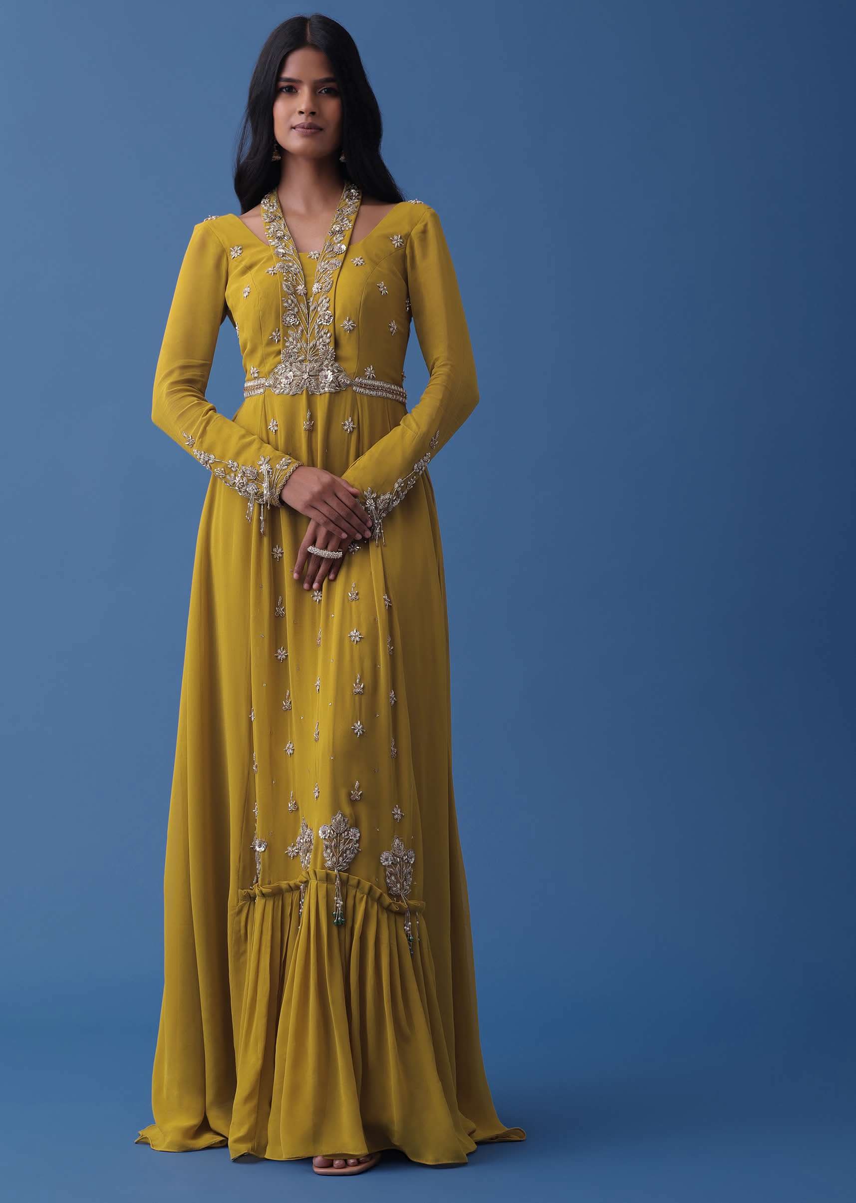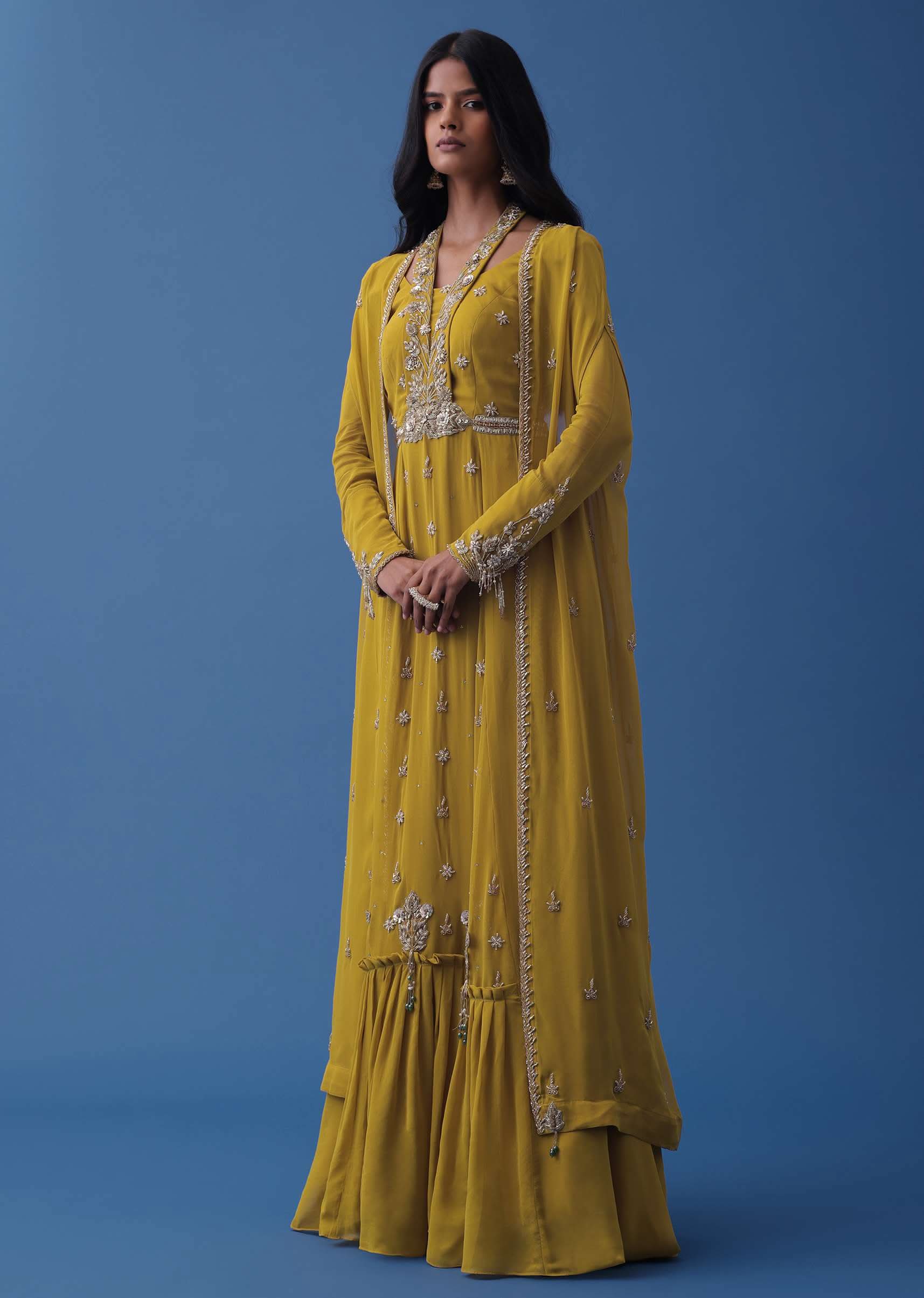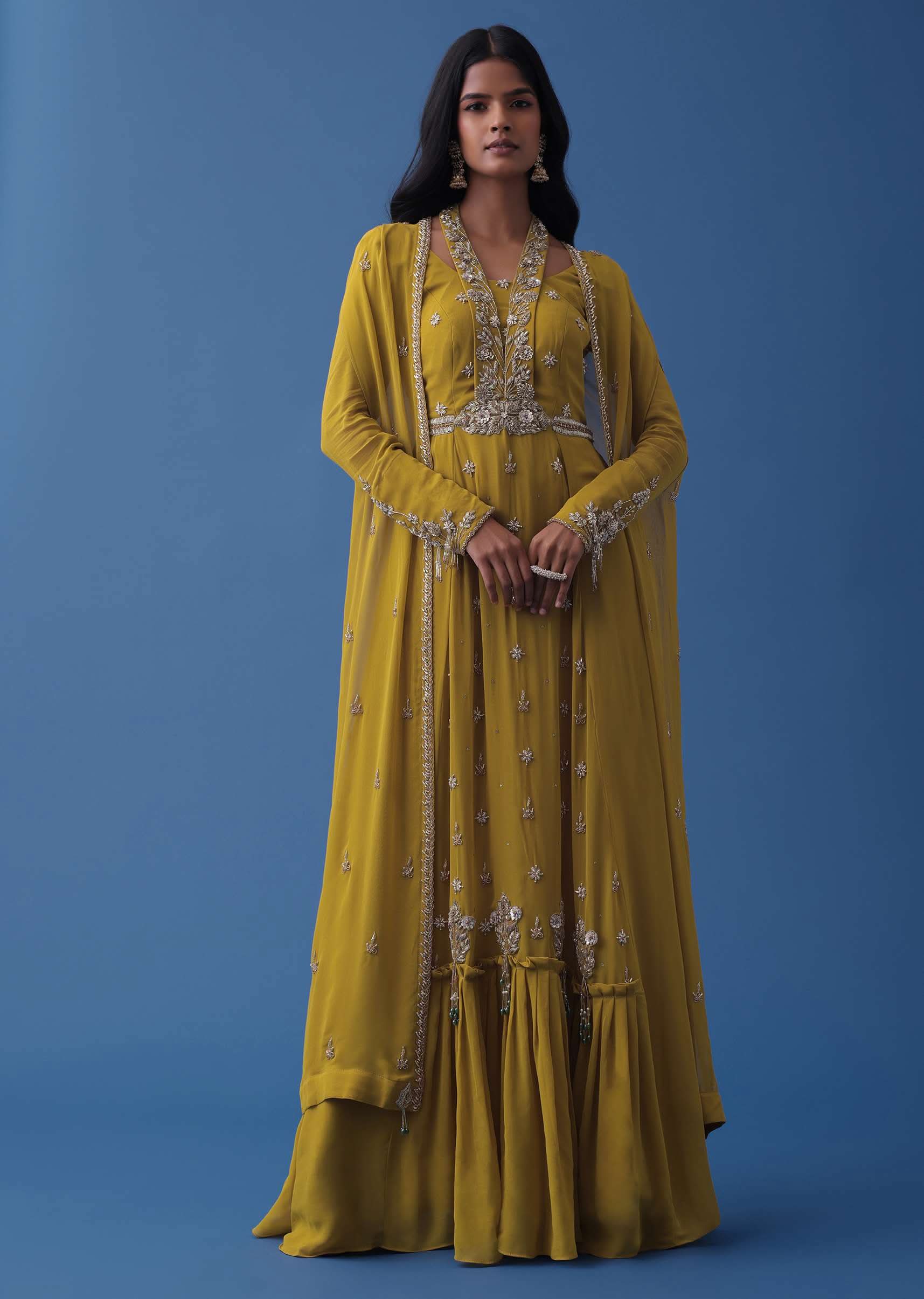 - Make a statement with the stunning mustard yellow Indowestern dress and shoulder cape in georgette.