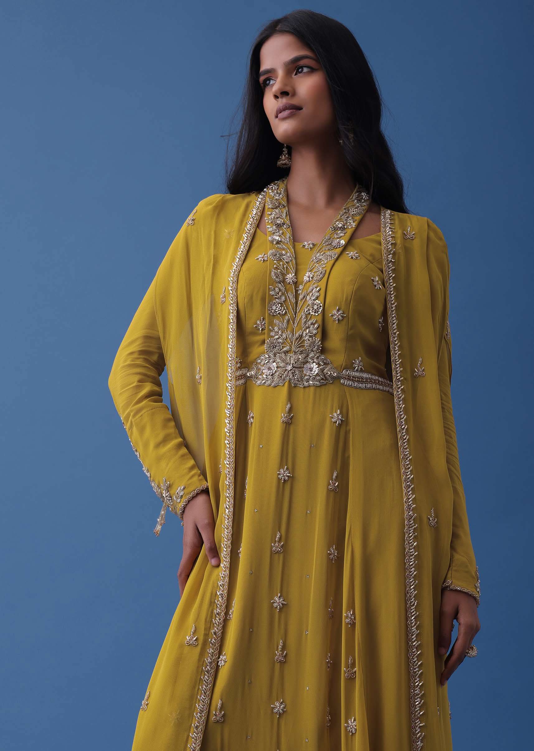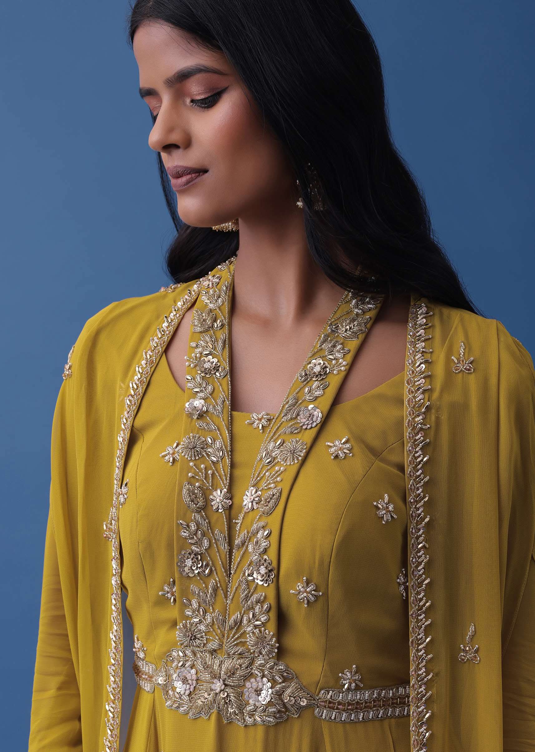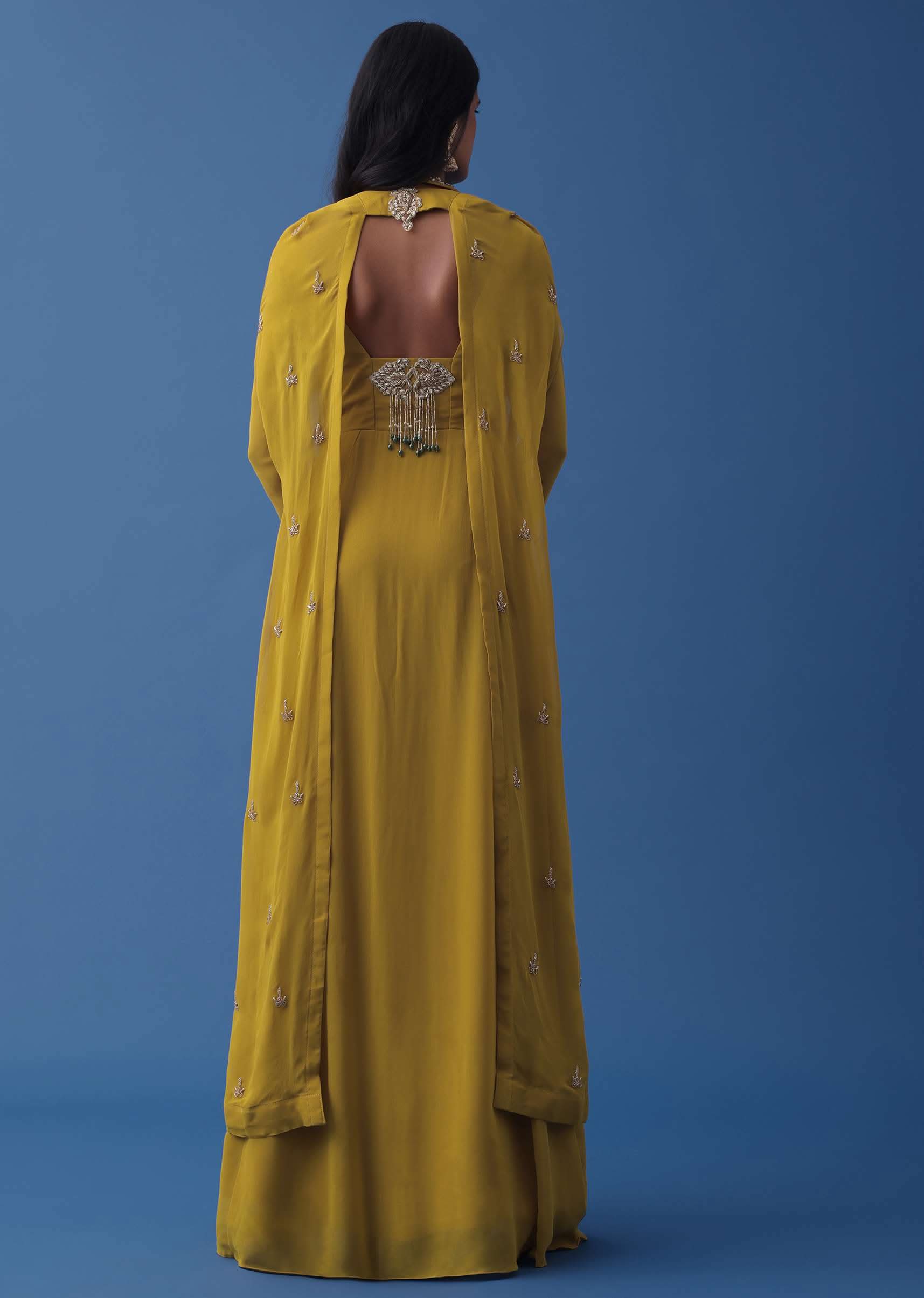 Mustard Yellow Embroidered Indowestern Dress And Cape In Georgette