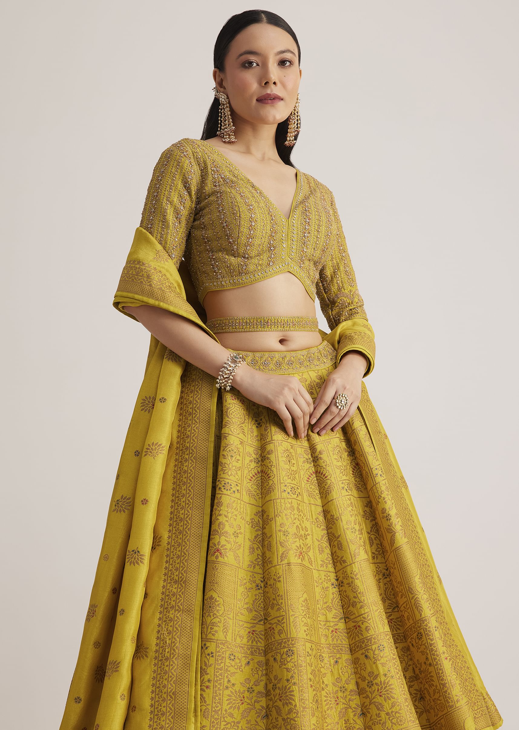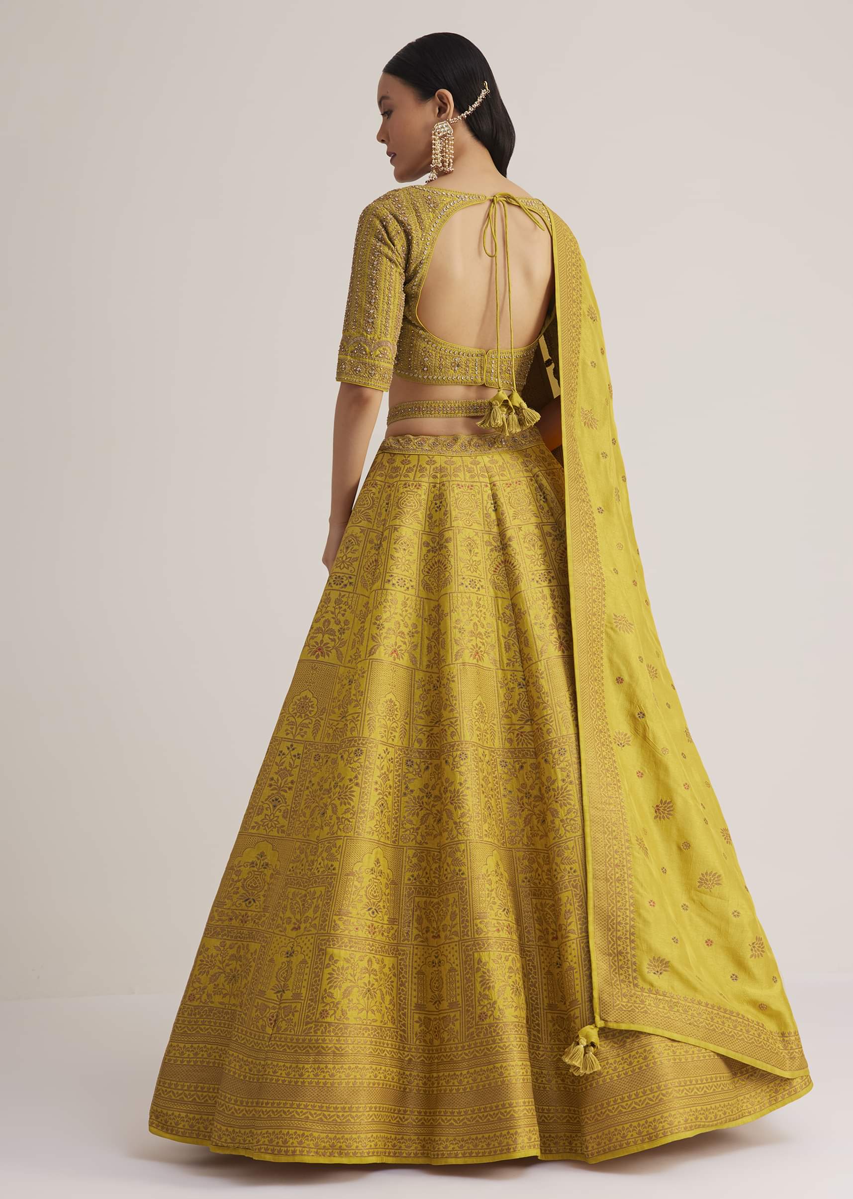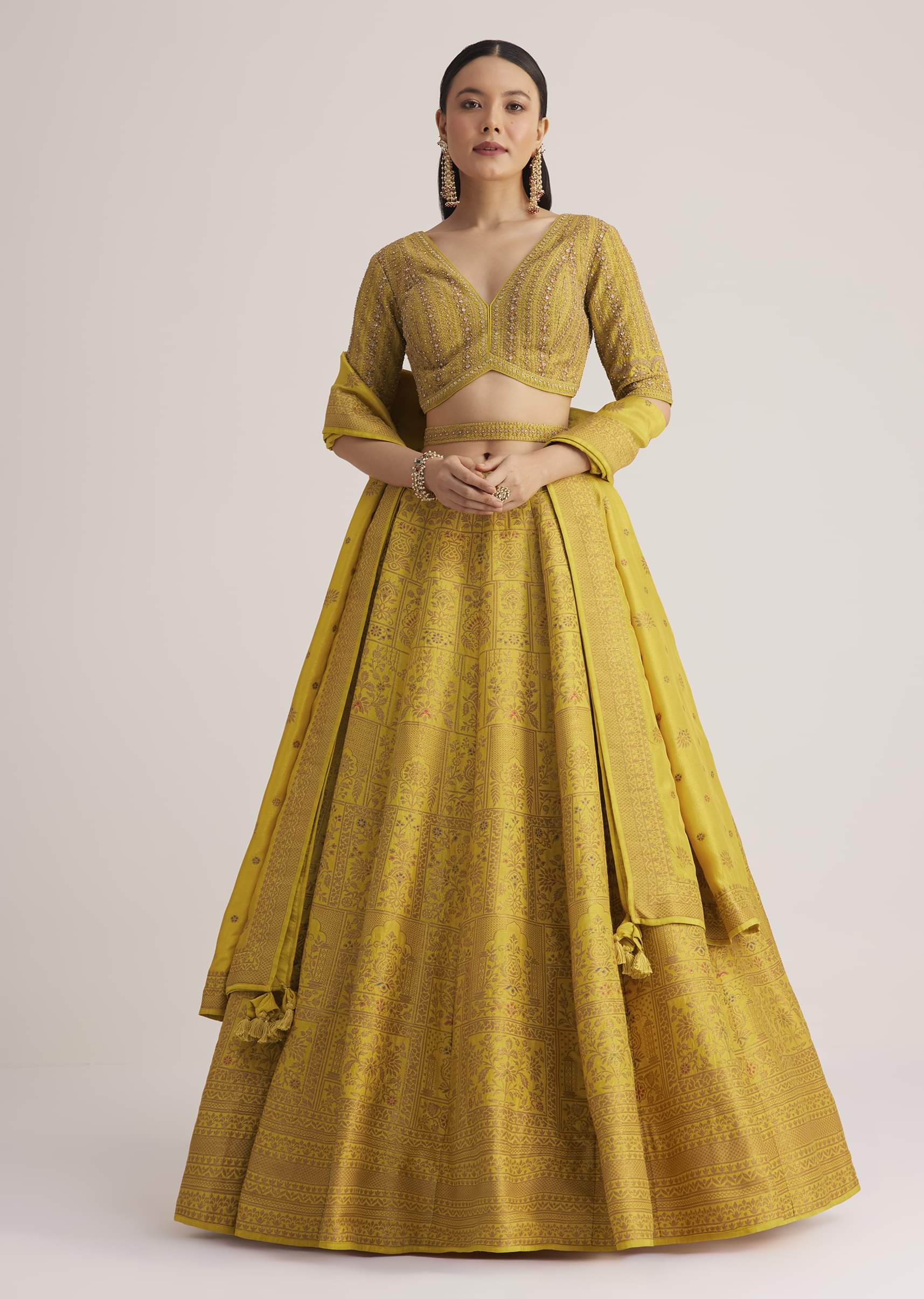 Radiate Festive Elegance With This Mustard Yellow Lehenga Set Intricately Adorned With Detailed Threadwork And Rich Brocade Weave. Ideal For Wedding Functions Like Haldi Sangeet Or Festive Celebrations This Outfit Features A Structured Vneck Blouse Paired With A Beautifully Paneled Lehenga. The Matching Dupatta With Its Embroidered Motifs And Ornate Borders Adds A Regal Touch Completing The Ensemble With Grace And Sophistication. Awarded as the Most Trusted Brand, we're delivering styles you love, just as promised.