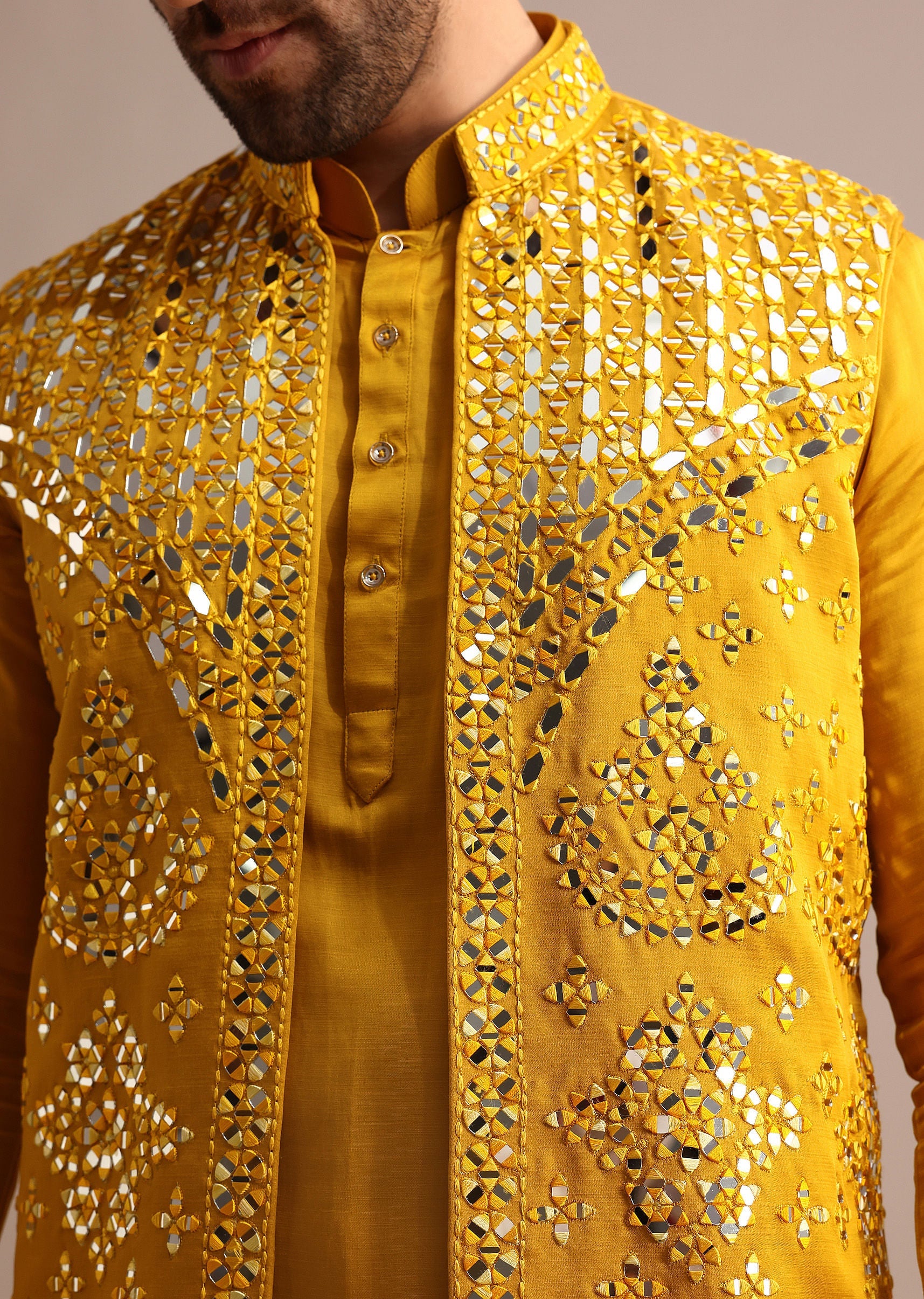 Mustard Yellow Mirror Embroidered Silk Kurta Jacket Set For Men