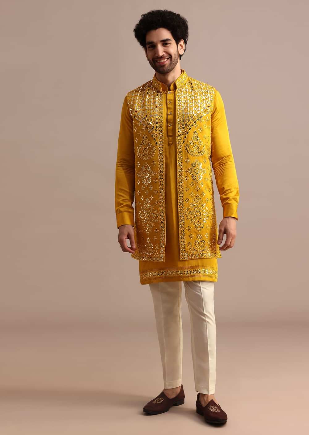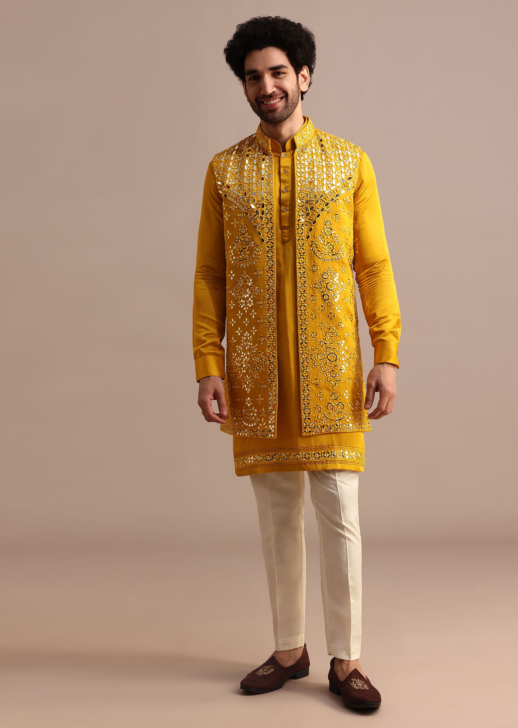 - This stunning ensemble features a rich mustard yellow silk kurta adorned with intricate mirror embroidery catching light with every movement.