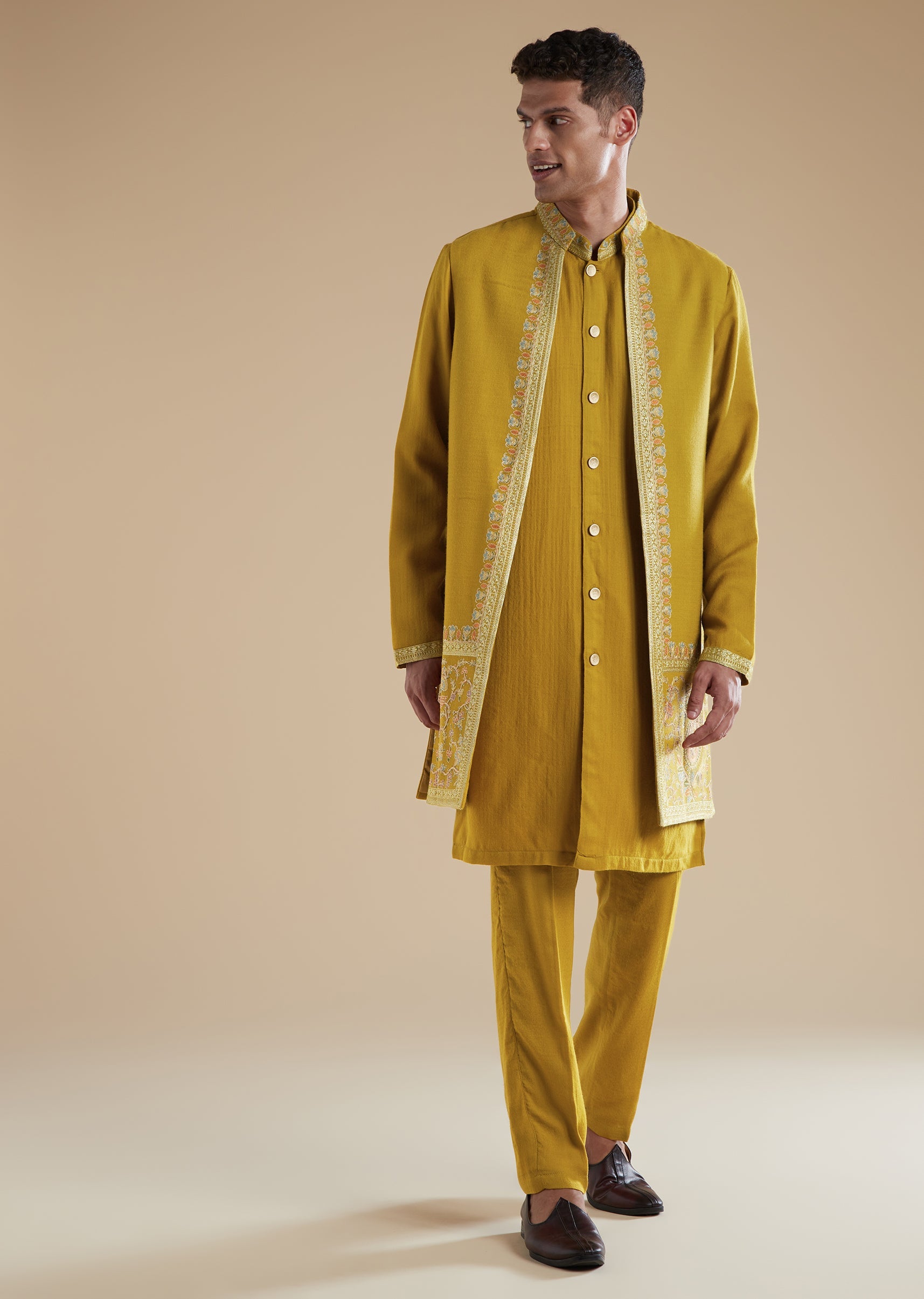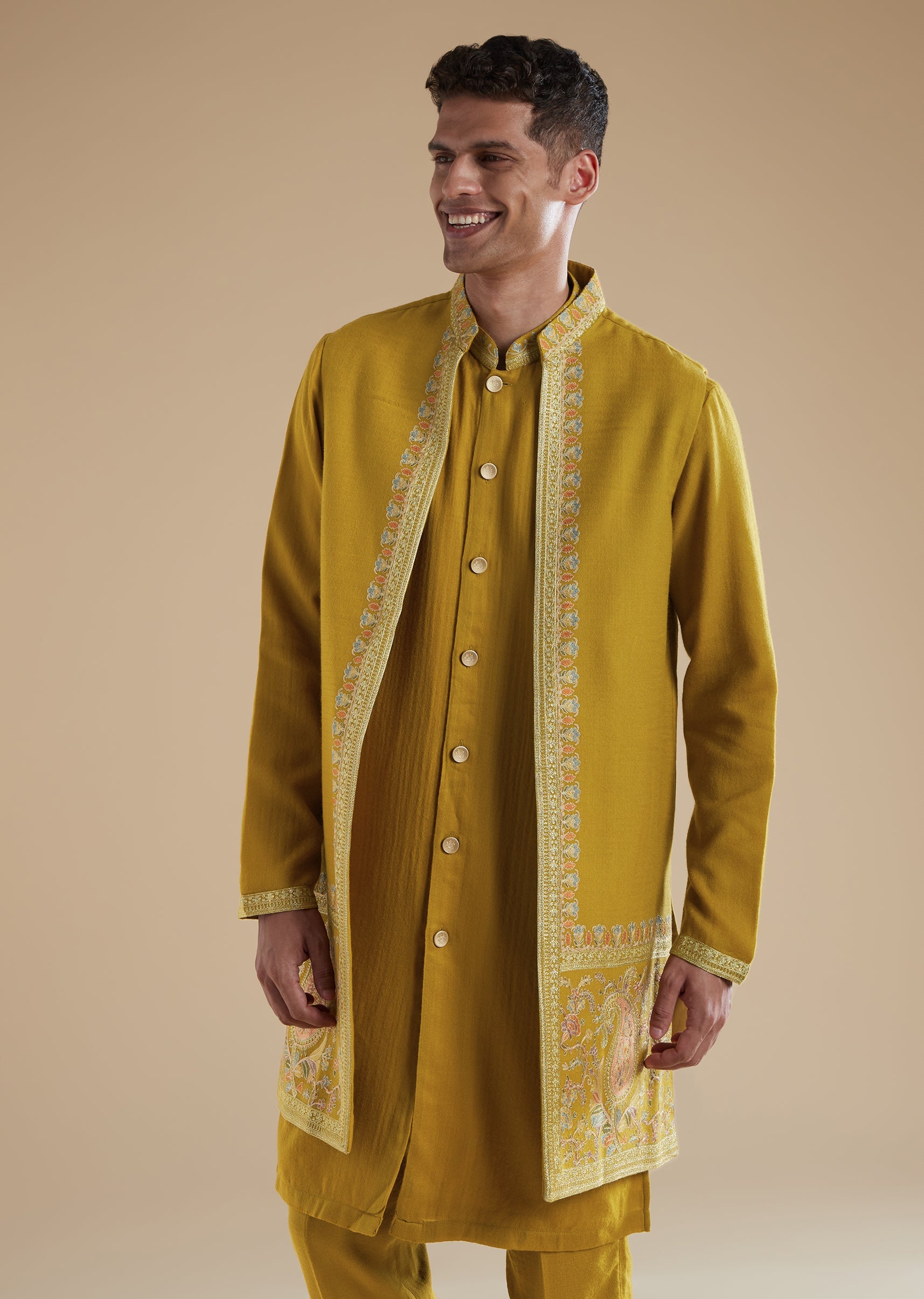 Warm and elegant, this mustard yellow kurta jacket set is crafted in soft pashmina fabric with a smooth silk blend for a rich and festive appeal. Perfect for haldi and engagement celebrations, it is an ideal choice for a groom’s father seeking a refined and traditional look. The ensemble features delicate thread and resham detailing that adds subtle texture and charm. Designed with a mandarin collar, full sleeves, and front button closures on both the kurta and the bottoms, it offers a polished and graceful silhouette. The matching jacket completes the set with added structure and sophistication. Awarded as the Most Trusted Brand, we're delivering styles you love, just as promised.