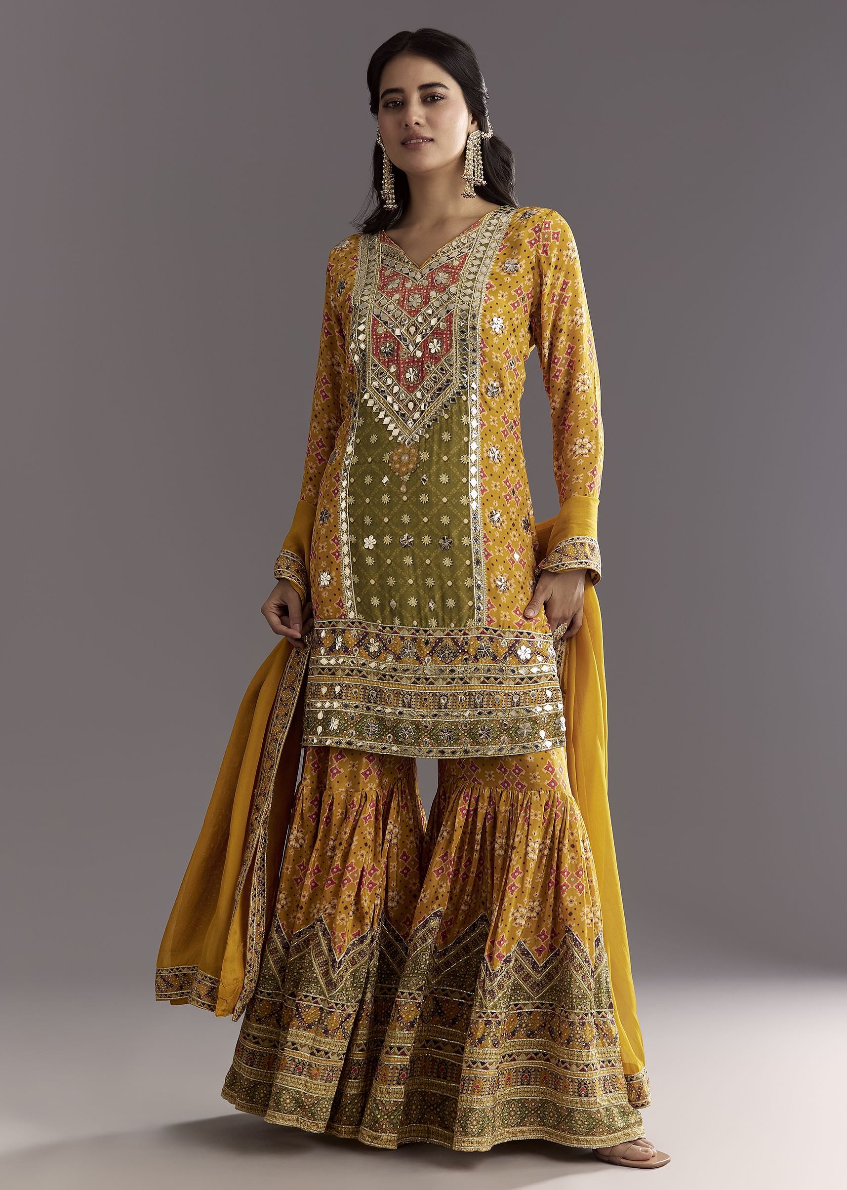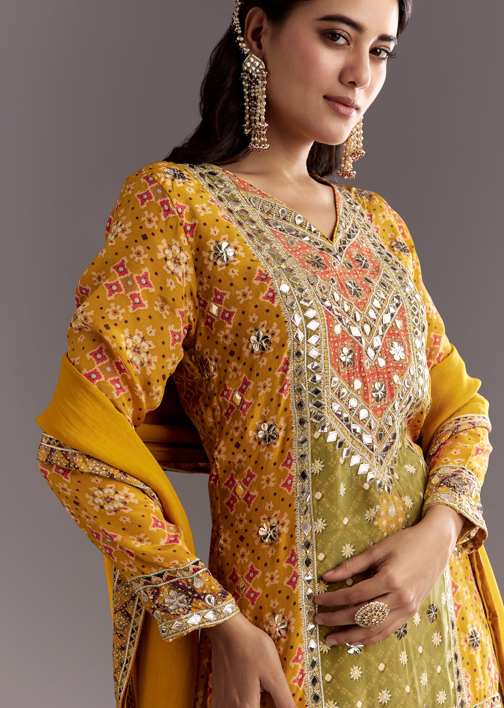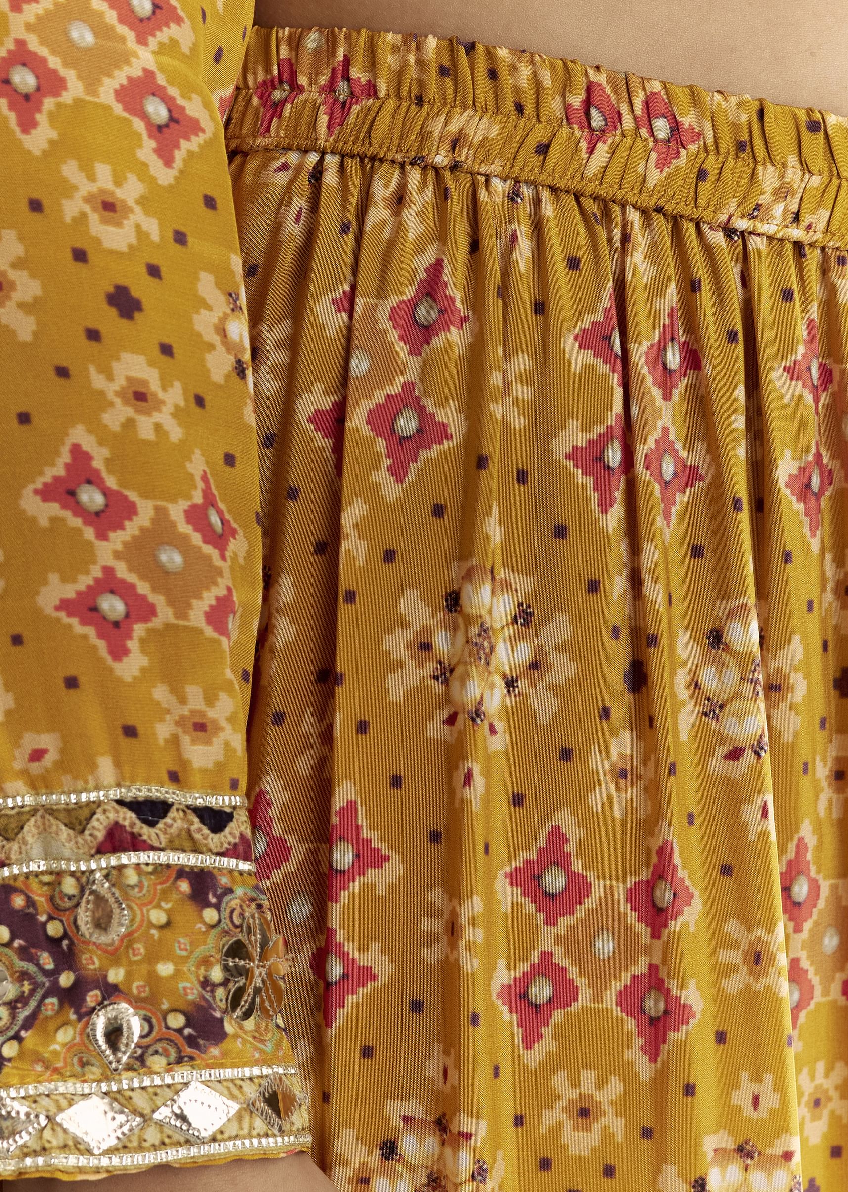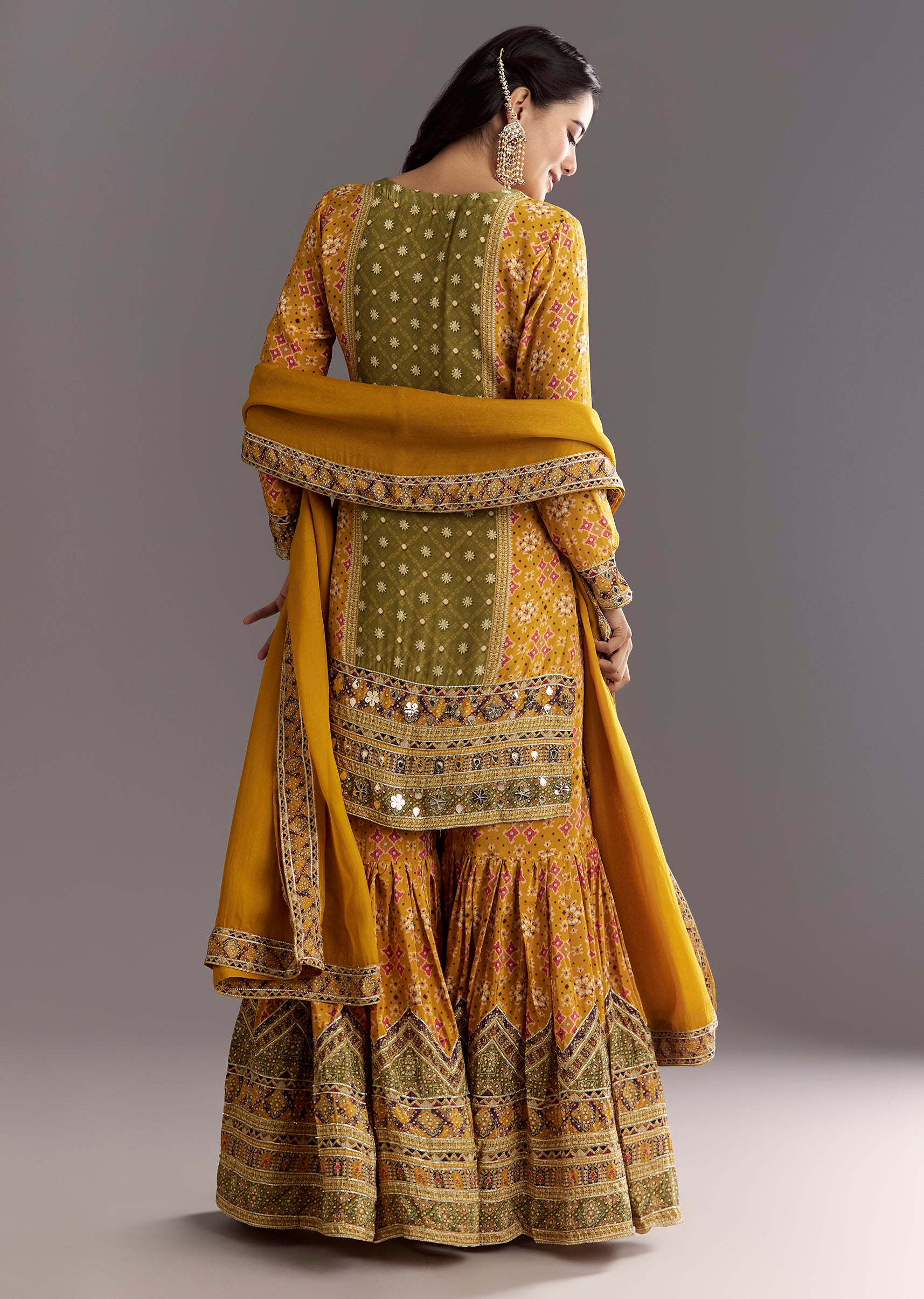 Mustard Yellow Patola Printed Kurta Sharara Suit With Organza Dupatta