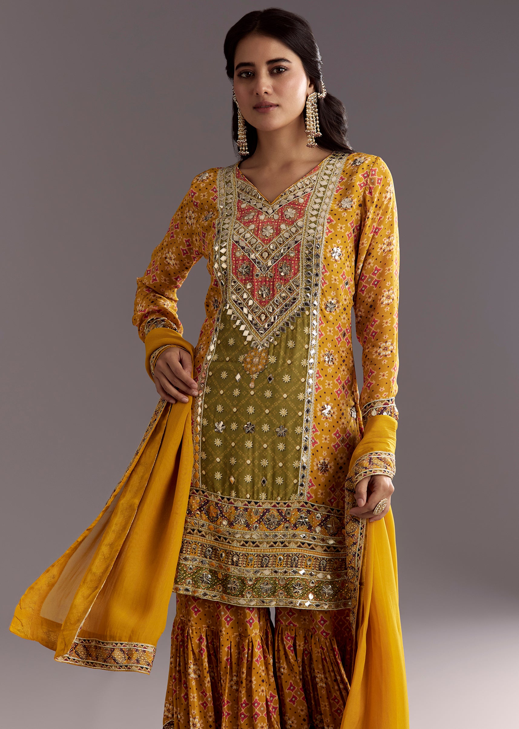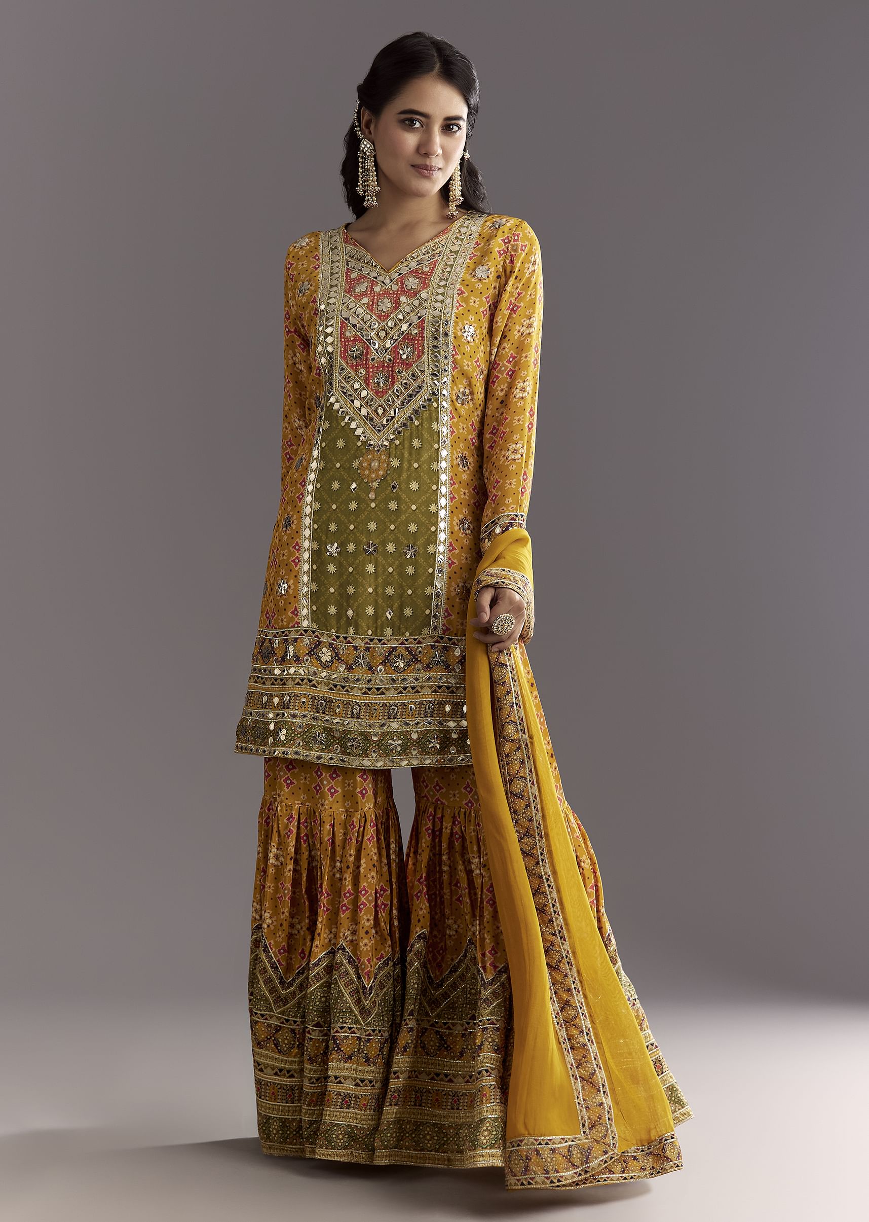 Wrapped in patola patterns and leather detailing, this yellow crepe kurta-sharara set with organza dupatta speaks of vibrant haldi ceremonies.Standard Lenght of Sharara is 41 inches Awarded as the Most... More Product Details