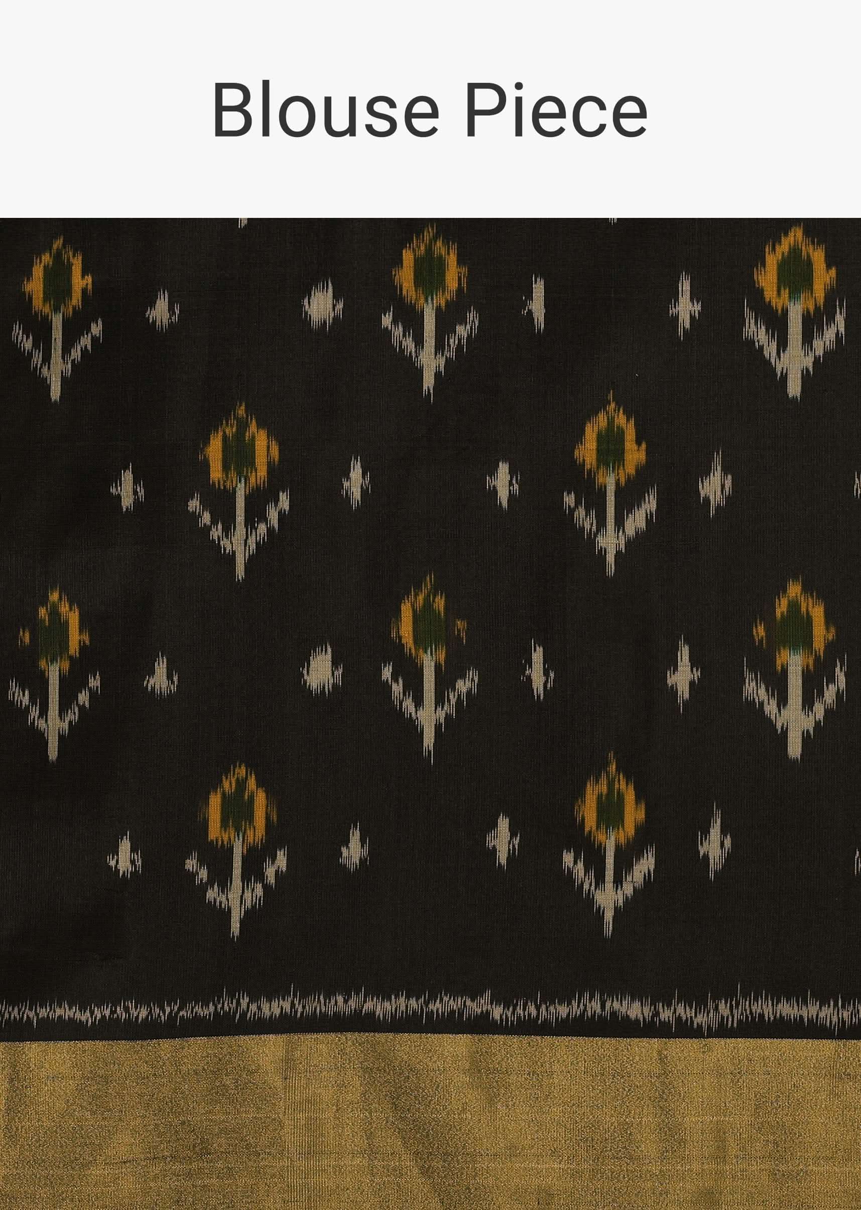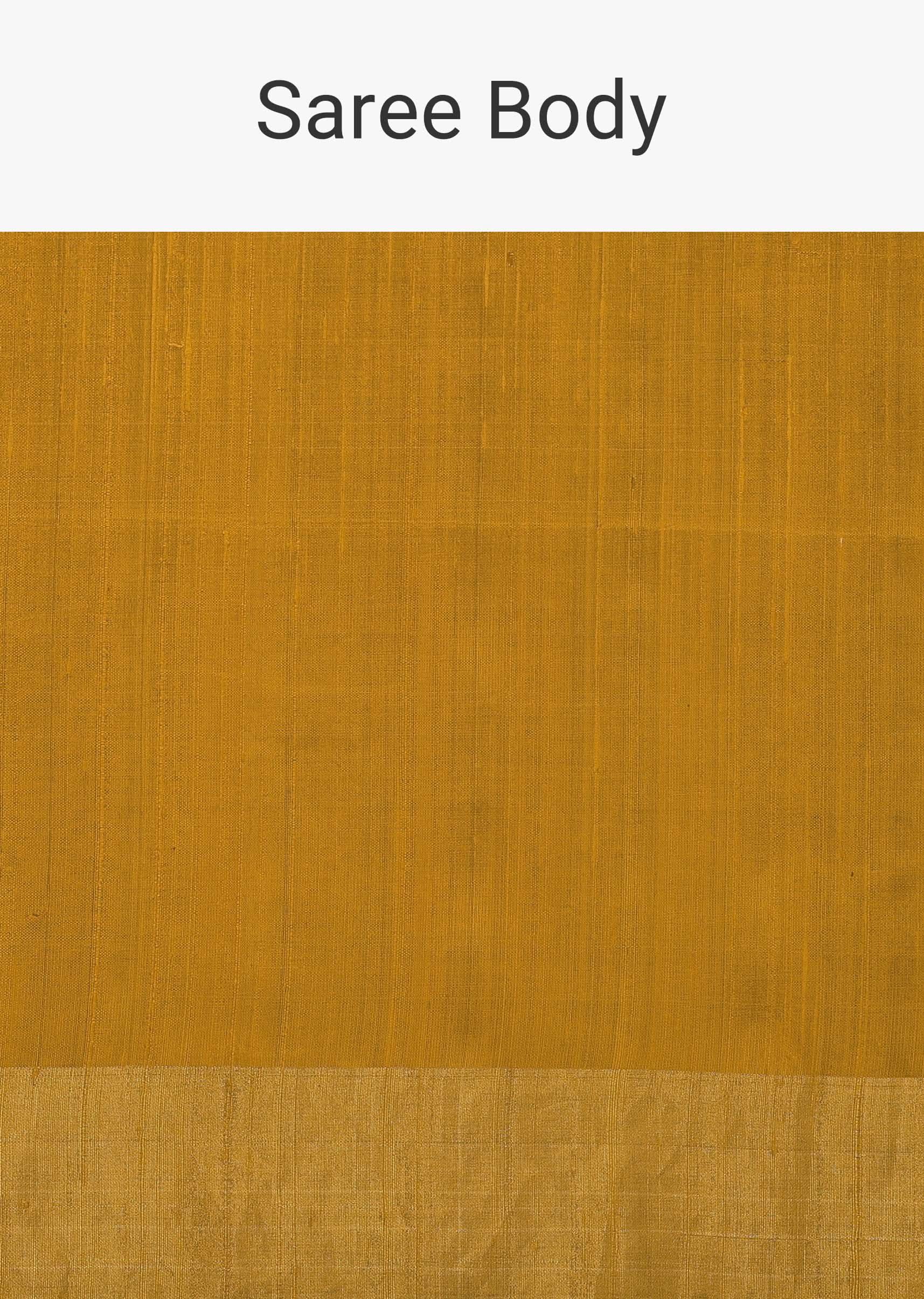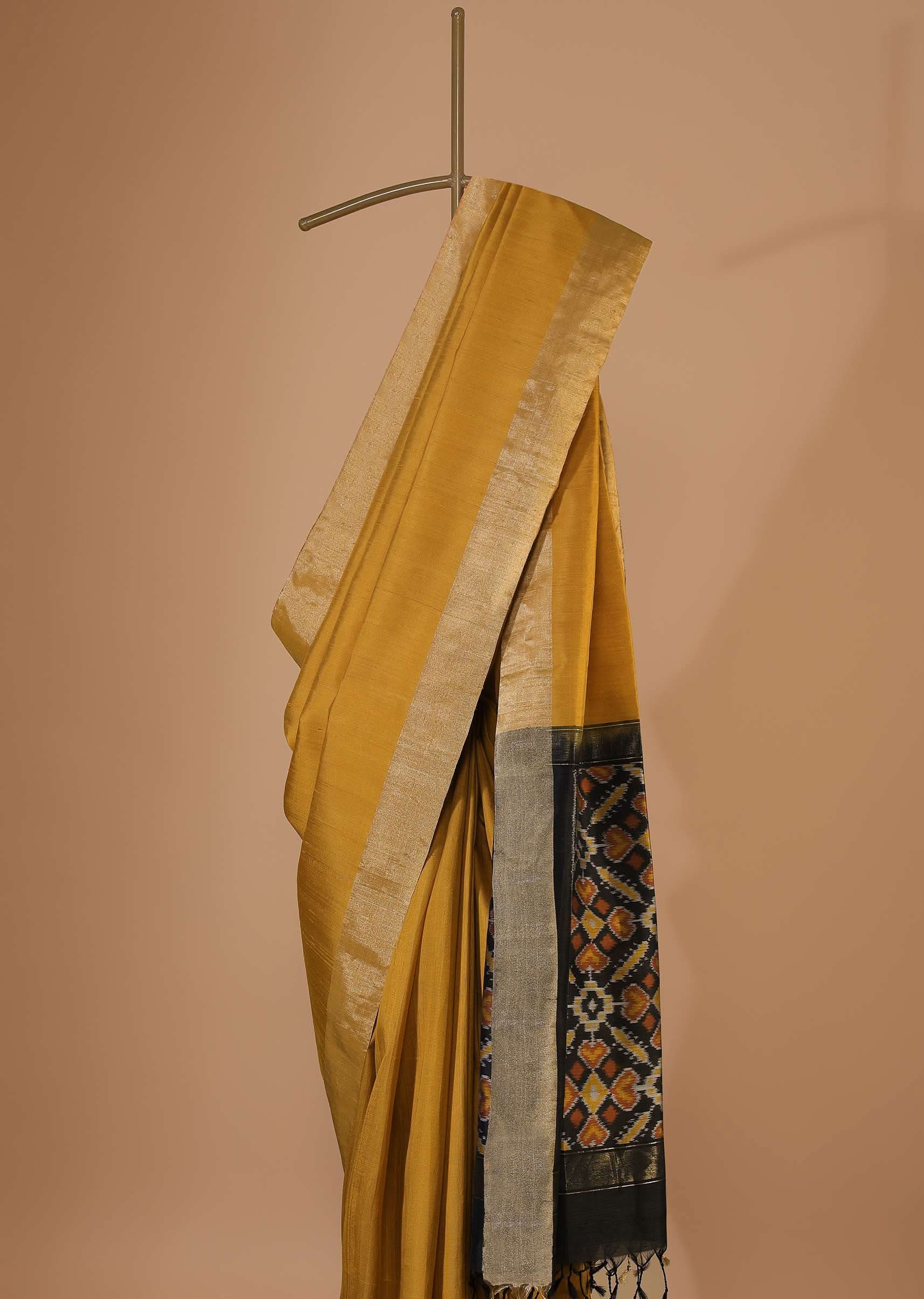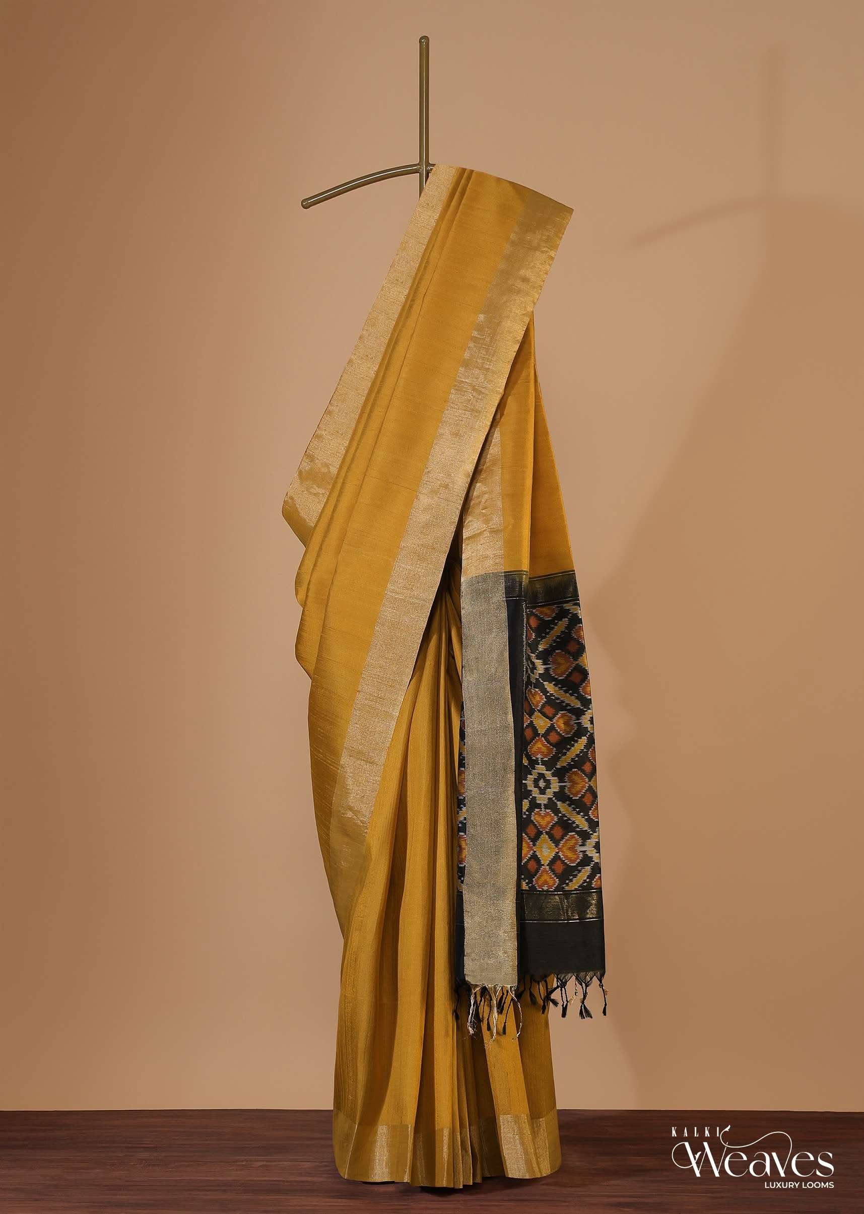 - Our mustard yellow album south silk saree with woven patola pallu in black colour.