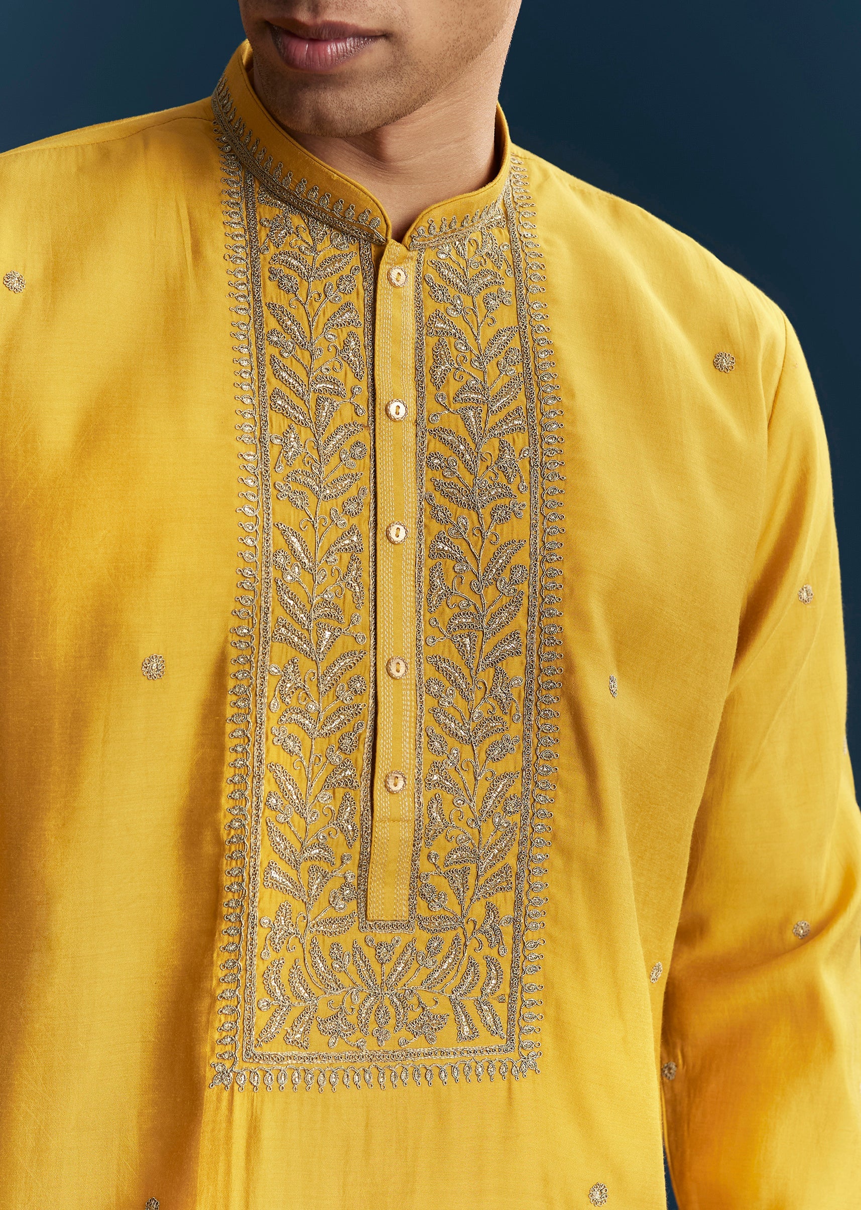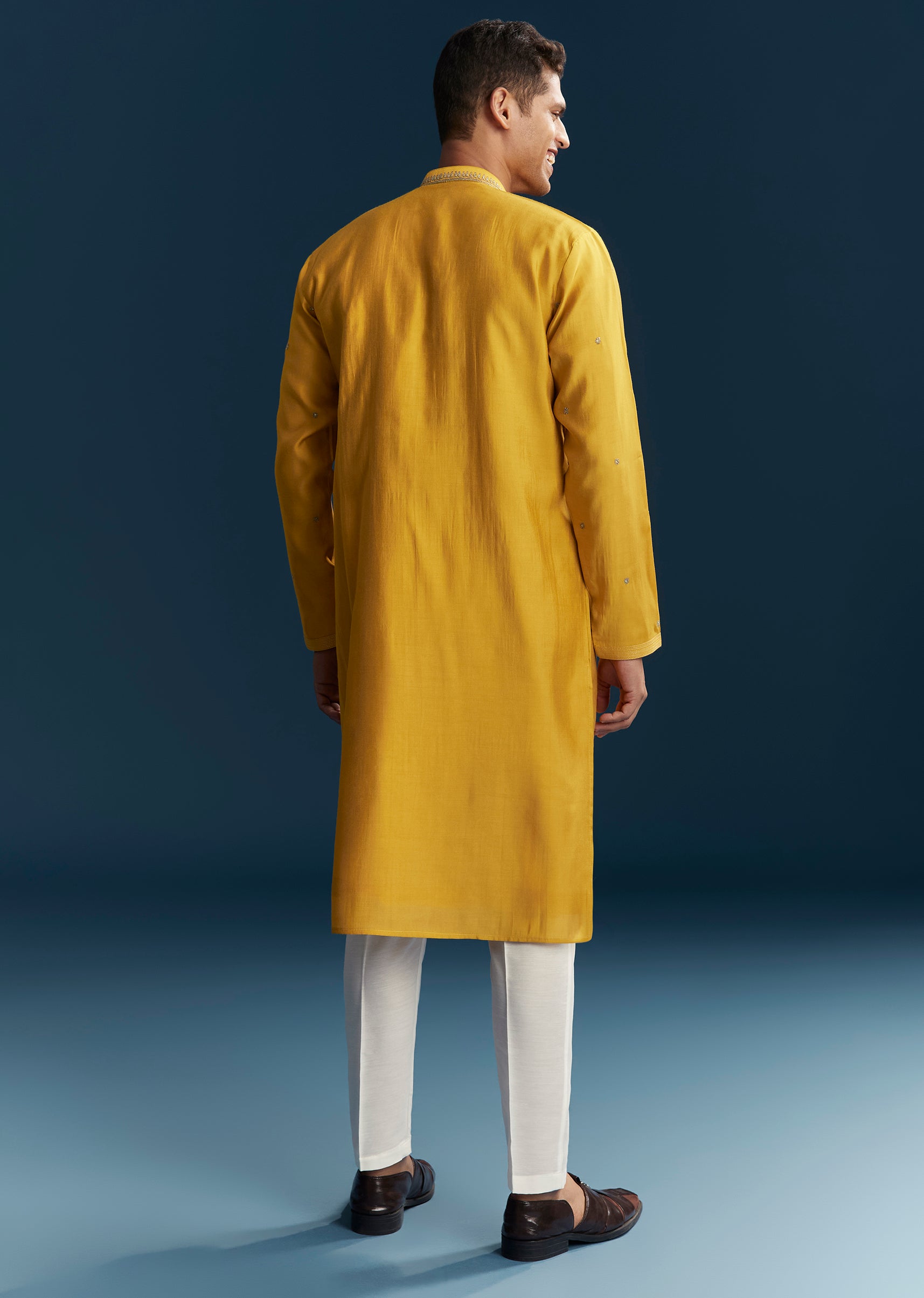 Mustard Yellow Silk Kurta Set With Thread Detail Work