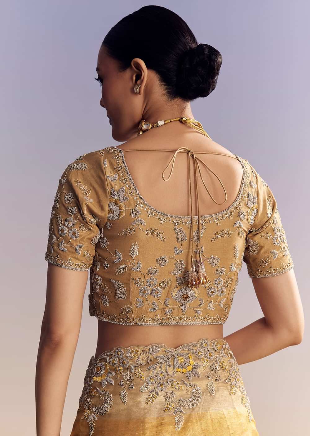 This mustard yellow tissue saree features a golden embroidered border crafted with zardosi, sequins, and cutdana work. Includes an unstitched blouse. Perfect pick for Engagements, Haldi, and Mehendi events. Awarded... More Product Details