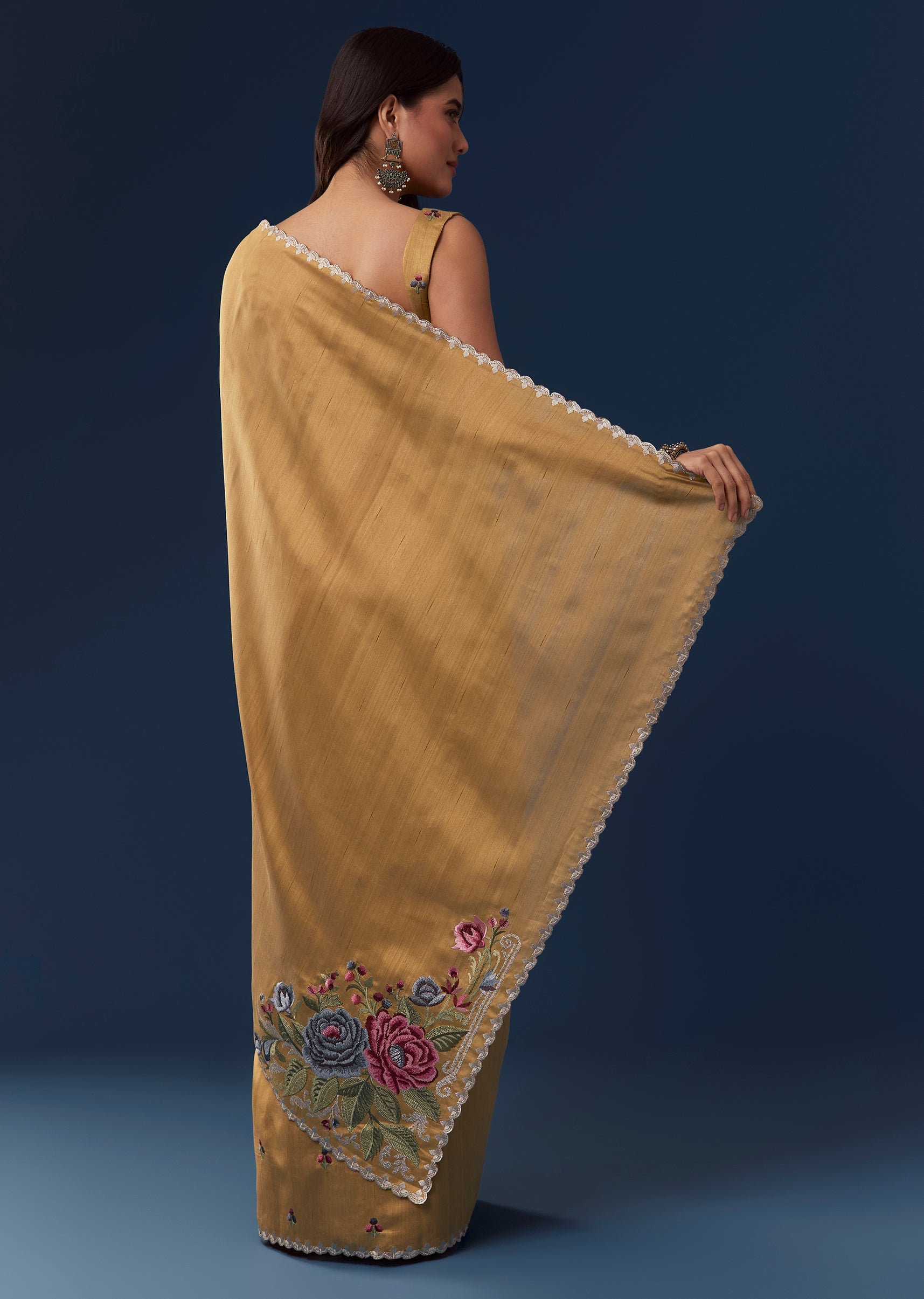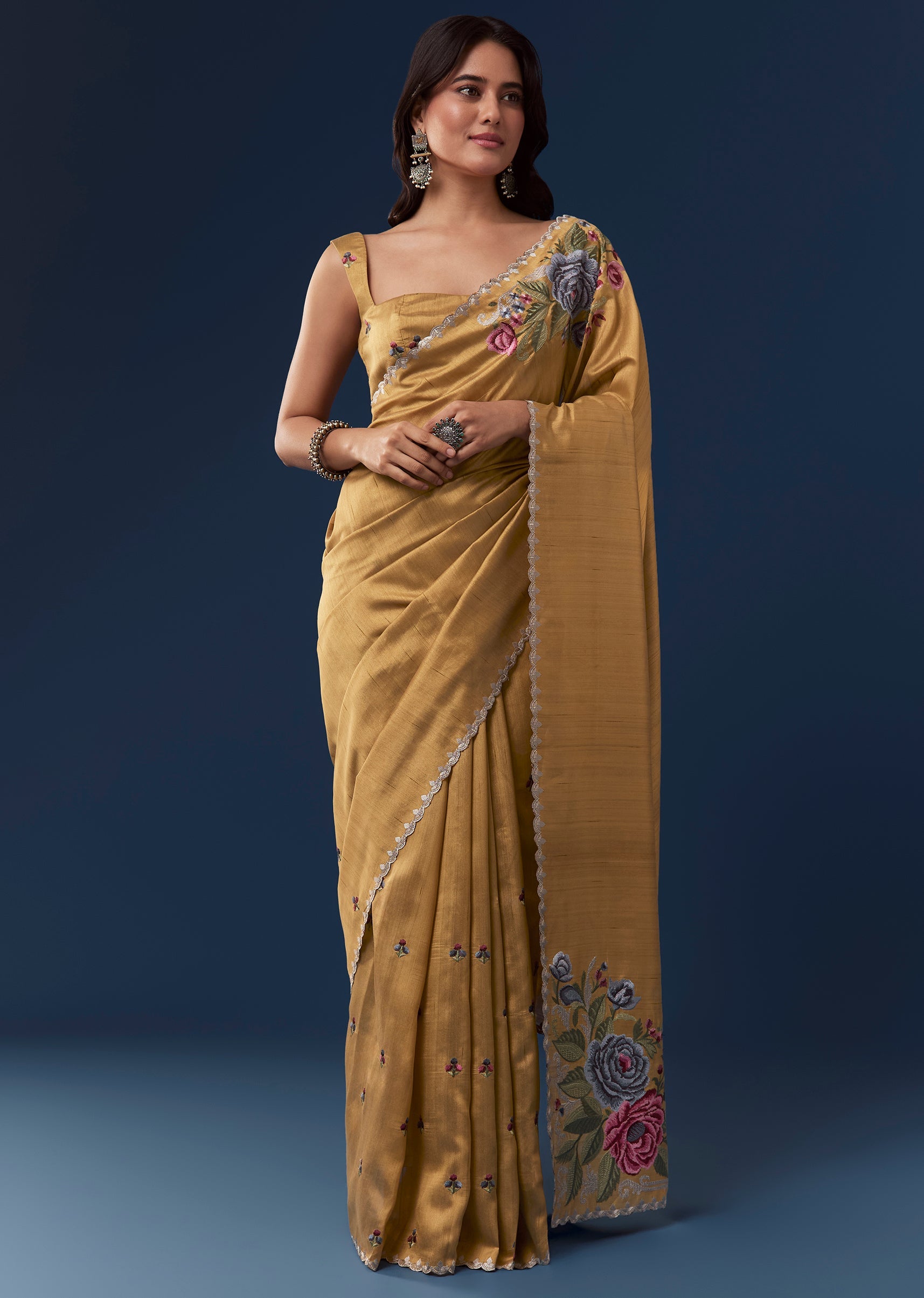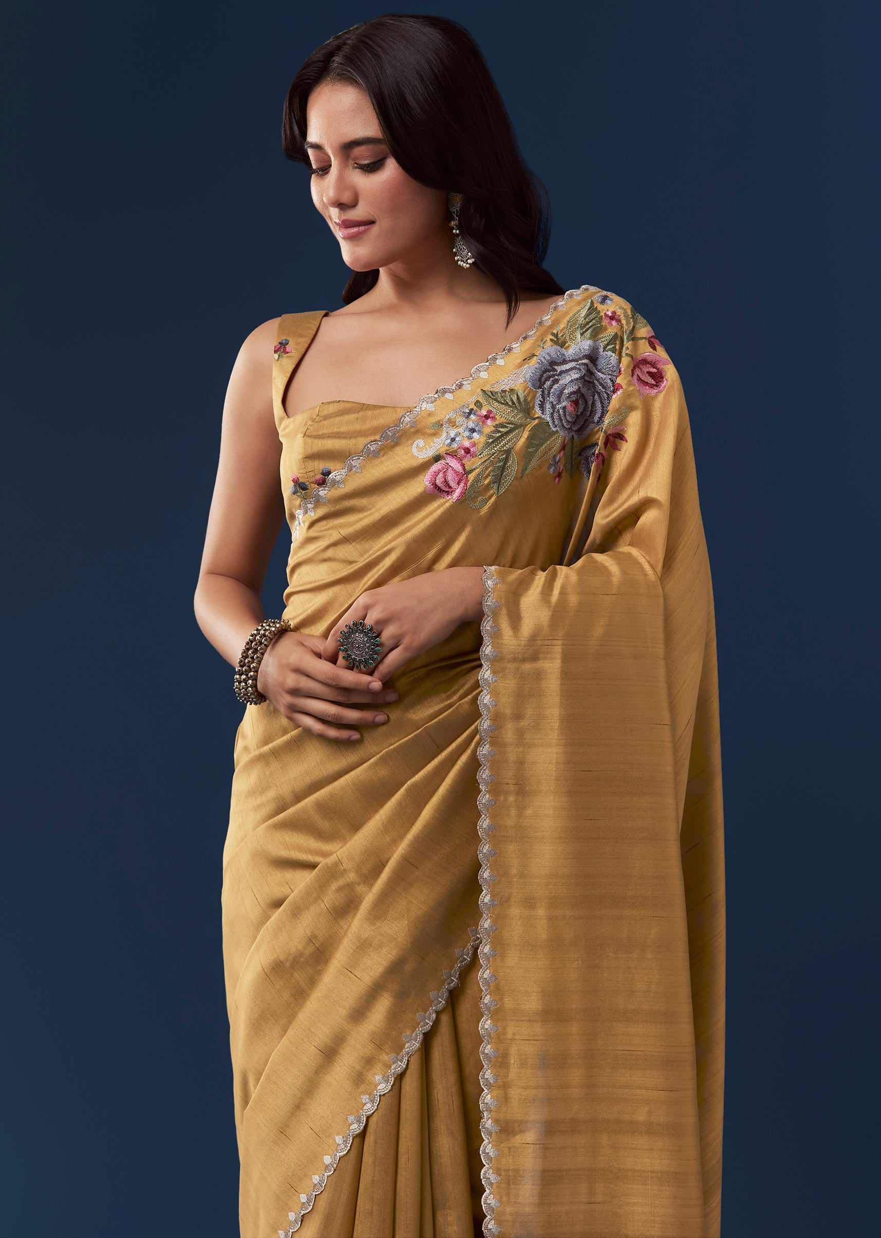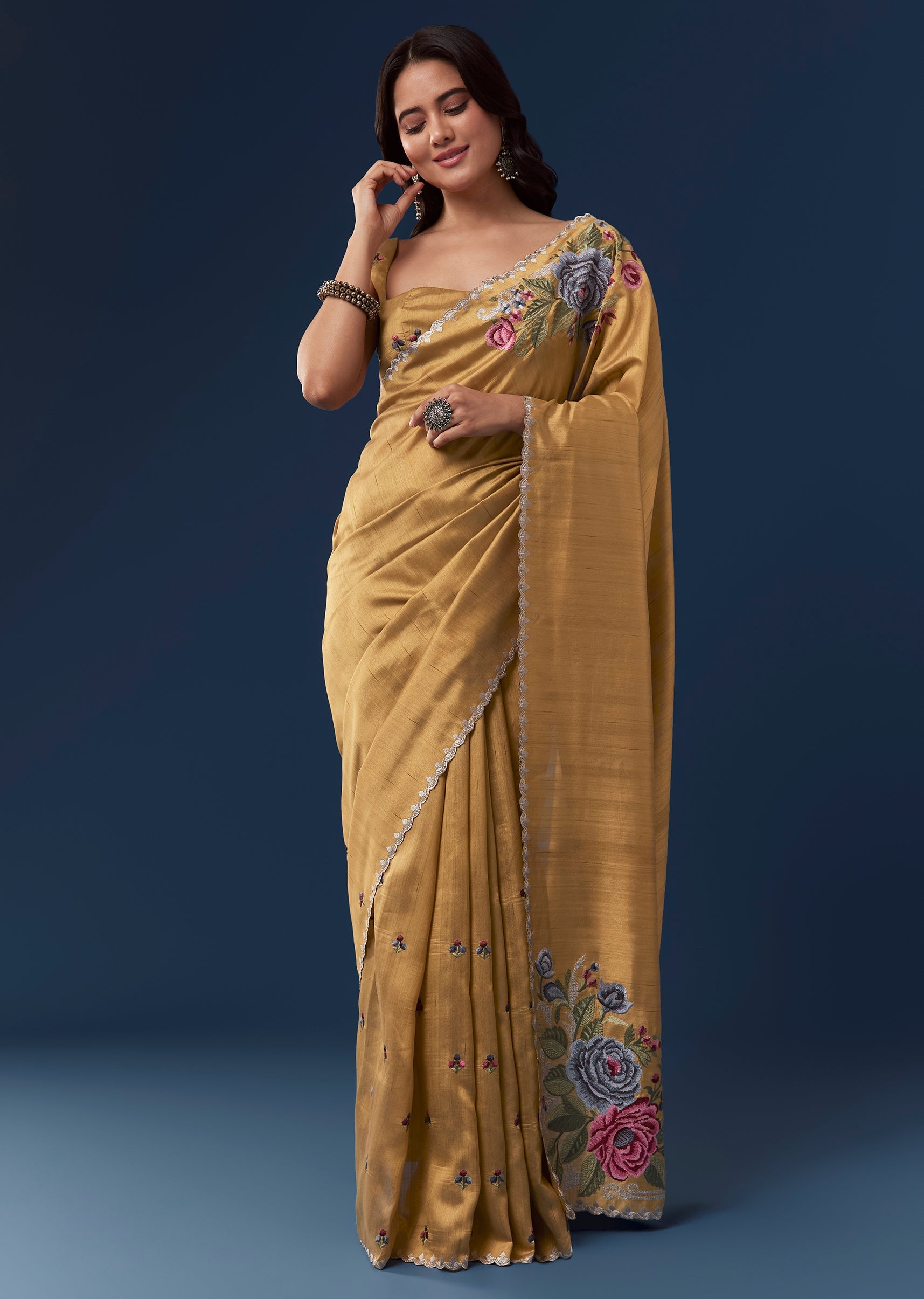 Mustard Yellow Tussar Saree With Scallop Border And Multicolor Floral Embroidery