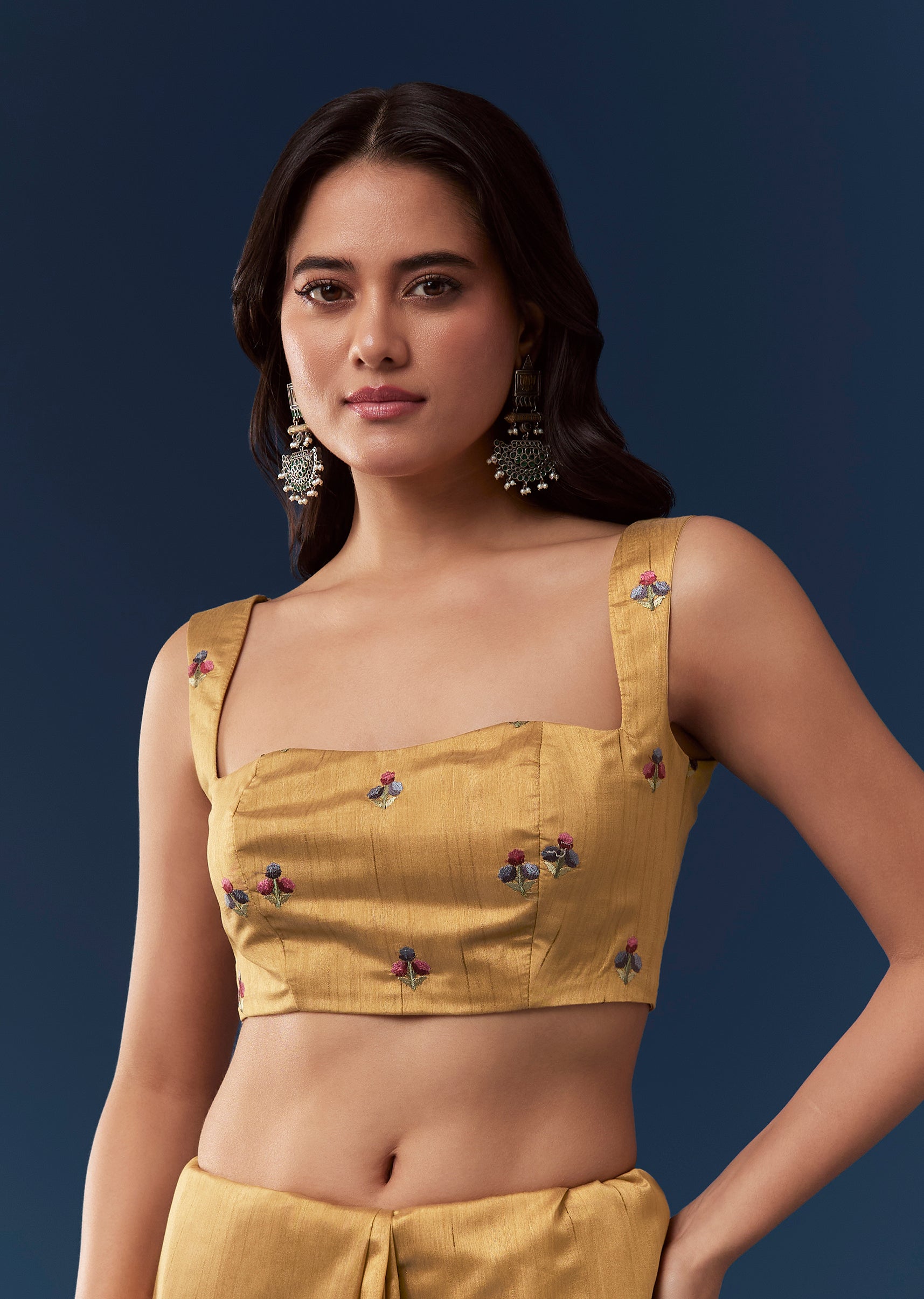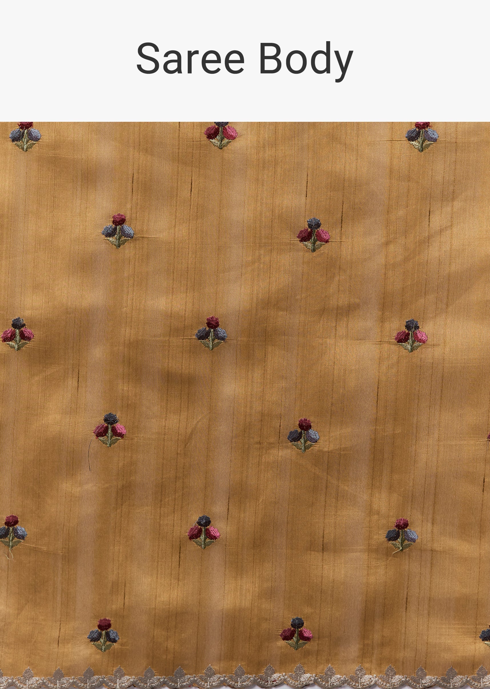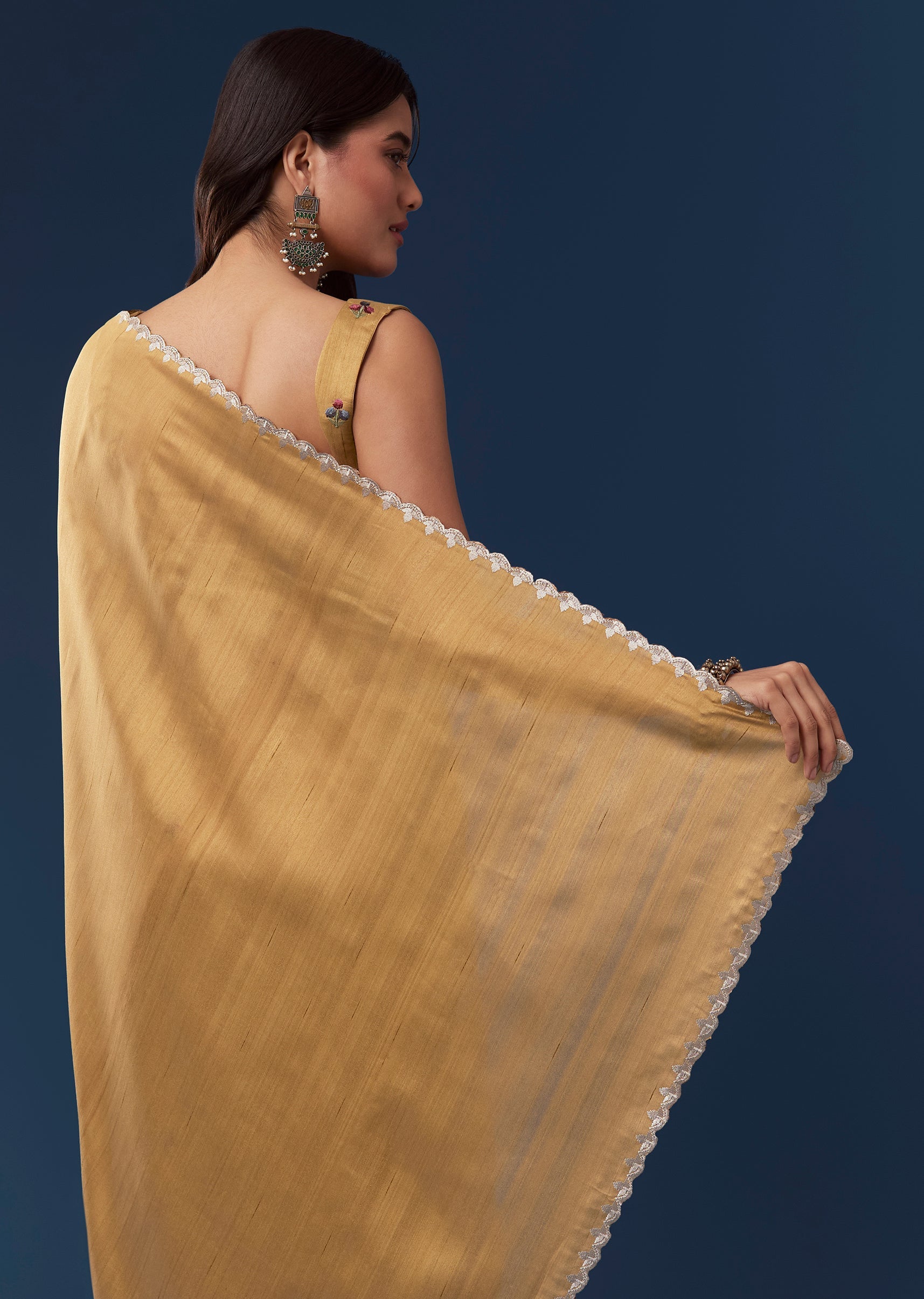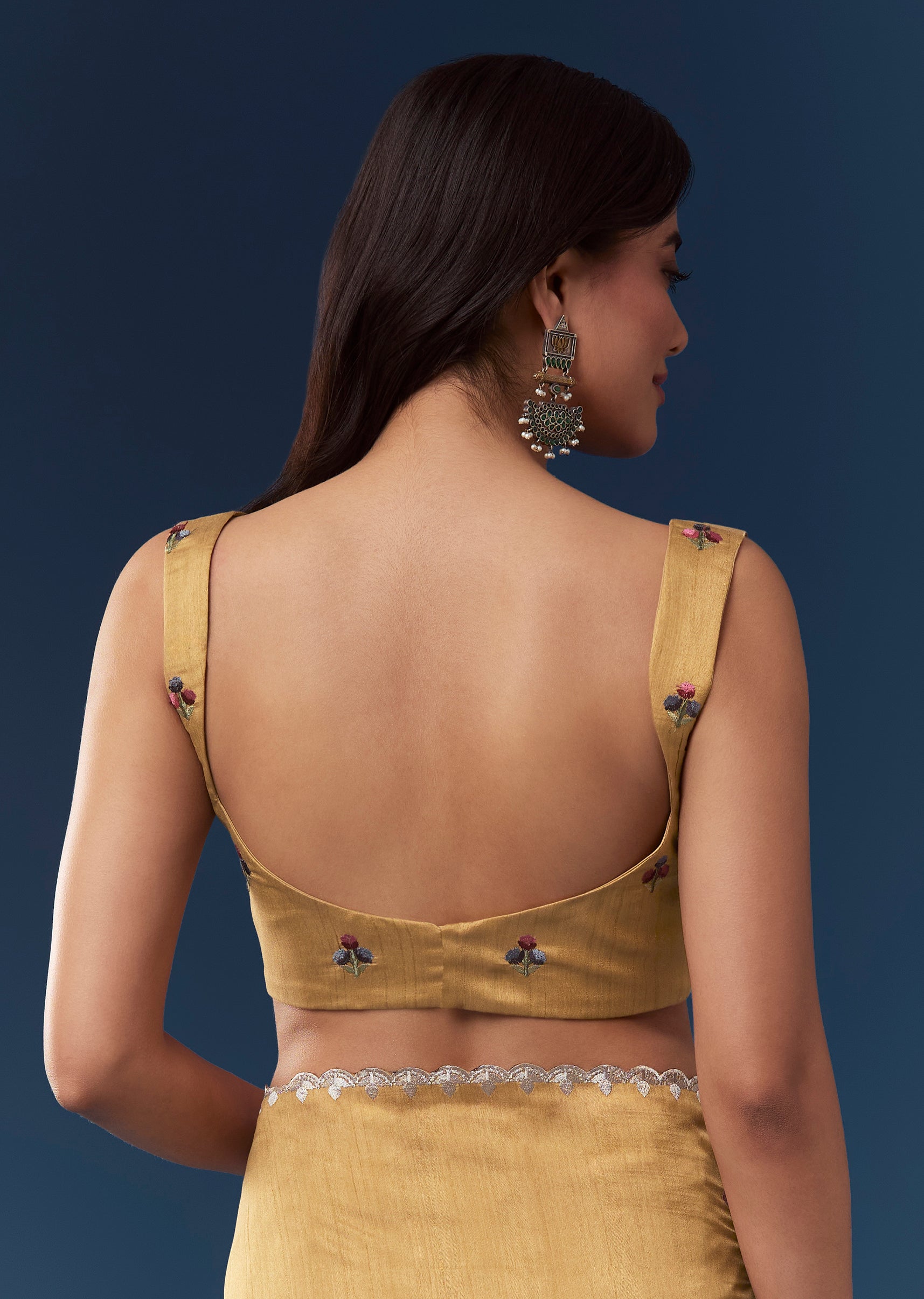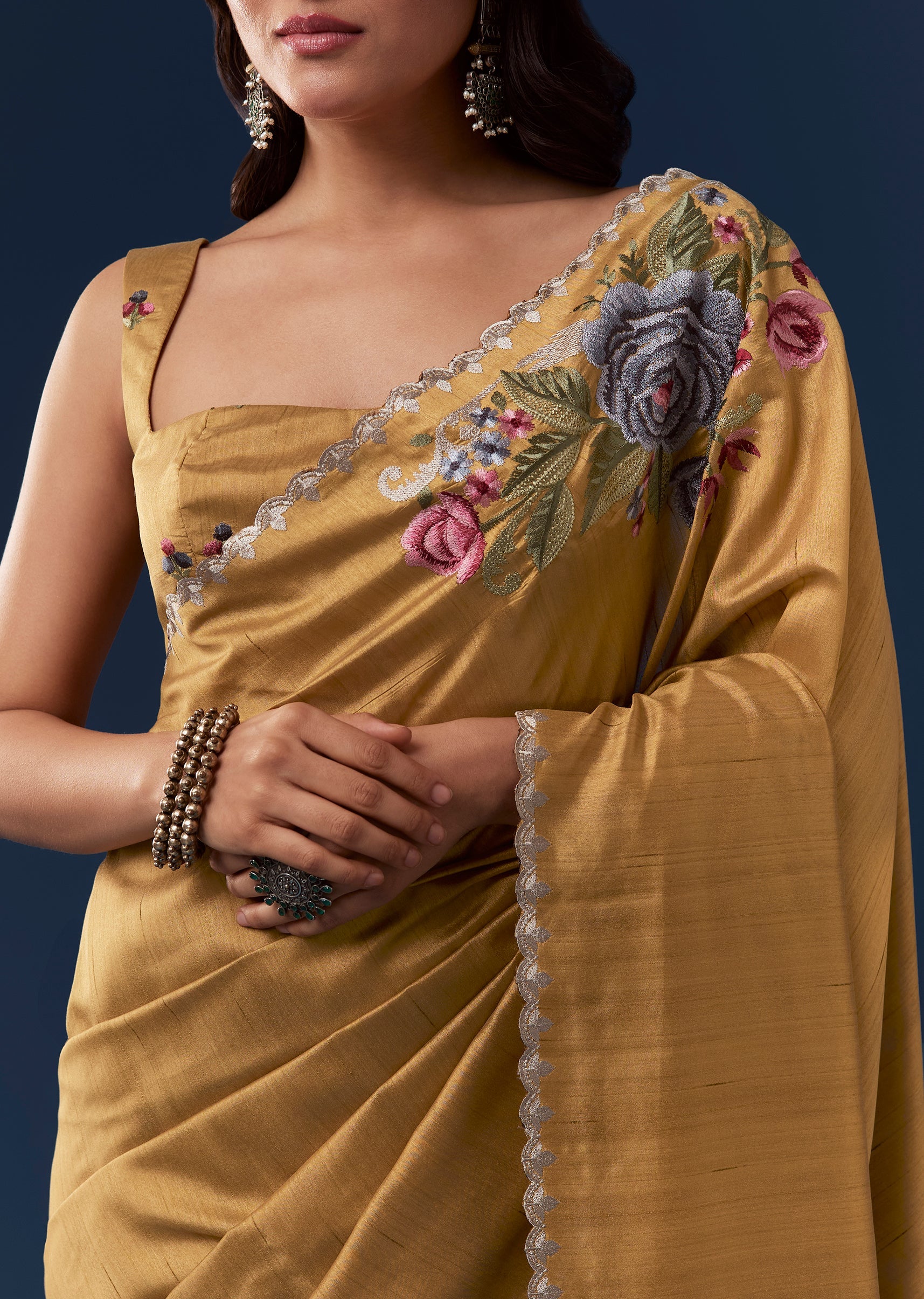 Mustard Yellow Tussar Saree With Scallop Border And Multicolor Floral Embroidery