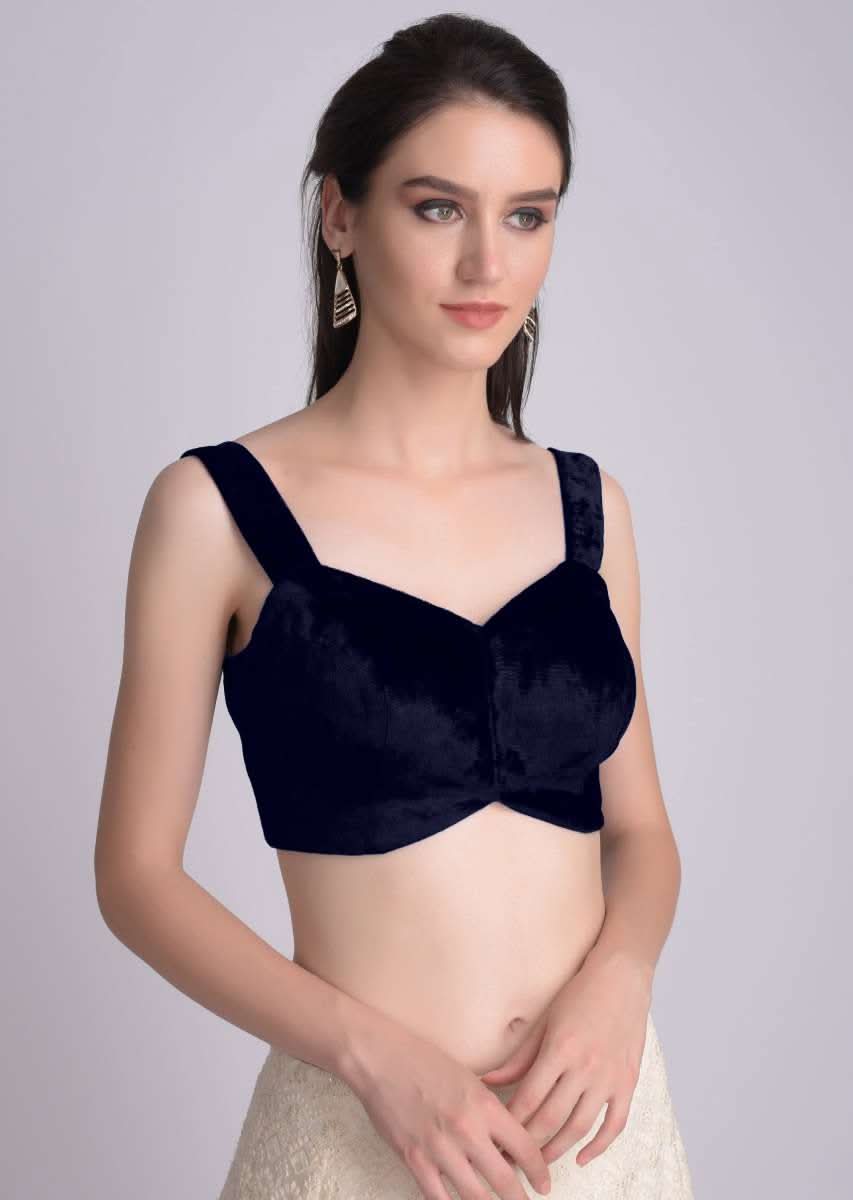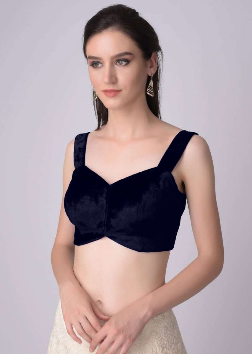 Navy blue Blouse In Velvet With Sweetheart Neckline And Curved Hem